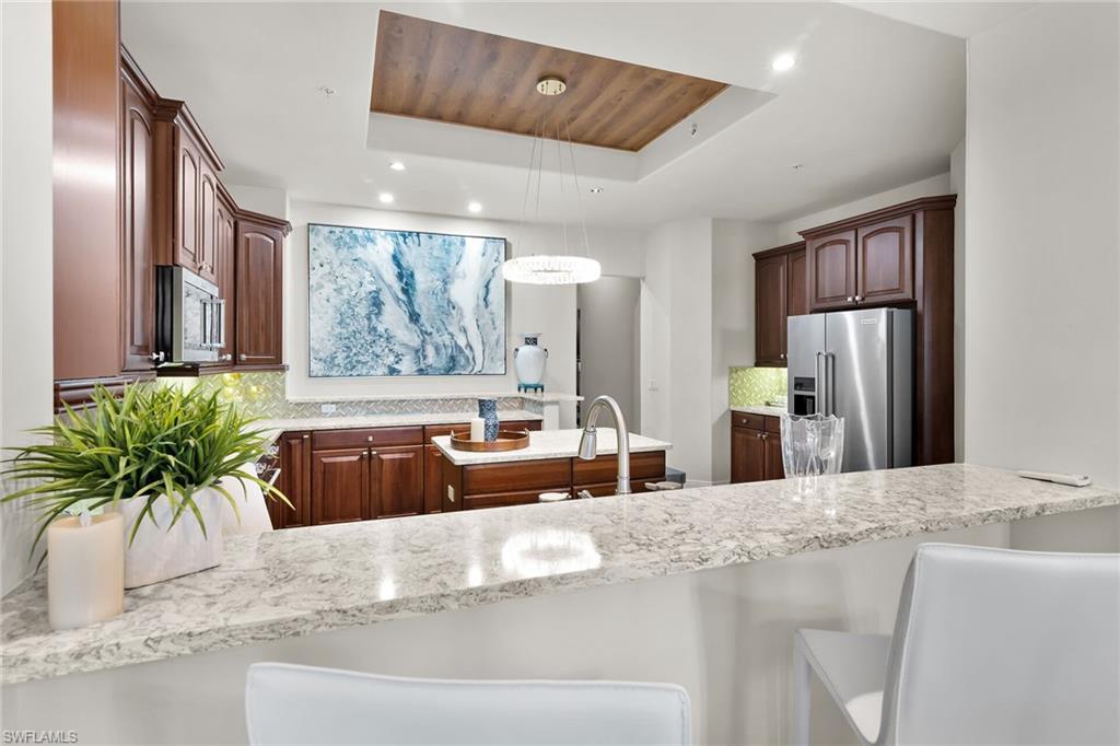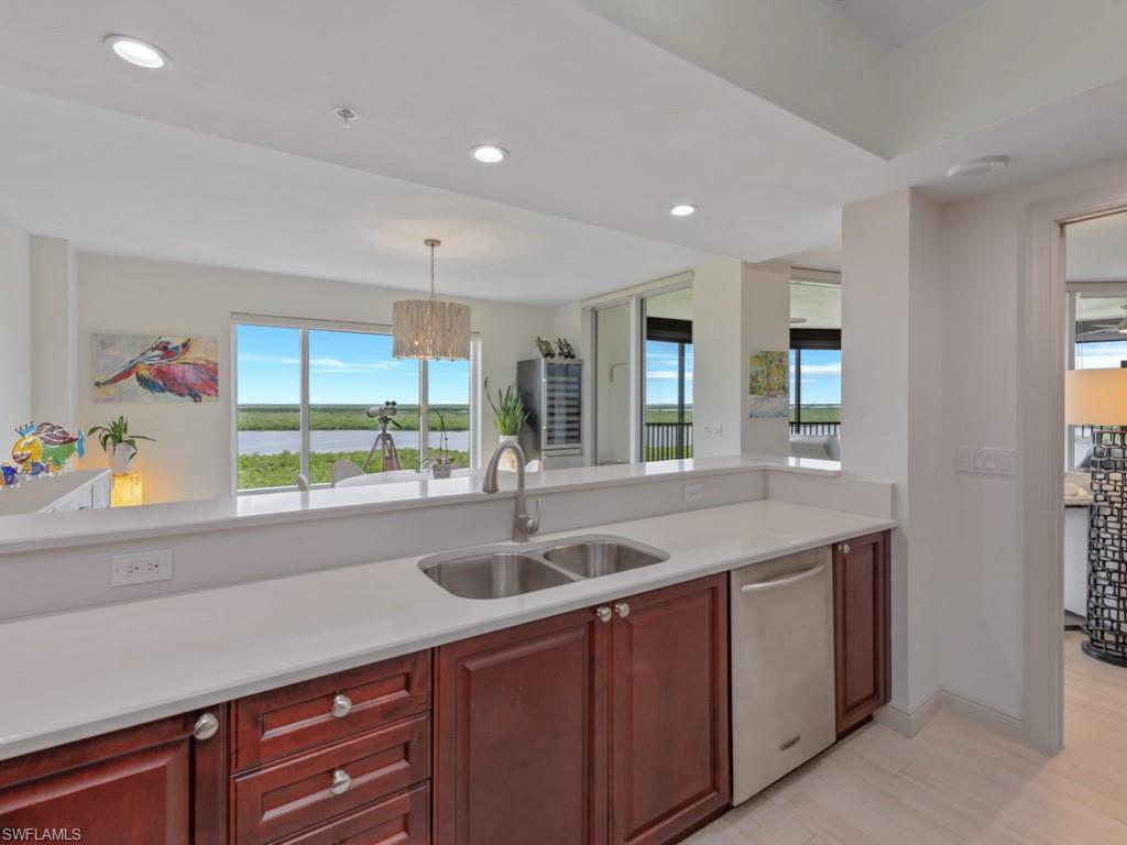 Aversana HOA Fees have just been reduced for 2026!! Welcome to the Aversana of Hammock Bay Golf & Country Club where exquisite luxury living meets jaw dropping views. This is high rise condo living on a whole new level. This updated 2,800 SF residence perfectly blends elegance, comfort and style & comes completely Turn-Key ready for you to move right in. Complete with everything you see, every inch of this home has been carefully curated to offer a living experience that exceeds expectations, with the finest materials like marble & hard wood floors, an open and airy layout & panoramic views of the 10,000 Islands that will take your breath away from every room. The grand entrance to the unit via your private elevator set the tone for the sophisticated retreat within. This spacious corner unit has 3-bedrooms, 3.5-bathrooms & an office with never-ending views that are sure to impress! The private owner’s suite is located on the east side of the residence with it’s own hallway, ample storage b/n the walk-in and 2 other closets & has its own patio entry just off the living room. The bathroom has dual quartzite vanities, crystal cabinet pulls, a soaking tub, shower & a water closet with pocket door. The kitchen & main living areas were redesigned & opened up to allow for more free flowing entertaining spaces & truly captivate the essence of the outdoor views from the second you step inside. It comes equipped with high-end appliances, floating shelves and a porcelain backsplash providing true function & modern design elements. The waterfall edge on the rare Quartzite kitchen counters make a bold statement to complete the look, all while adding timeless beauty. The living and dining areas seamlessly blend together and the custom built-in’s glass shelves provide a gorgeously framed backdrop for your TV. Just around the corner from the kitchen & off the living room, a mini bar cabinet was added to provide the perfect cocktail prep area for your sunset cocktails on the veranda. The 2 guest ensuites do not disappoint in any way - each are very spacious with updated bathroom vanities, plenty of closet storage & yes, incredible views abound here too! They are on the other side of the unit and each has privacy from the other, all while offering the same stunning panoramic backdrops this tower is known for. These 2 bedrooms share a veranda & your guests will enjoy impressive views out to the Gulf of Mexico, Isles of Capri, Marco Island & all the way to Naples. This residence doesn’t stop at its extraordinary interior; the Aversana Condo offers resort-style amenities designed to enhance your lifestyle. The pool is perfect for sunning and swimming, the new outdoor tiki bar & barbecue areas are designed for entertaining guests or simply enjoy a meal with family and friends in this beautifully appointed outdoor space. Whether you’re enjoying sunsets over the bay or relaxing by the pool, this unit provides the ultimate experience in SWFL luxury living.