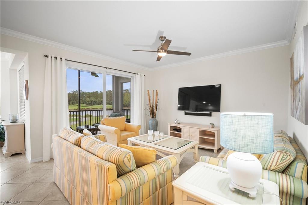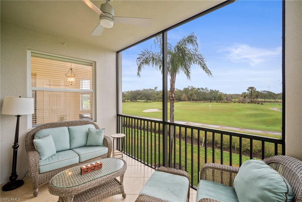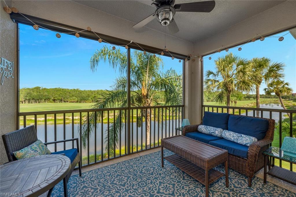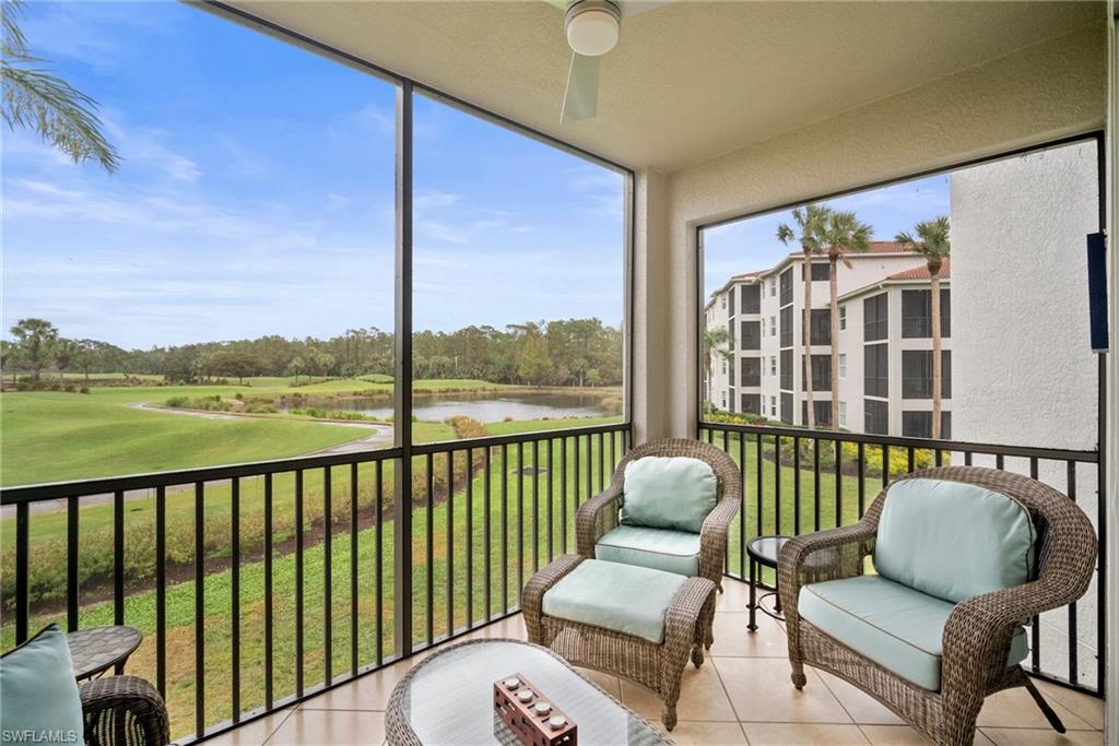Experience the ultimate in resort-style living in this fully furnished, turnkey two-bedroom, two-bath Brookside condo located in the Terraces at Heritage Bay Golf & Country Club. With golf, tennis, pickleball, fitness, social activities, and resort amenities included, this home offers exceptional value for buyers seeking an active, amenity-rich lifestyle in Southwest Florida. From the screened and tiled lanai you'll enjoy unobstructed panoramic views of the wide lake, golf course, and peaceful nature preserve. Watch golfers putt on the 14th green and tee off on Cypress 15, or take in the daily display of local wildlife that thrives around the lakes and preserve. Inside, this bright and inviting condo features impact-resistant windows and doors, a screened entry, stainless-steel appliances, a newer refrigerator, granite countertops, and updated lighting and fans. The layout feels open and comfortable, perfect for relaxing after a day on the course or hosting guests during season. Practical conveniences include easy access to the elevator or stairs, an exterior storage unit, and assigned covered parking just steps away. A nearby satellite pool offers added convenience for swimming and lounging. The building itself has been enhanced with fresh exterior paint and a newer roof for added peace of mind. At Heritage Bay, every day feels like a getaway. Residents enjoy 27 holes of championship golf, tennis and pickleball courts, a staffed fitness center, bocce courts, a resort-style pool, and an active calendar led by a full-time social activities director. Dine poolside at the Cabana, or unwind in the beautifully expanded Grille Room overlooking the course. This exceptional property offers more than a home; it’s a lifestyle upgrade in one of Naples’ most sought-after bundled-golf communities.