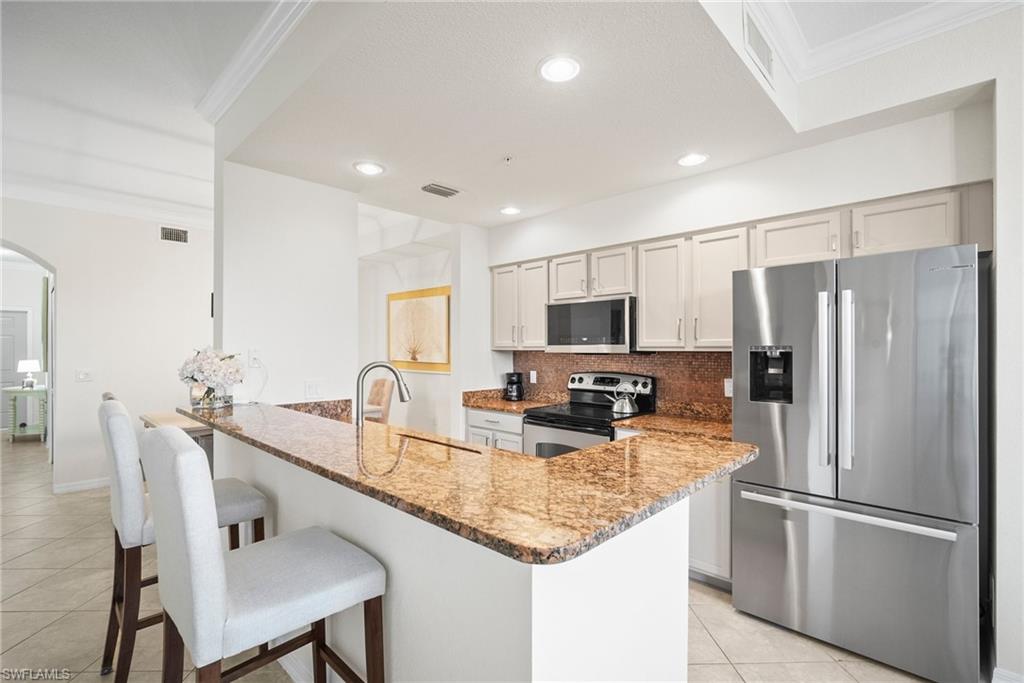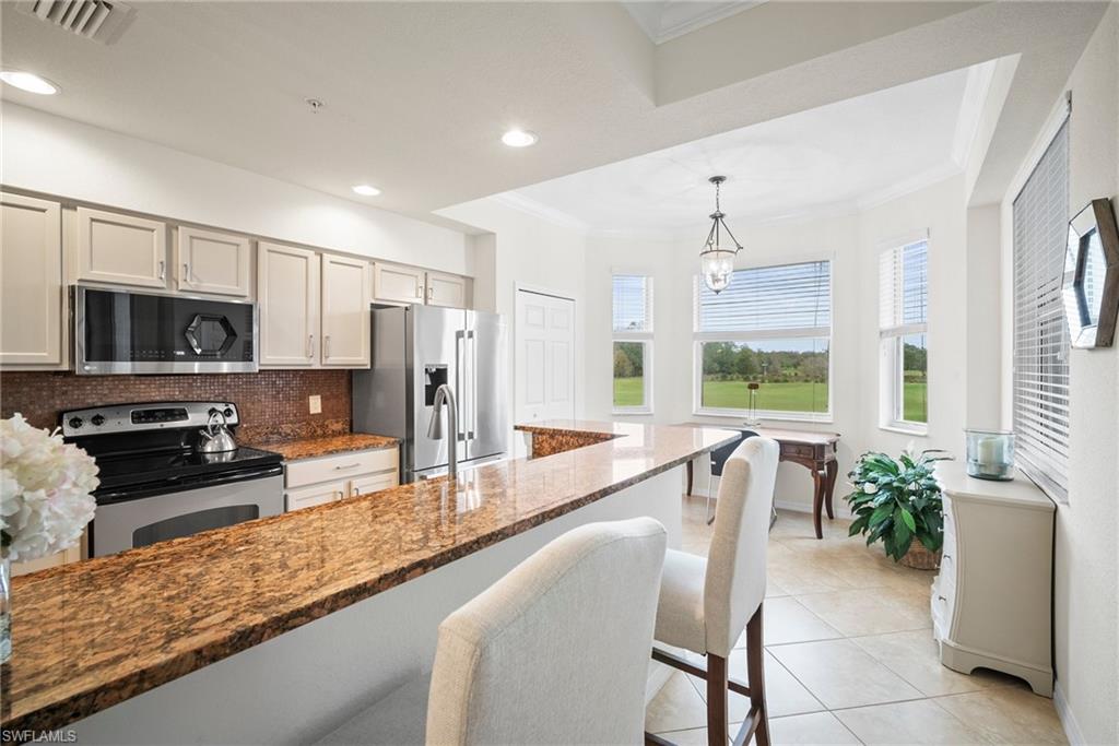 Priced UNDER last Brookside sale! Golf membership included! Nicely updated second floor Brookside model Terrace condo, with incredible view of the par 3 Cypress #13 green right out the kitchen window and back lanai. Well-maintained and in immaculate condition. All furniture is newer, and updates include light gray cabinets, granite countertops, new refrigerator, stove, & dishwasher; new bedroom carpets, and modern fans & fixtures. Heritage Bay is an absolute steal, and one of the nicest golf communities in Naples for a fraction of the cost of others. There is always something to do, with 27 holes of championship golf, multiple dining options including poolside 'Cabana' Bar & Grille and indoor/outdoor 'Grille Room', resort-style pool, standalone fitness center, 7 tennis courts, pickleball, bocce, a full social calendar and much more! Heritage Bay is surrounded by serene nature preserves as well. Come see what all the hype is about at Heritage Bay!