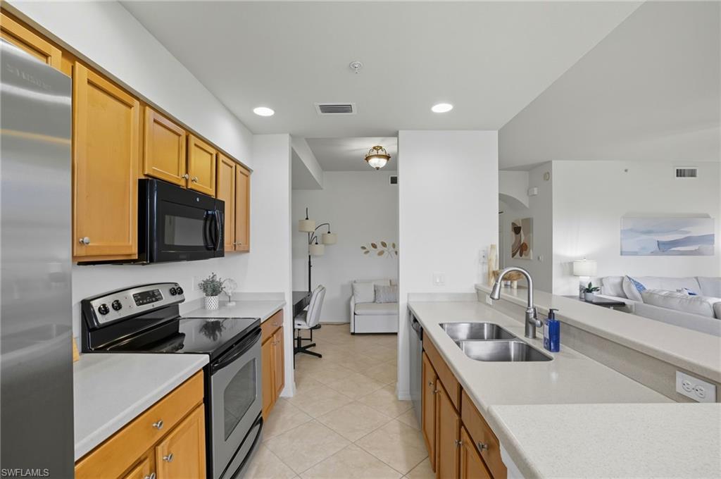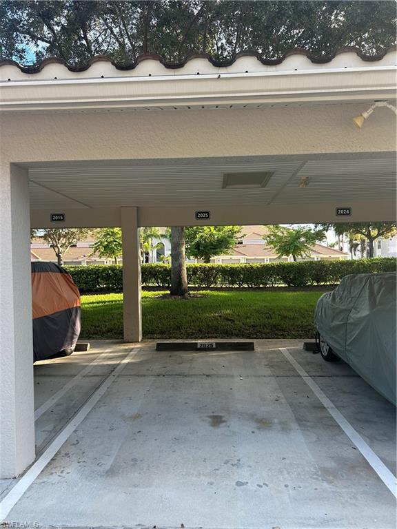 Welcome to the most attractively priced furnished condominium in Heritage Bay Golf & Country Club. This immaculate first-floor residence offers two bedrooms, two baths, a covered carport, screened in front entrance and a private storage unit. The smart layout features stainless steel appliances, shaker cabinets, and tile flooring throughout the main living spaces. Arrive with groceries or golf bags, and enter directly into your home without stairs or elevators. The convenience becomes instant gratification. The property is being sold furnished with turnkey items and shows exceptional care by its original owners. The kitchen stove appears barely used. Efficient 2019 air-conditioning system keeps electric bills impressively low. Relax on your screened lanai with unobstructed golf and nature views and enjoy quick access to the pool. Heritage Bay, Naples premier 27-hole bundled golf community, combines beautiful golf, a vibrant clubhouse, pickleball, tennis, resort pools, a state-of-the-art fitness center, dining and social events. It is the complete package for seasonal escapes or year-round enjoyment.