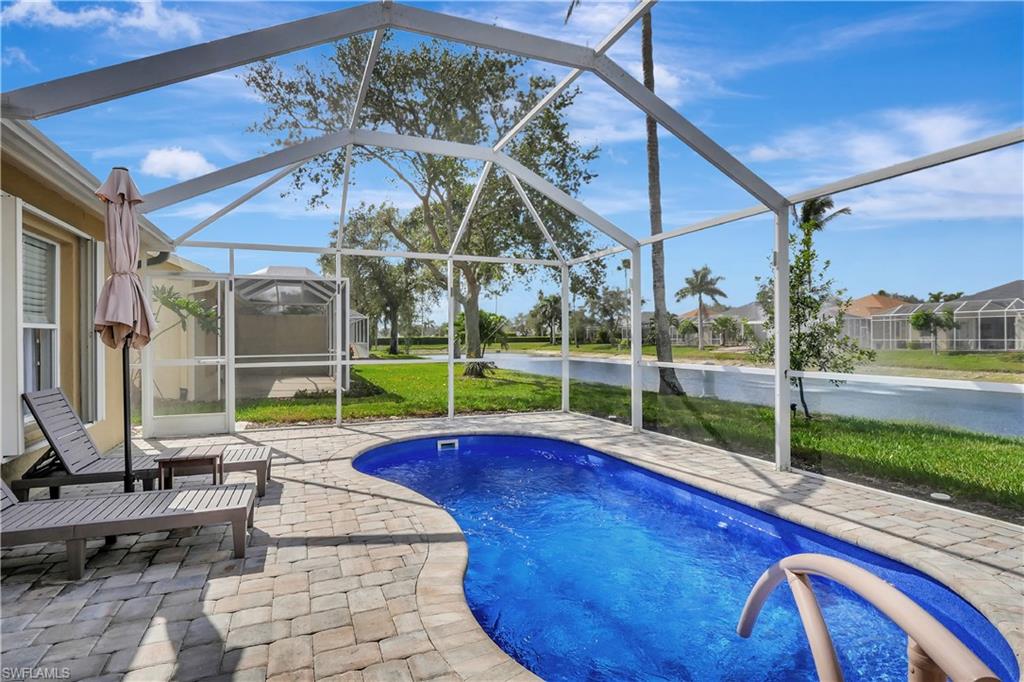 Presenting an exceptional pool home with water views located within the highly desirable gated community of Ibis Cove, Naples. This attached villa features a nearly new (2023) Latham Pool equipped with remote-controlled lighting, complemented by a spacious patio with elegant pavers and a recently enclosed lanai. Enjoy tranquil lake views, serene fountains, and stunning sunsets. The kitchen includes newly installed quartz countertops, a custom wine bar, stainless steel appliances, a modern tile backsplash, and a pantry for ample storage. A split-bedroom floor plan offers three bedrooms, two bathrooms, and vaulted ceilings, enhancing comfort and privacy. The primary suite boasts a luxurious bathroom with custom tiling, a frameless glass shower featuring a rain shower head, double sinks, and dual walk-in closets. Additional upgrades include a newly advanced air conditioning system with a smart thermostat, as well as a two-car garage outfitted with air conditioning and a work bench. Hurricane shutters are installed throughout the residence, including a hurricane-rated electric lanai screen, ensuring peace of mind. Enjoy resort-style amenities, supported by low HOA fees that cover cable, high-speed internet, lawn maintenance, exterior pest control, gated security, and access to superior facilities. Amenities include a heated pool and spa with sundeck, a spacious clubhouse offering a fitness center, billiards, card room, library, kitchen, tennis and pickleball courts, and a playground. The property is conveniently situated minutes from top-rated A+ schools, world-class beaches, and provides easy access to I-75. Premier dining and shopping are nearby at Logan Landings and Founders Square, with the historic 5th Avenue, fine restaurants, shops, and Naples Pier all within a short drive.