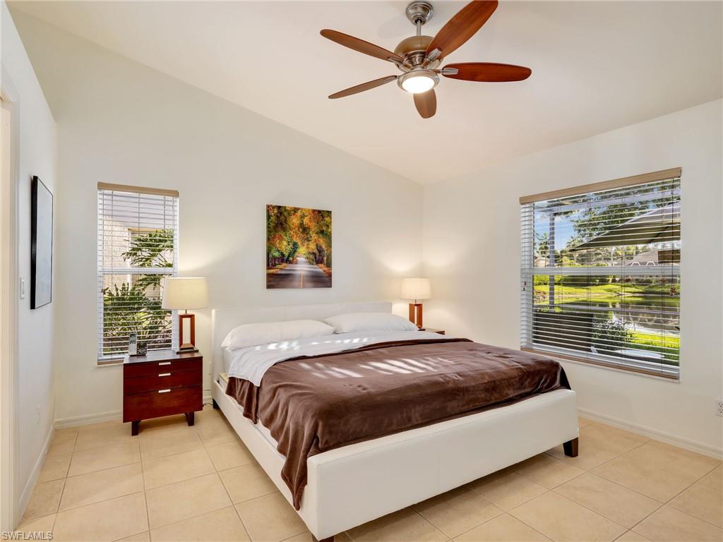 Welcome to this stunning 3-bedroom, 2-bath, 2-car garage lakefront villa that perfectly blends modern luxury with comfort. The residence boasts vaulted ceilings, neutral paint throughout, luxury vinyl plank flooring in main living area and bathrooms and a renovated kitchen with granite countertops. The living area has been extended and provides extra space for relaxation or entertaining with family and friends. In the master suite, you will find dual sinks, a large shower with built-in seat, plus his and hers walk-in closets. It also features a newer roof and AC installed December, 2017. All windows and sliders are category 5 hurricane impact windows, installed October, 2022. With a large lanai and breathtaking lakefront & 2 fountain views, you'll enjoy the ultimate indoor-outdoor living experience. This impeccably maintained property is nestled in the desirable Ibis Cove community, which spans 19 acres of serene lakes with illuminated fountains. The community amenities, including a clubhouse, community pool, spa, tennis and pickleball, billiards and fitness room which provides endless entertainment and relaxation possibilities. Nestled in a North Naples' top rated school district, your family will be in the vicinity of Gulf Coast High School, Oakridge Middle School and Laurel Oak Elementary. Close to shopping, dining and beaches, this home is a serene retreat or perfect family home in a prime location. Don't miss out on this fantastic opportunity to live the ultimate Naples lifestyle! Ibis Cove has one of the lowest HOA fees in Naples! Exterior freshly painted 7/2025, included in HOA fees.