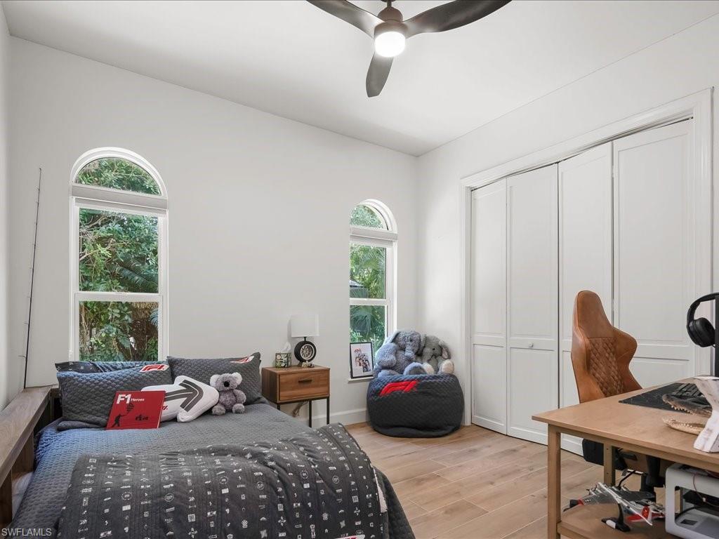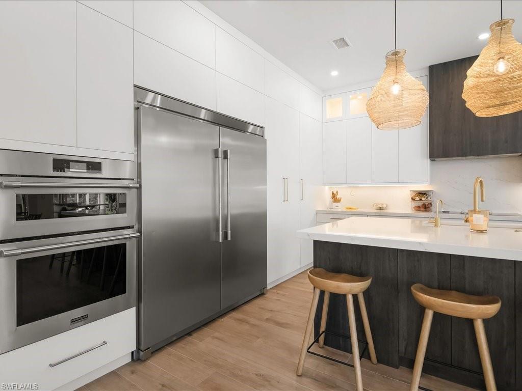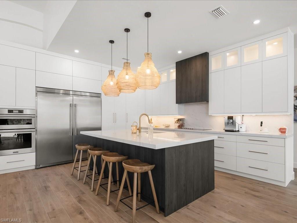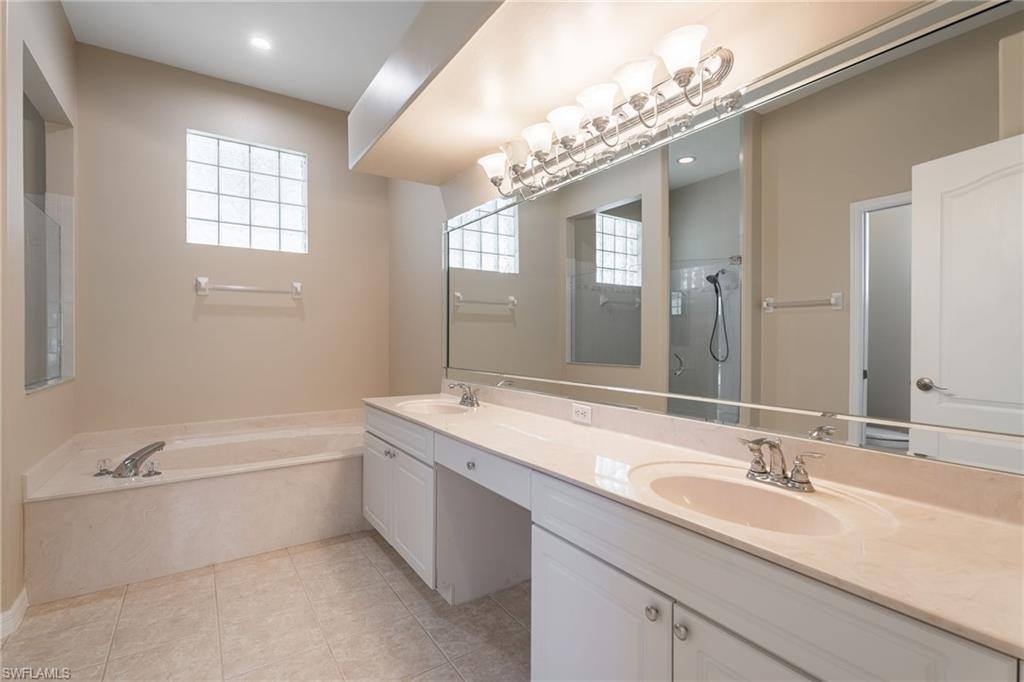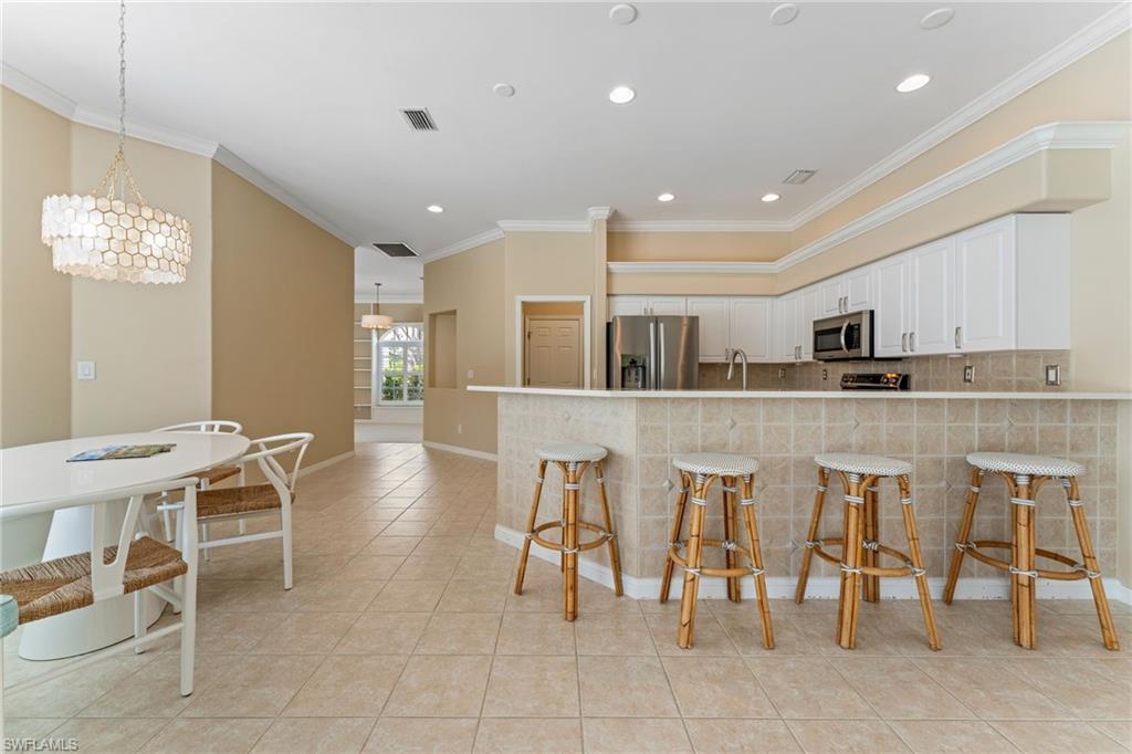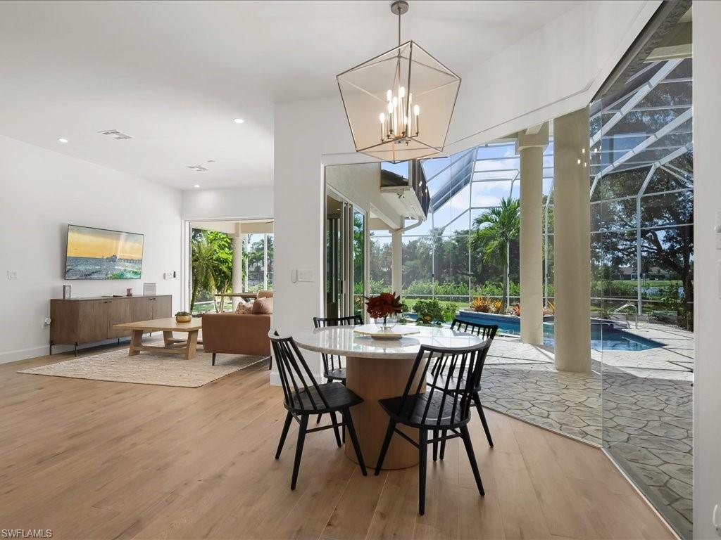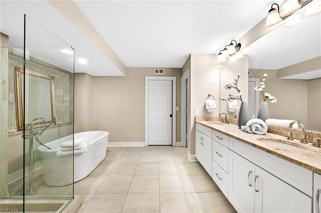 Located in the prestigious neighborhood of Imperial Golf Estates in North Naples, this modern center hall two story home is stunning, move-in-ready, with high end finishes throughout. Rarely available 3 car garage is oversized as well. The large lot is in a quiet section and has a completely fenced in rear yard. This open and spacious floor plan encompasses over 3,300 sq ft and has luxurious wood and travertine flooring. A gourmet kitchen features a large granite eat-in island custom wood cabinetry, and stainless-steel Kitchenaid appliances. It is open to a huge family room with casual dining and custom built-ins. Architectural designer accents and crown molding are found in most rooms. Beautiful views of the lake are seen from several areas of this home with the second-floor family room loft allowing the enjoyment of colorful sunsets. The Owner’s suite has an all new bath with beautiful shower, separate soaking tub and dual vanities. Designer cabinetry adorns the walk-in closet, and a separate shoe cabinet is built-in the bedroom. 3 more bedrooms share a well-appointed bath upstairs while the enclosed den downstairs can be easily converted to a 5th bedroom next to the third bathroom. The two-story entry foyer is impressive with tons of light and a lovely chandelier. The lanai has ample room for conversation and dining. The salt-water pool has an electric heater too! Walls of glass allowing for viewing the rear yard from kitchen, casual dining and the family room, blending outside to the inside naturally. A dedicated laundry room includes a granite folding area and hooks for backpacks or tote bags. Another big extra is the 3-car garage with extra storage cabinetry making this a great value. Close to a multitude of shopping, dining, parks and Naples’ white sandy beaches. A rated school district as well.