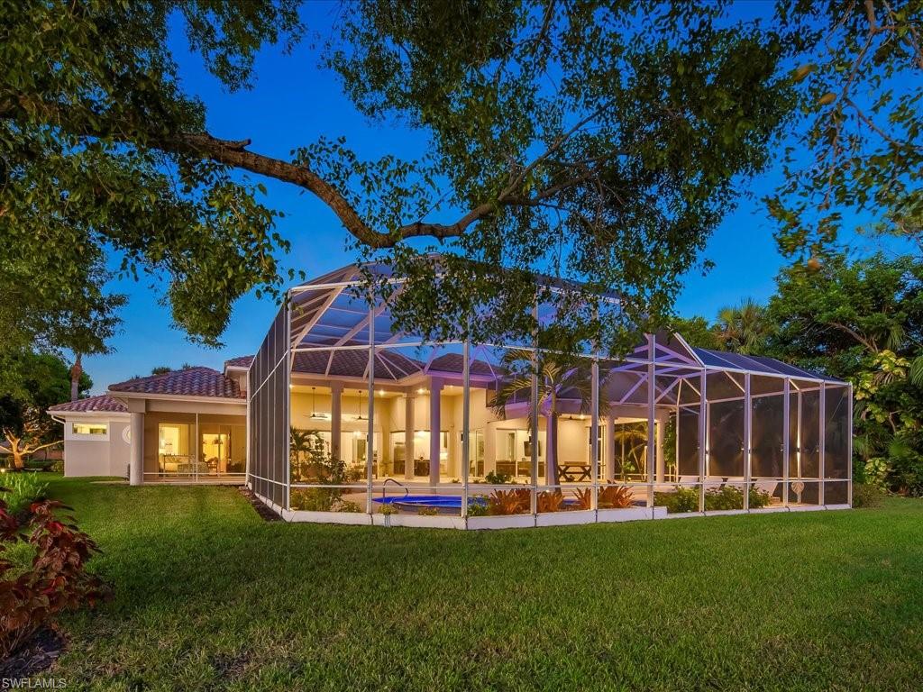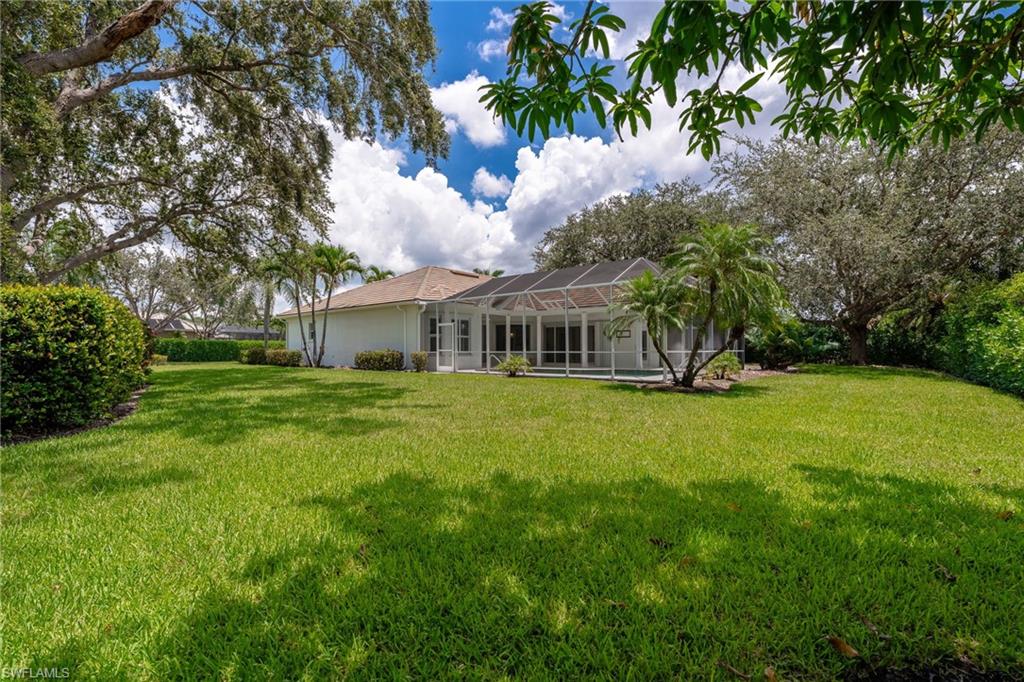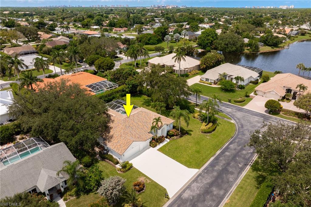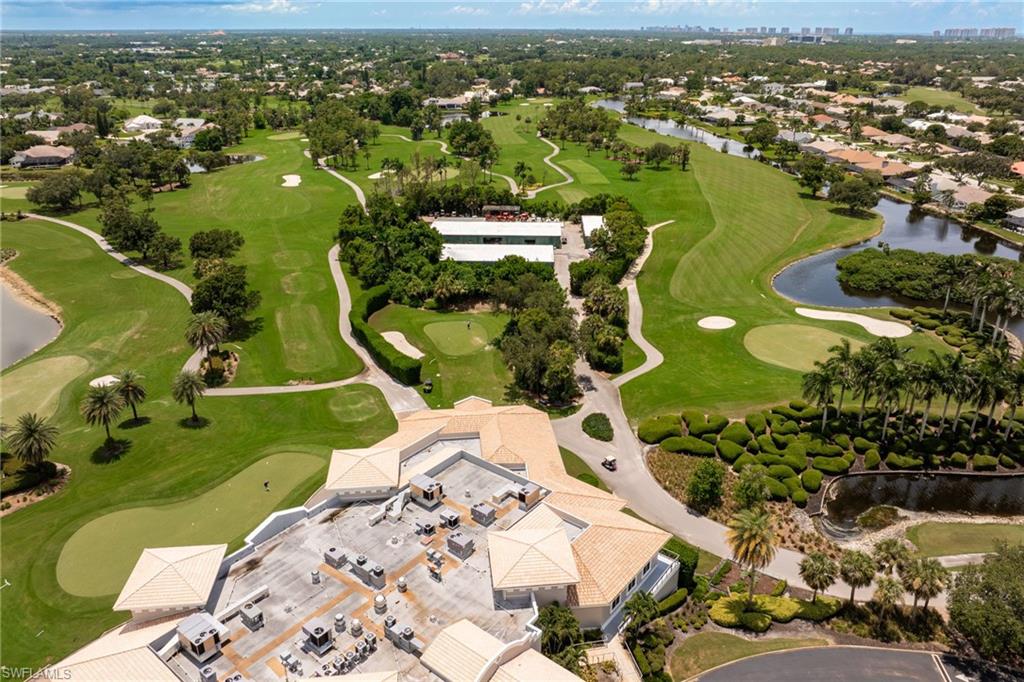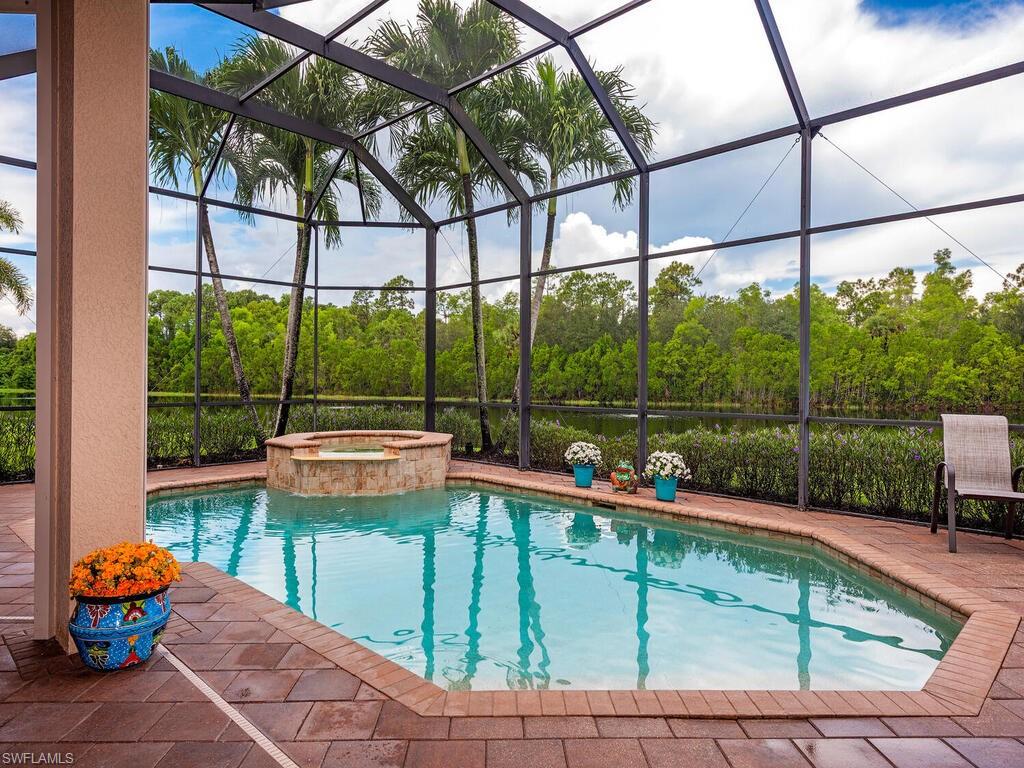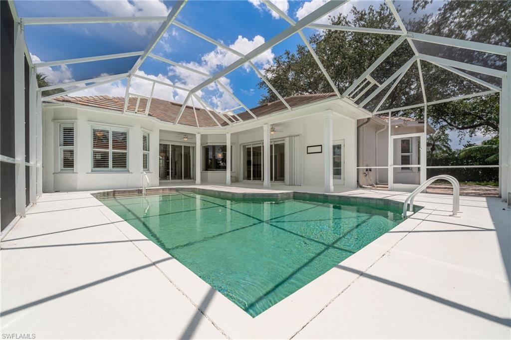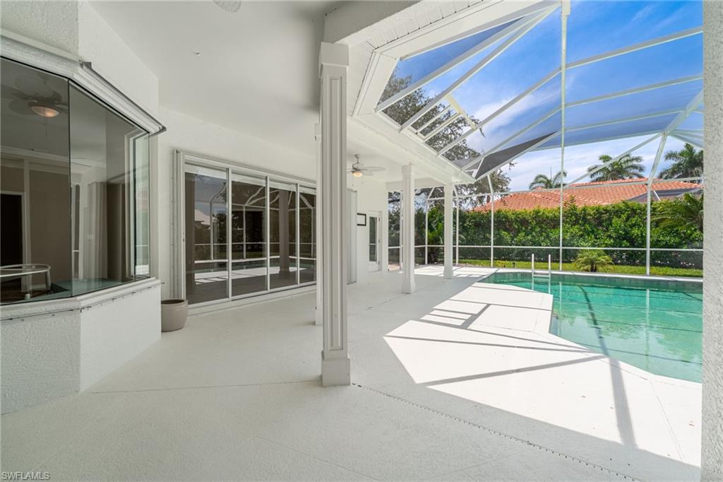 Unique & Rare opportunity .61 over half acre lot with golf & water views!! Take note most lots are only .30. Discover a harmonious blend of sophistication and serenity in this beautifully updated home. Be sure you click on Lifestyle video. The nearly 3,000 sq ft residence boasts breathtaking views of the lake and golf course. The inviting courtyard entrance makes a lasting first impression from the moment you arrive, setting the stage for the elegance that awaits inside. The grand entryway leads to the thoughtfully designed layout that is prime for entertaining and privacy, where every space exudes warmth and intimacy, from the formal living and dining rooms to the inviting family room with a cozy fireplace. A wet bar makes entertaining effortless, while the spacious kitchen inspires culinary creativity. Updates abound with wide-panel maple hardwood floors in every bedroom, custom porcelain and granite tile in the office, fully renovated bathrooms, a brand-new AC, and stylish recessed LED lighting with updated fixtures in the kitchen and baths. Three generously sized bedrooms, 2 1/2 baths and a versatile office space are strategically positioned for optimal privacy. The primary suite boasts a beautifully updated ensuite bath with a freestanding soaking tub, dual sinks, and a separate shower. Outdoor living is just as impressive. A sprawling screened lanai offers multiple lounging and dining areas, all overlooking the oversized pool. Recent updates—including brand-new tinted screening, a paved deck, and lush landscaping—enhance the ambiance of this serene retreat. Ideally located just minutes from Gulf beaches, shopping, and fine dining—with easy access to both US-41 and Livingston Rd. This exceptional home offers the perfect balance of tranquility and convenience. Schedule your private showing today!