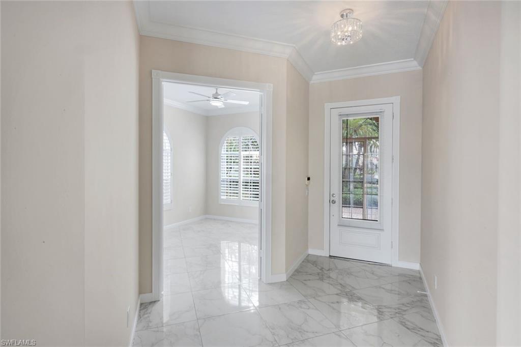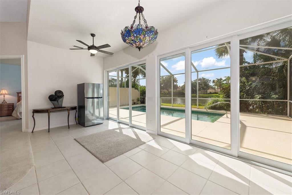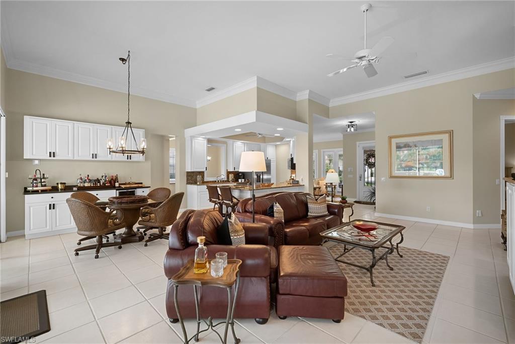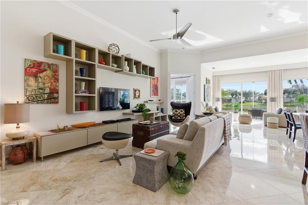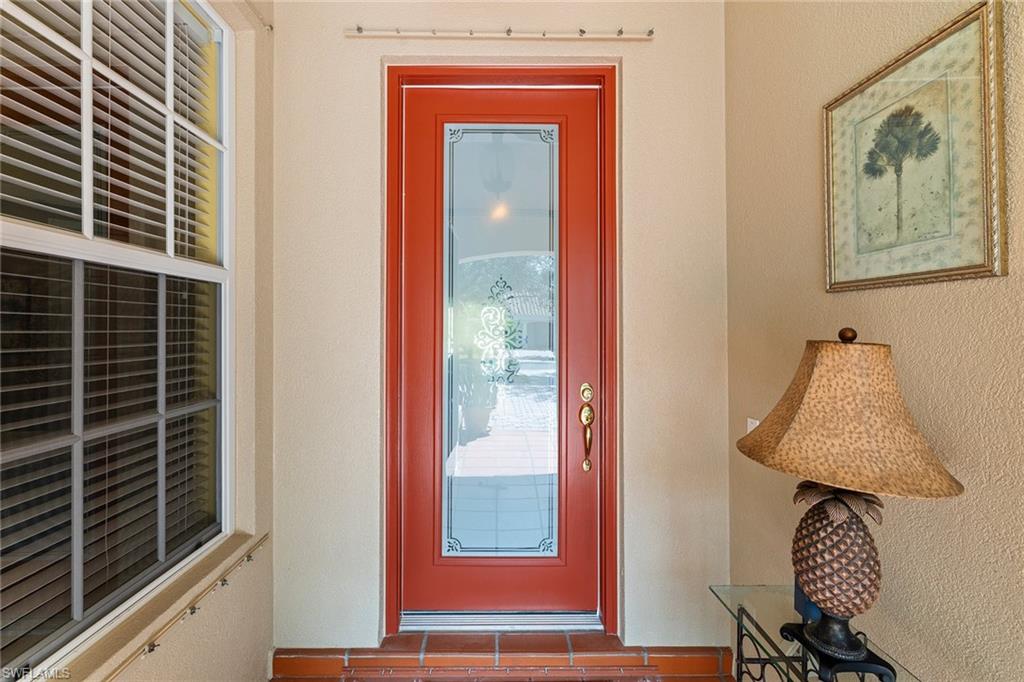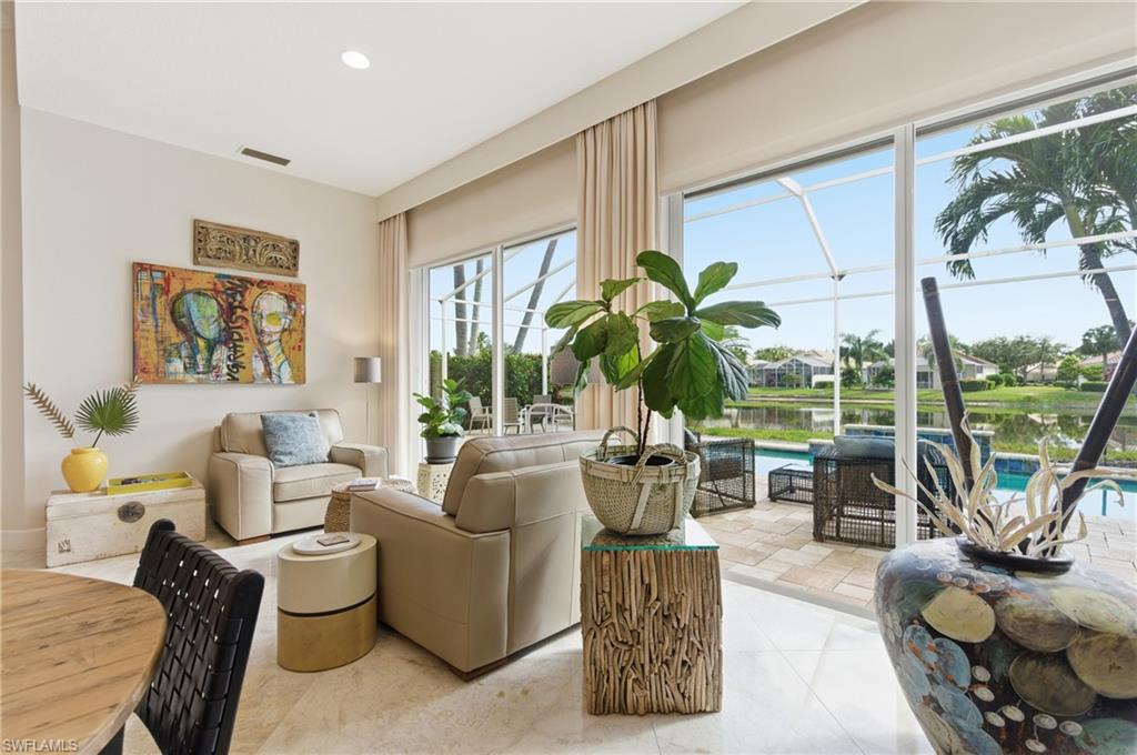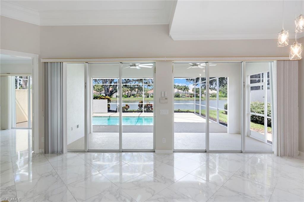 This gracious Island Walk home is the extended Carlyle model, boasting 2687 sq ft of living space under air. Walk in the front door and be blown away by the expansive feel of the 12 ft ceilings with a view through the house to the pool and lake beyond. The home has an open concept kitchen/family room with new cabinetry and counter tops, and contemporary built ins; large format polished travertine tile flooring throughout; custom window treatments; custom salt water pool and lanai with a lovely southern exposure lake view; meticulously maintained landscaping; spacious front porch, freshly painted exterior and a brand new roof. Together with its 4 bedrooms, 3 upgraded baths, as well as formal living and dining rooms - the layout of this home is flexible to meet all of your needs and beyond. Accordion and electric storm shutters make hurricane prep a breeze. Garage has built in storage and an epoxy coated floor. Warm and inviting with many luxury finishes, this lovely home is beautifully appointed with high end furnishings, which are available to purchase, if you desire. It’s a must see! Residents of Island Walk enjoy a large town center offering many amenities as well as hair & nail salon, post office, gas station, car wash, fitness center, resort and lap pools, pickleball, tennis, bocce, a putting green, and a very popular restaurant. Conveniently located near beaches, shopping, restaurants and everything Naples has to offer.