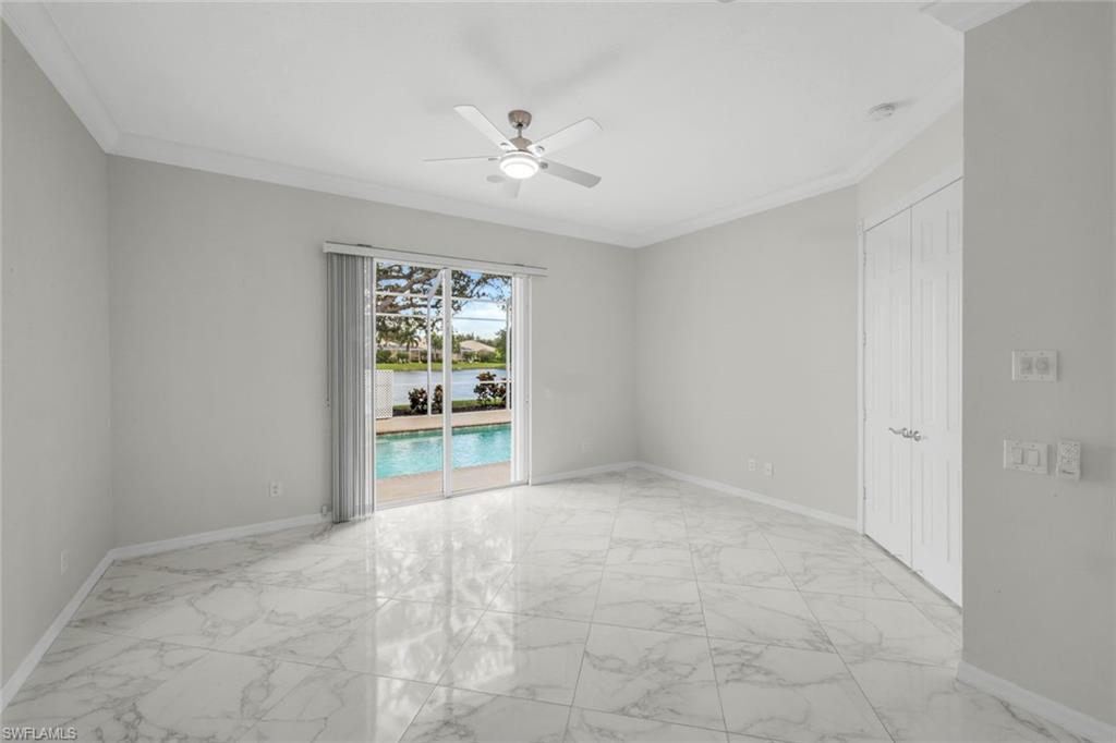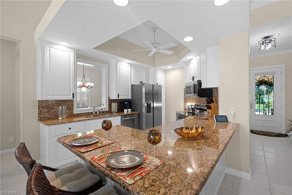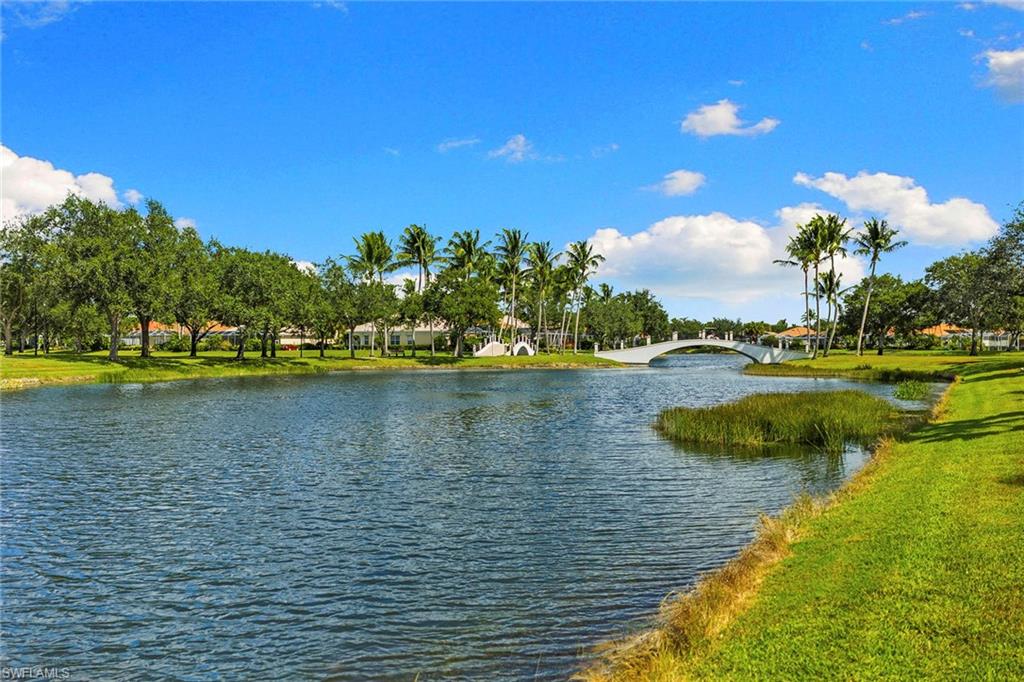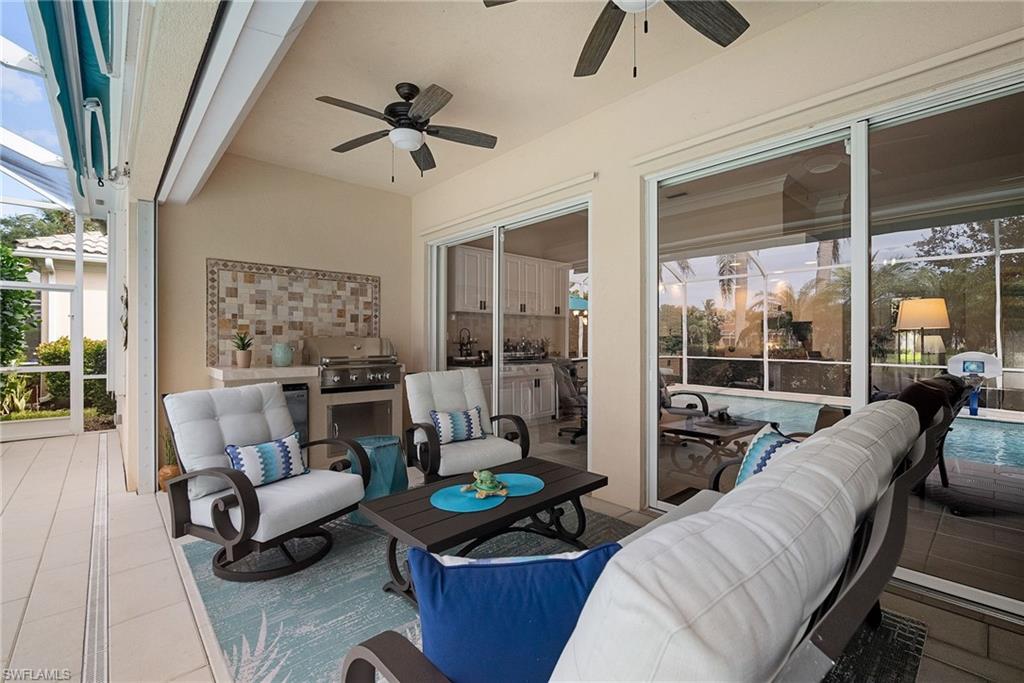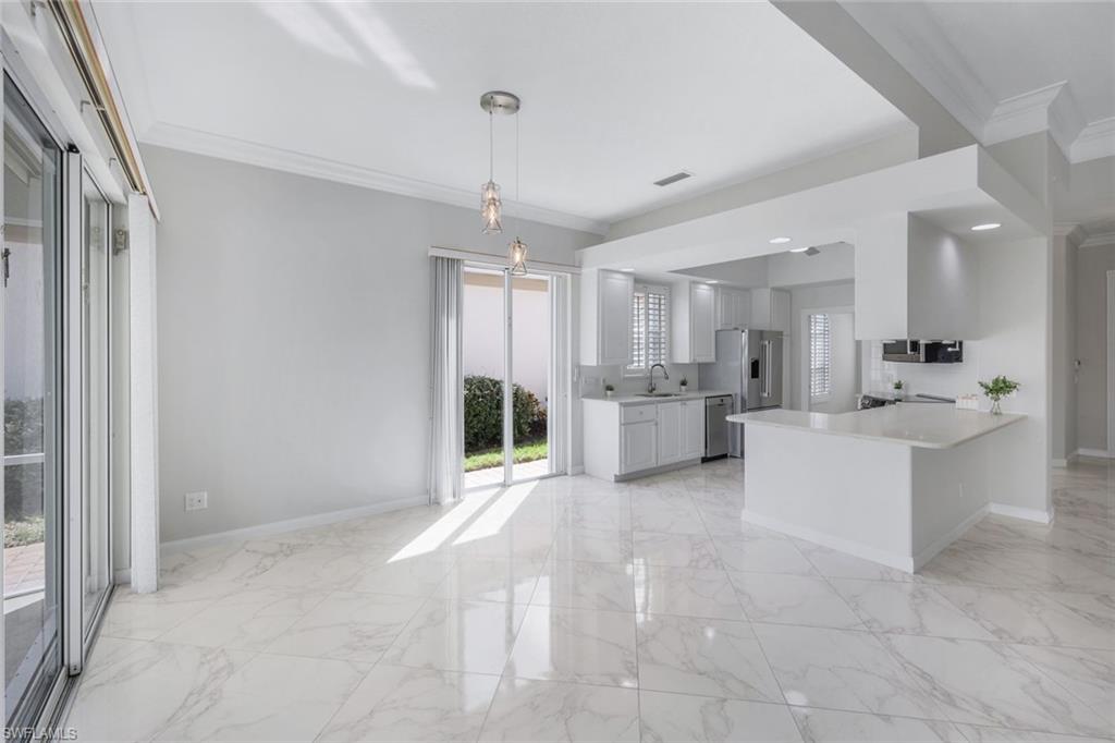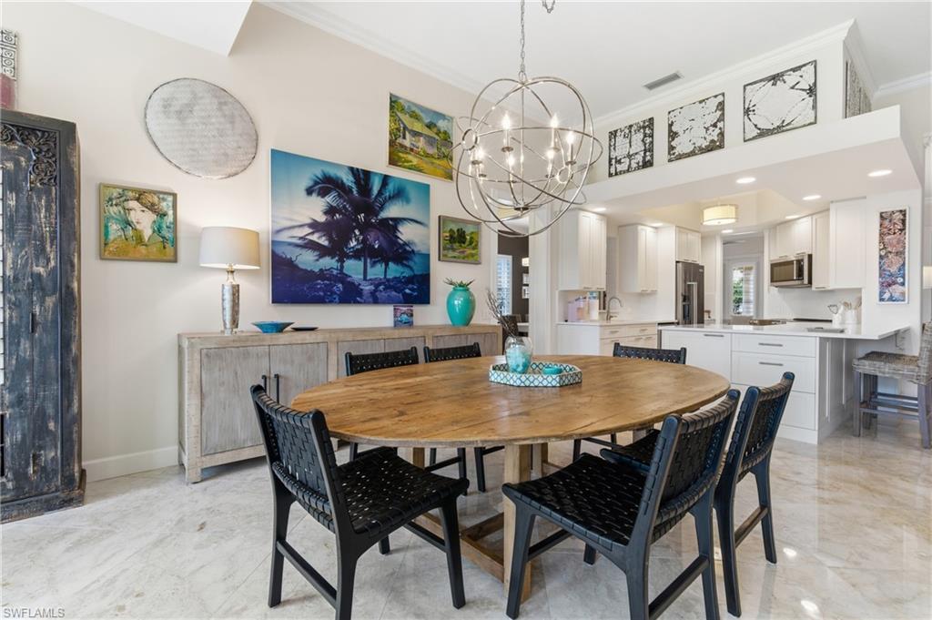 This gracious Island Walk home is the extended Carlyle model, boasting 2687 sq ft of living space under air. Walk in the front door and be blown away by the expansive feel of the 12 ft ceilings with a view through the house to the pool and lake beyond. The home has an open concept kitchen/family room with new cabinetry and counter tops, and contemporary built ins; large format polished travertine tile flooring throughout; custom window treatments; custom salt water pool and lanai with a lovely southern exposure lake view; meticulously maintained landscaping; spacious front porch, freshly painted exterior and a brand new roof. Together with its 4 bedrooms, 3 upgraded baths, as well as formal living and dining rooms - the layout of this home is flexible to meet all of your needs and beyond. Accordion and electric storm shutters make hurricane prep a breeze. Garage has built in storage and an epoxy coated floor. Warm and inviting with many luxury finishes, this lovely home is beautifully appointed with high end furnishings, which are available to purchase, if you desire. It’s a must see! Residents of Island Walk enjoy a large town center offering many amenities as well as hair & nail salon, post office, gas station, car wash, fitness center, resort and lap pools, pickleball, tennis, bocce, a putting green, and a very popular restaurant. Conveniently located near beaches, shopping, restaurants and everything Naples has to offer.