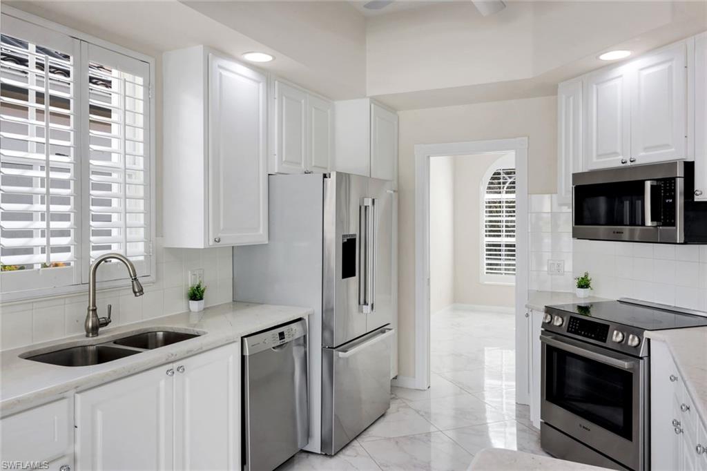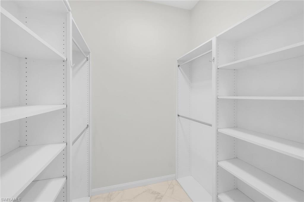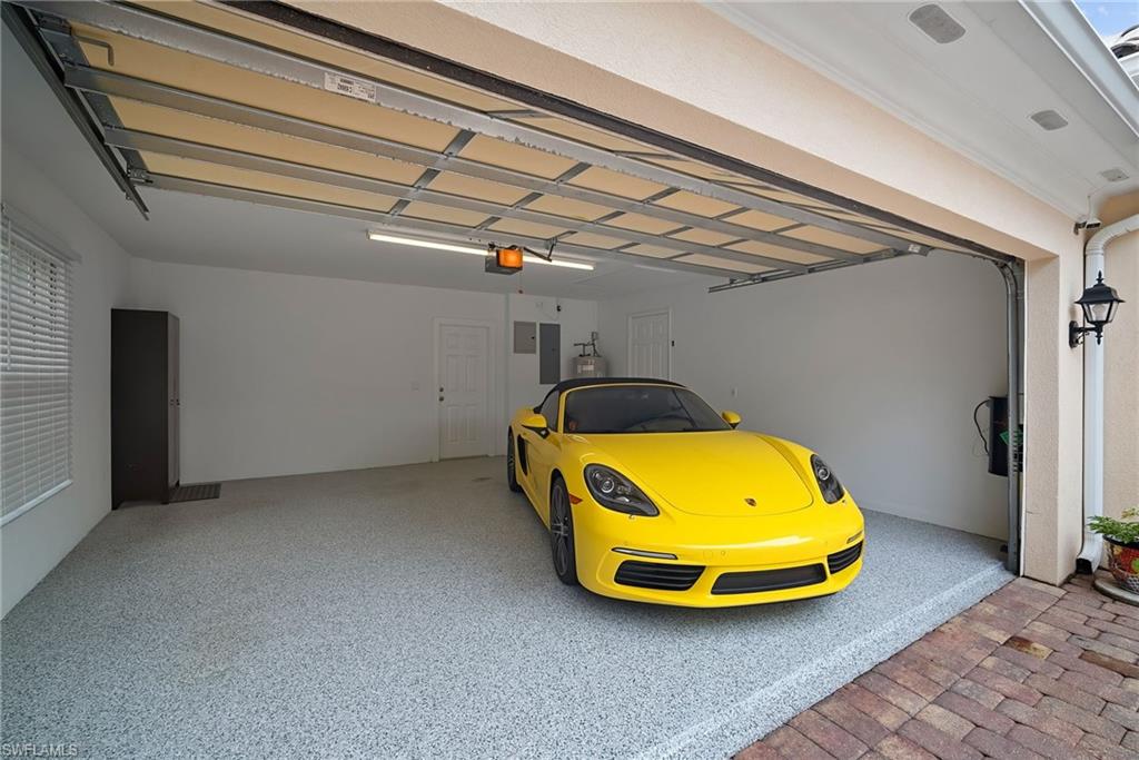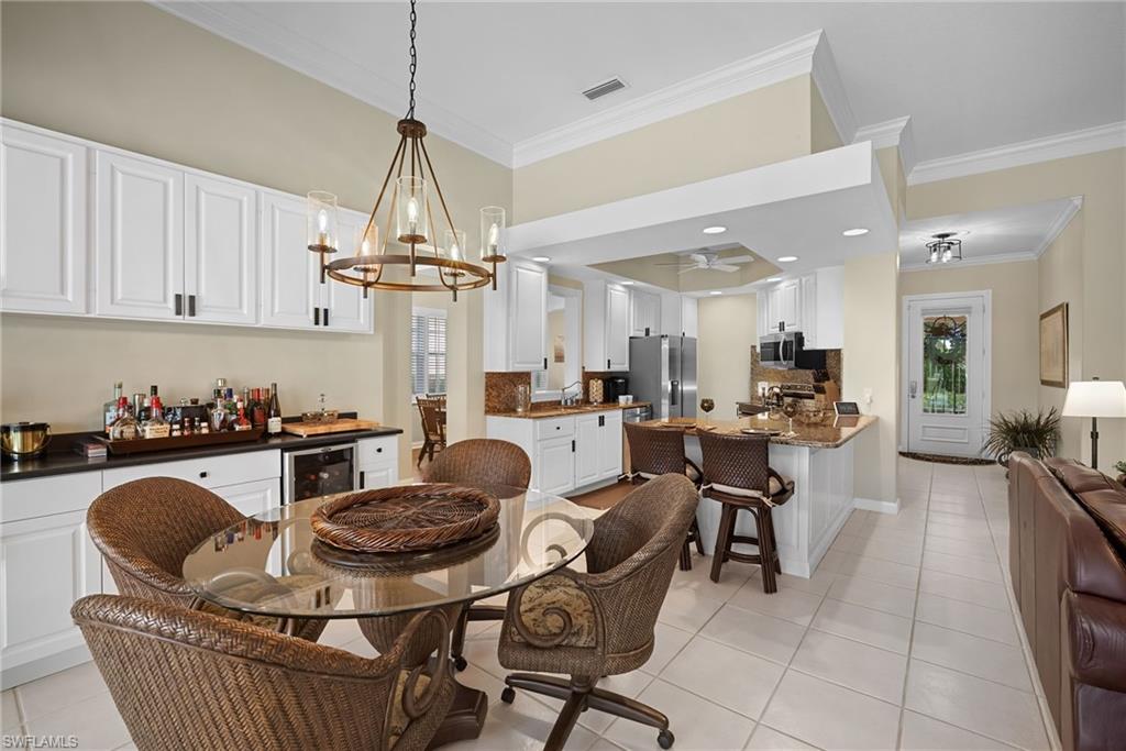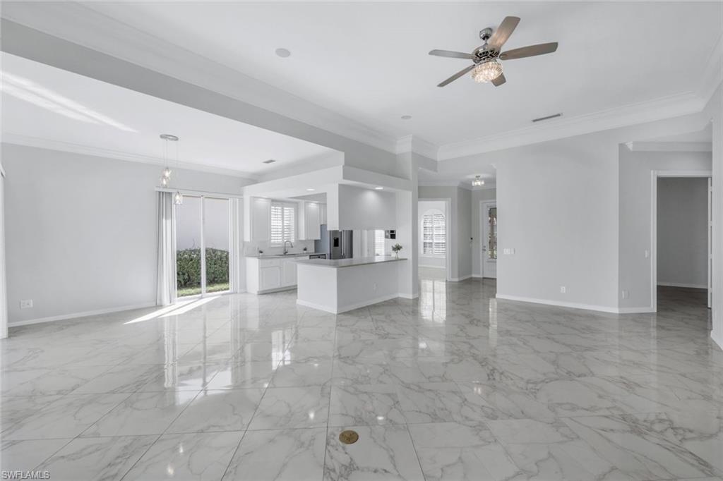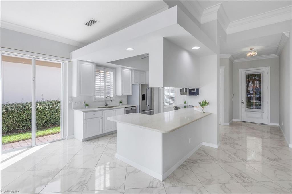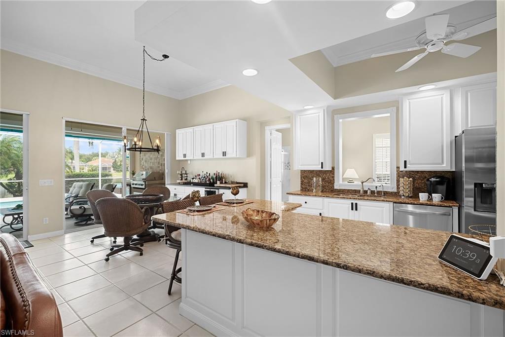This gracious Island Walk home is the extended Carlyle model, boasting 2687 sq ft of living space under air. Walk in the front door and be blown away by the expansive feel of the 12 ft ceilings with a view through the house to the pool and lake beyond. The home has an open concept kitchen/family room with new cabinetry and counter tops, and contemporary built ins; large format polished travertine tile flooring throughout; custom window treatments; custom salt water pool and lanai with a lovely southern exposure lake view; meticulously maintained landscaping; spacious front porch, freshly painted exterior and a brand new roof. Together with its 4 bedrooms, 3 upgraded baths, as well as formal living and dining rooms - the layout of this home is flexible to meet all of your needs and beyond. Accordion and electric storm shutters make hurricane prep a breeze. Garage has built in storage and an epoxy coated floor. Warm and inviting with many luxury finishes, this lovely home is beautifully appointed with high end furnishings, which are available to purchase, if you desire. It’s a must see! Residents of Island Walk enjoy a large town center offering many amenities as well as hair & nail salon, post office, gas station, car wash, fitness center, resort and lap pools, pickleball, tennis, bocce, a putting green, and a very popular restaurant. Conveniently located near beaches, shopping, restaurants and everything Naples has to offer.