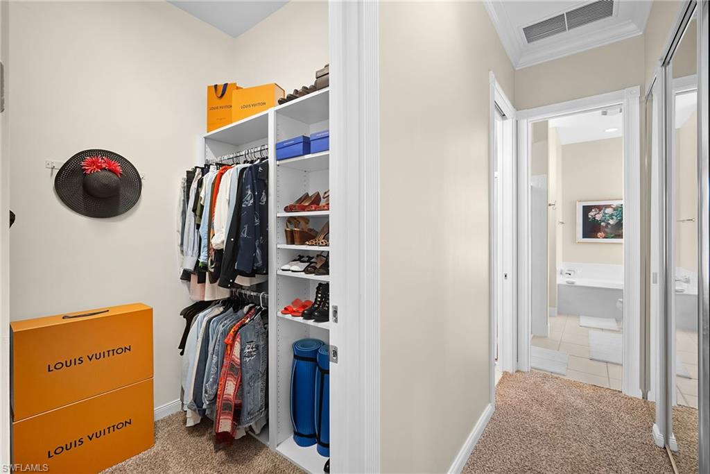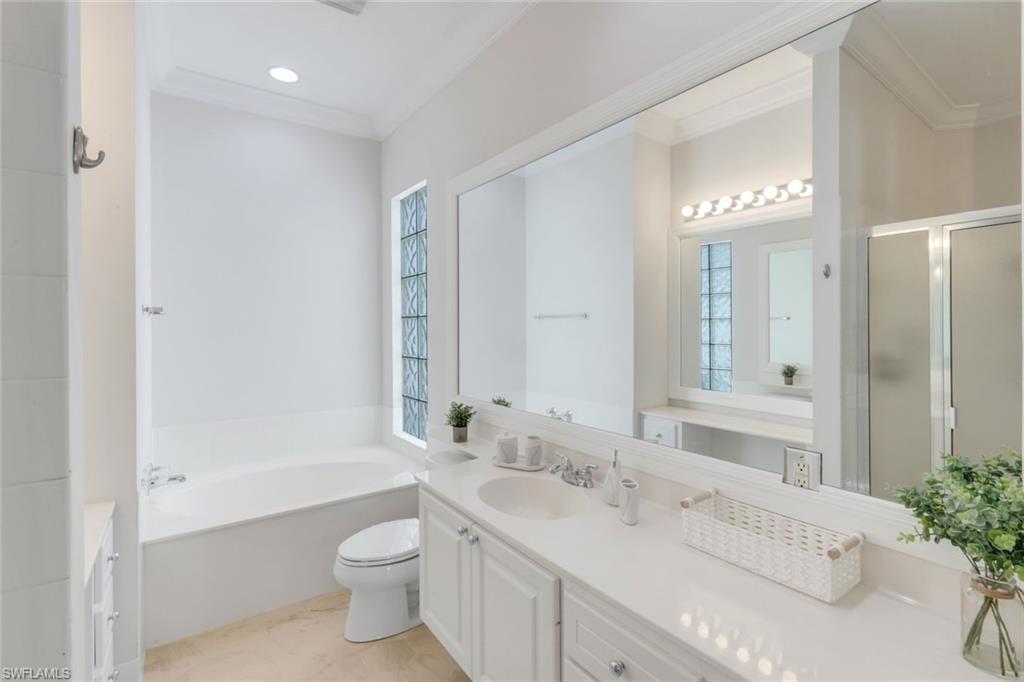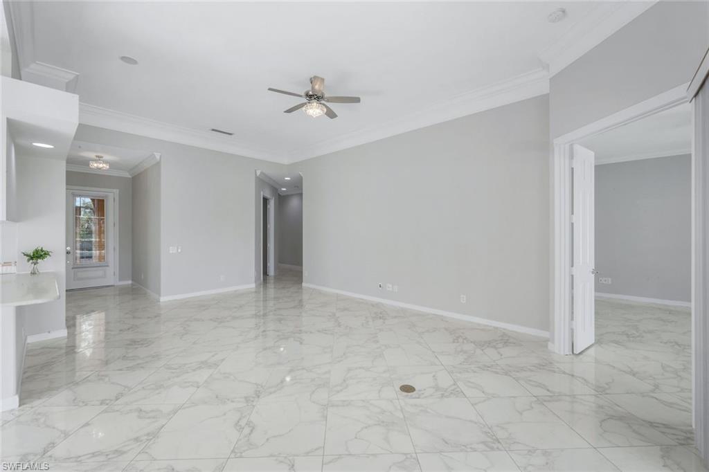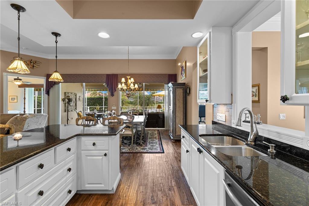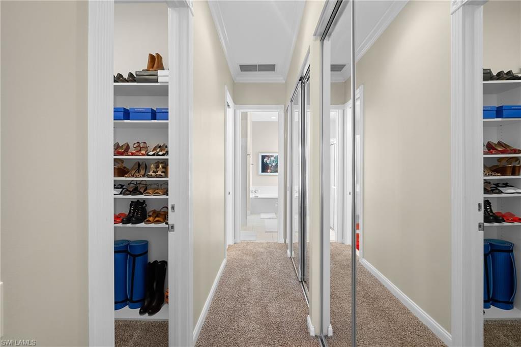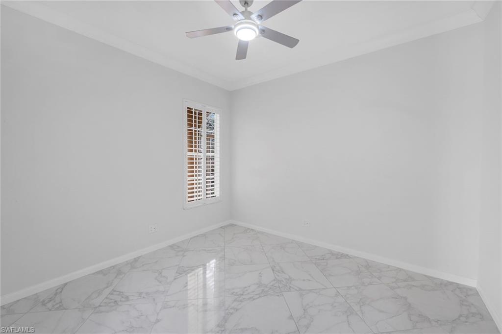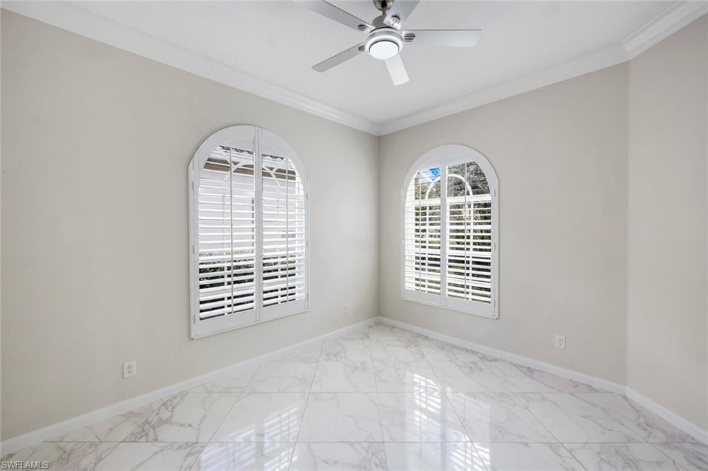 This gracious Island Walk home is the extended Carlyle model, boasting 2687 sq ft of living space under air. Walk in the front door and be blown away by the expansive feel of the 12 ft ceilings with a view through the house to the pool and lake beyond. The home has an open concept kitchen/family room with new cabinetry and counter tops, and contemporary built ins; large format polished travertine tile flooring throughout; custom window treatments; custom salt water pool and lanai with a lovely southern exposure lake view; meticulously maintained landscaping; spacious front porch, freshly painted exterior and a brand new roof. Together with its 4 bedrooms, 3 upgraded baths, as well as formal living and dining rooms - the layout of this home is flexible to meet all of your needs and beyond. Accordion and electric storm shutters make hurricane prep a breeze. Garage has built in storage and an epoxy coated floor. Warm and inviting with many luxury finishes, this lovely home is beautifully appointed with high end furnishings, which are available to purchase, if you desire. It’s a must see! Residents of Island Walk enjoy a large town center offering many amenities as well as hair & nail salon, post office, gas station, car wash, fitness center, resort and lap pools, pickleball, tennis, bocce, a putting green, and a very popular restaurant. Conveniently located near beaches, shopping, restaurants and everything Naples has to offer.