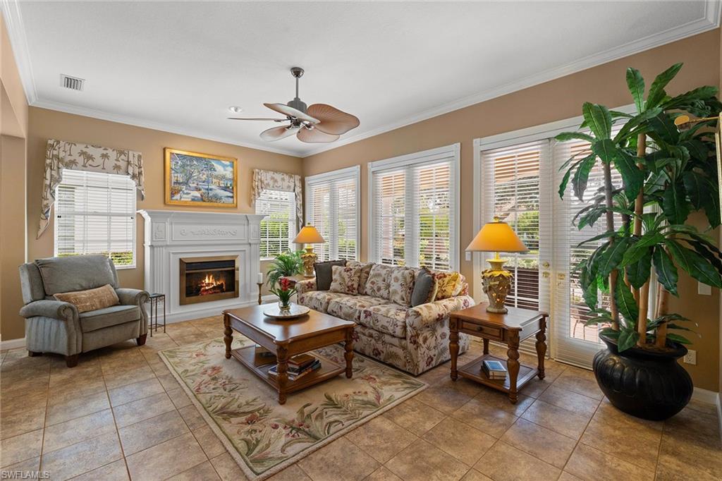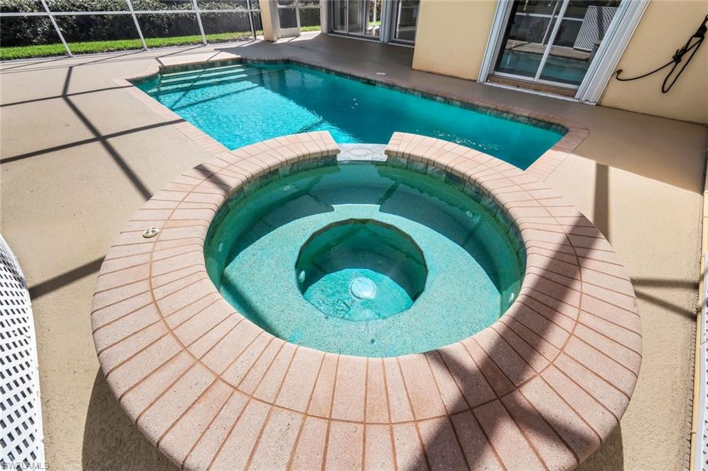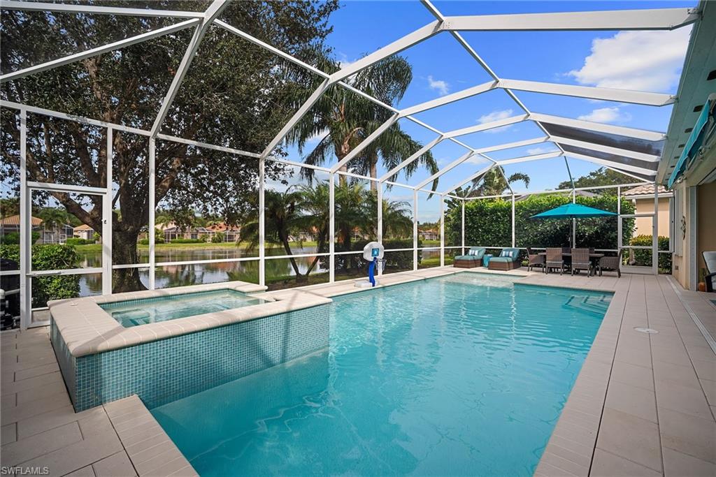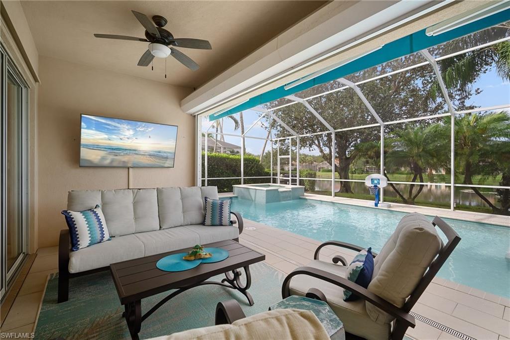 In sought-after Island Walk community, this Carlyle model residence exemplifies Florida indoor-outdoor living. With Florida-style decor and Tommy Bahama-inspired finishes, the home features four bedrooms, three full baths and a two-car garage with an impact-resistant door and epoxy flooring. Interior features include a white kitchen with breakfast bar seating, a formal dining room and a spacious family room with multiple windows and a fireplace. Interior features include a white kitchen with breakfast bar seating, a formal dining room and a spacious family room with multiple windows and a fireplace. Flooring includes tile in main areas and engineered hardwood in select spaces. The primary suite includes dual sinks and toilets, a soaking tub, a walk-in shower and direct access to the lanai. Imagine waking to a pool and lake view, this screened outdoor retreat features a custom solar-heated pool, hot tub spa, and dedicated living and dining areas. Two mechanical awnings provide added shade and comfort on the patio, making the space ideal for sunning, swimming or entertaining. A covered front patio adds even more versatility. Additional enhancements include a 2018 roof replacement, a 2022 air-conditioning system and hurricane shutters for added peace of mind. Island Walk offers shaded streets, mature trees and scenic lakes in a tranquil setting. Residents enjoy a gated town center with a gas station, fitness center and resort-style pool. Athletic amenities include tennis, pickleball and pop tennis courts with grandstand seating, league play and lighted evening access. Close to shopping and dining and within 15 miles of Naples’ world-renowned beaches, this home offers a blend of privacy, resort-style amenities and lifestyle value in one of Naples premier lakefront communities.