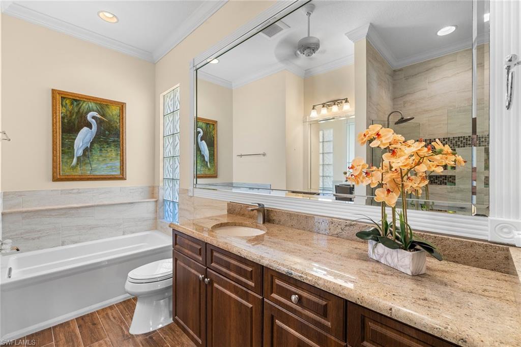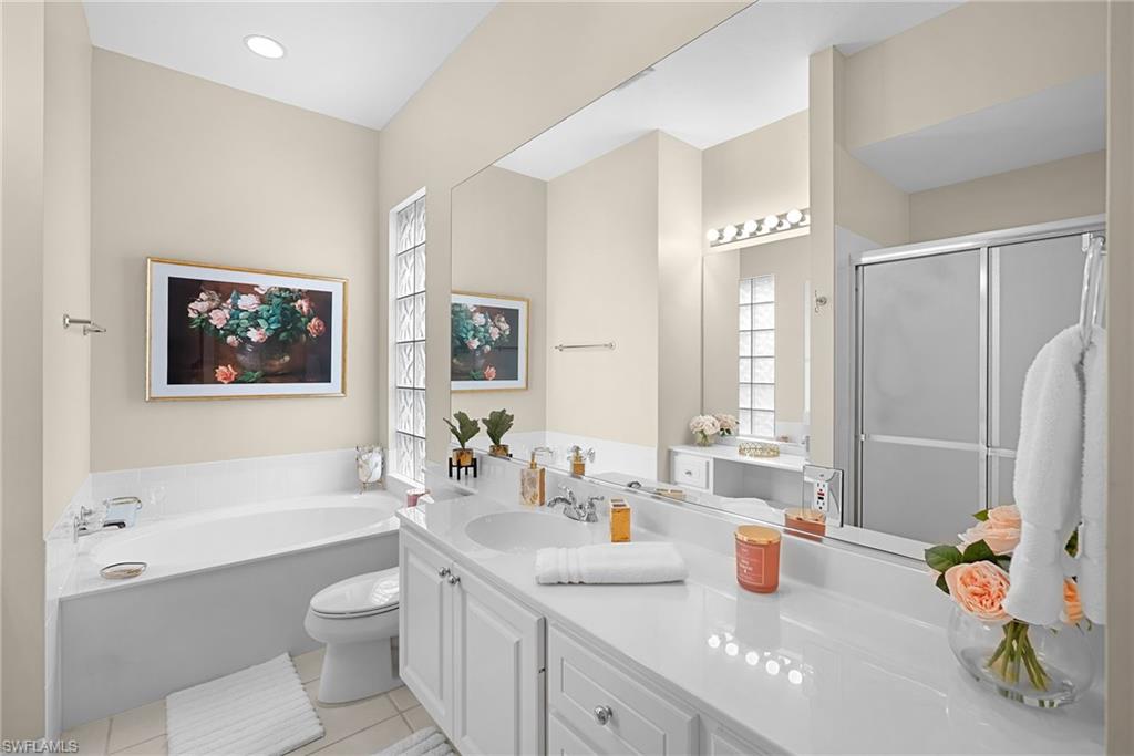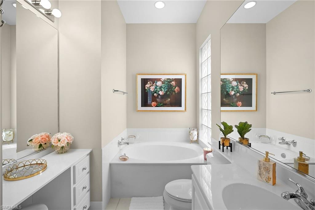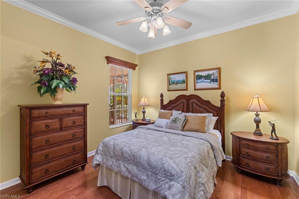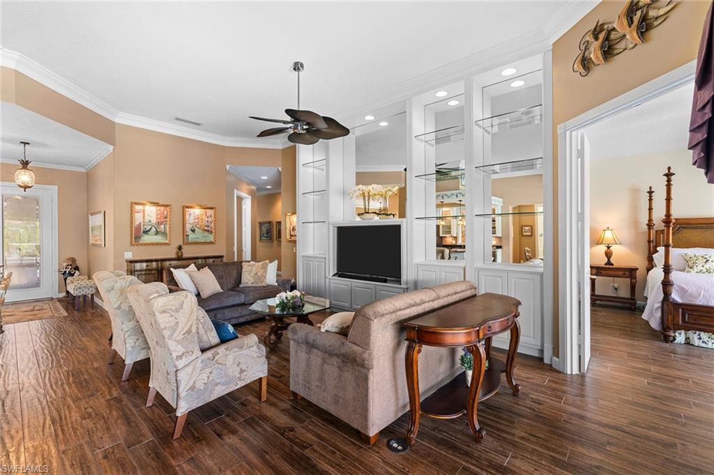 In sought-after Island Walk community, this Carlyle model residence exemplifies Florida indoor-outdoor living. With Florida-style decor and Tommy Bahama-inspired finishes, the home features four bedrooms, three full baths and a two-car garage with an impact-resistant door and epoxy flooring. Interior features include a white kitchen with breakfast bar seating, a formal dining room and a spacious family room with multiple windows and a fireplace. Interior features include a white kitchen with breakfast bar seating, a formal dining room and a spacious family room with multiple windows and a fireplace. Flooring includes tile in main areas and engineered hardwood in select spaces. The primary suite includes dual sinks and toilets, a soaking tub, a walk-in shower and direct access to the lanai. Imagine waking to a pool and lake view, this screened outdoor retreat features a custom solar-heated pool, hot tub spa, and dedicated living and dining areas. Two mechanical awnings provide added shade and comfort on the patio, making the space ideal for sunning, swimming or entertaining. A covered front patio adds even more versatility. Additional enhancements include a 2018 roof replacement, a 2022 air-conditioning system and hurricane shutters for added peace of mind. Island Walk offers shaded streets, mature trees and scenic lakes in a tranquil setting. Residents enjoy a gated town center with a gas station, fitness center and resort-style pool. Athletic amenities include tennis, pickleball and pop tennis courts with grandstand seating, league play and lighted evening access. Close to shopping and dining and within 15 miles of Naples’ world-renowned beaches, this home offers a blend of privacy, resort-style amenities and lifestyle value in one of Naples premier lakefront communities.