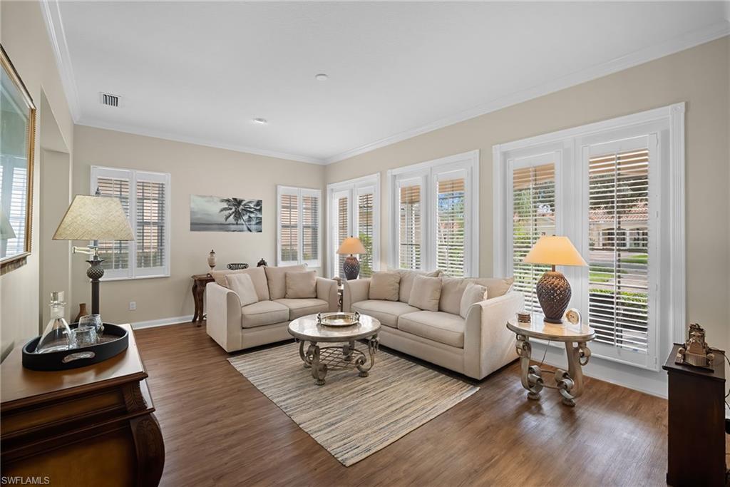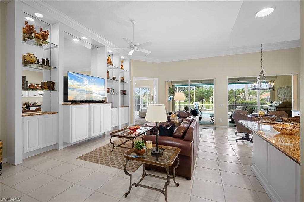 **NEWER ROOF 2023 ** THIS GORGEOUS 3 BEDROOM+DEN 2.5 BATH LAKE-VIEW HOME with a NASSAU CUSTOM POOL AND SPA that will WOW your family and friends! This popular Oakmont model with attached 2 Car Garage is MOVE IN READY !! Sellers chose this home for its location close to the Entry Gate and a short stroll to Town Center and all the Amenities. The Screened Entry welcomes cooler Naples breezes and saves on A/C costs. This Open Floor Plan home has 12 foot volume ceilings in the Great Room and is open to the sunny kitchen which is large enough for 2 cooks and has views of the Pool and Lake. UPGRADES include Freshly Painted Home, Custom Tile Through Out the home, New Quartz Counter Tops in the Kitchen, NEWER BOSCH APPLIANCES, Newer A/C, Crown Molding, Upgraded Lights and Fans, Plantation Shutters and New Hurricane Shutters. The gracious and serene lifestyle of Award Winning IslandWalk comes with Amenities Galore and LOW FEES that includes HDTV & High Speed Internet Service, Lawn and Landscape Care and Sprinkler System. The location in the preferred North Naples area close to white sand Beaches, Dining and Shopping… makes this the Perfect Address in Paradise!