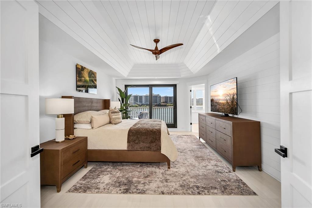 Are you searching for a waterfront residence that captures sweeping views of the Marco River and the Gulf from an expansive outdoor living area? This stunning furnished first-floor condominium in the gated community of La Peninsula offers a serene coastal lifestyle with the comforts of refined interiors and unparalleled scenery. The residence features two bedrooms, two baths, southeastern exposure, one assigned garage parking space and an additional air-conditioned storage unit. Inside, tile flooring flows throughout the home, complemented by crown molding and tray ceilings that elevate the aesthetic. The kitchen is beautifully appointed with shaker-style cabinetry, under-cabinet lighting, a tile backsplash and stainless steel appliances, including a range, microwave, refrigerator/freezer and a new BOSCH dishwasher. A built-in TV adds functionality to the bar-height counter, creating an inviting space to gather. The adjacent dining area opens into the living room, where a custom stone wall and a built-in bar with in-cabinet lighting enhance the ambiance. Glass sliders provide access to a screened lanai and showcase breathtaking water views. The owner’s suite is a private retreat with a tray ceiling, white plantation shutters, lanai access and peaceful water views. The en-suite bath includes a large corner window, a seating area, dual-sink vanity with full-width mirror, and a walk-in shower enclosed in frameless glass with floor-to-ceiling tile. The guest bedroom features white plantation shutters and an en-suite bath with a shower-tub combo with glass enclosure, and access from the hallway. A laundry area offers cabinetry with a drying rack, counter space, and a stackable GE washer and dryer. Go from the lanai to an oversized private patio with brick paver flooring, ideal for dining, lounging or grilling while overlooking tranquil waters. With impact doors and windows throughout, this home offers lasting comfort and protection. La Peninsula is a private, gated community on the Isles of Capri, ideally between Marco Island and downtown Naples. Residents enjoy an array of resort-style amenities including a renovated clubhouse, large heated pool, spa, fitness center and scenic recreational paths along the water. Reflecting a strong sense of community, neighbors frequently gather at the point to take in the spectacular sunsets. Social events, movie nights and card games are hosted regularly at the clubhouse, enhancing the vibrant lifestyle. Newly approved bocce, tennis and pickleball courts are in the development plans and slated for future construction, offering exciting additional recreational opportunities for residents to enjoy.
