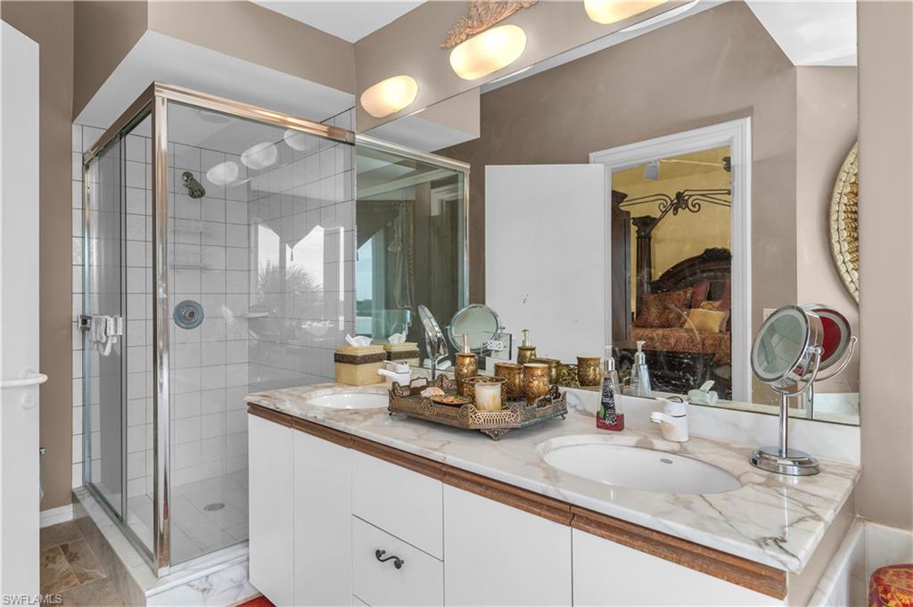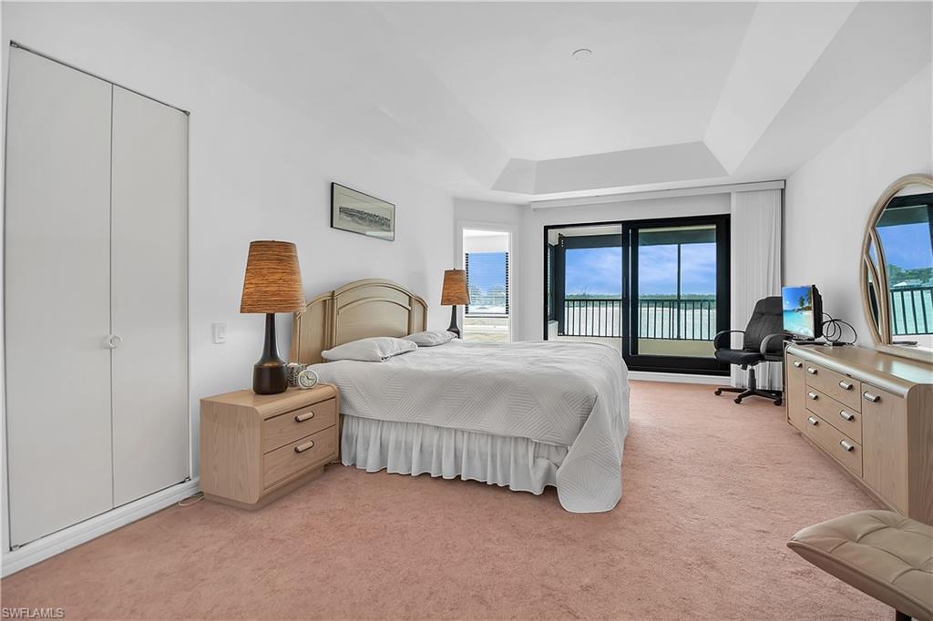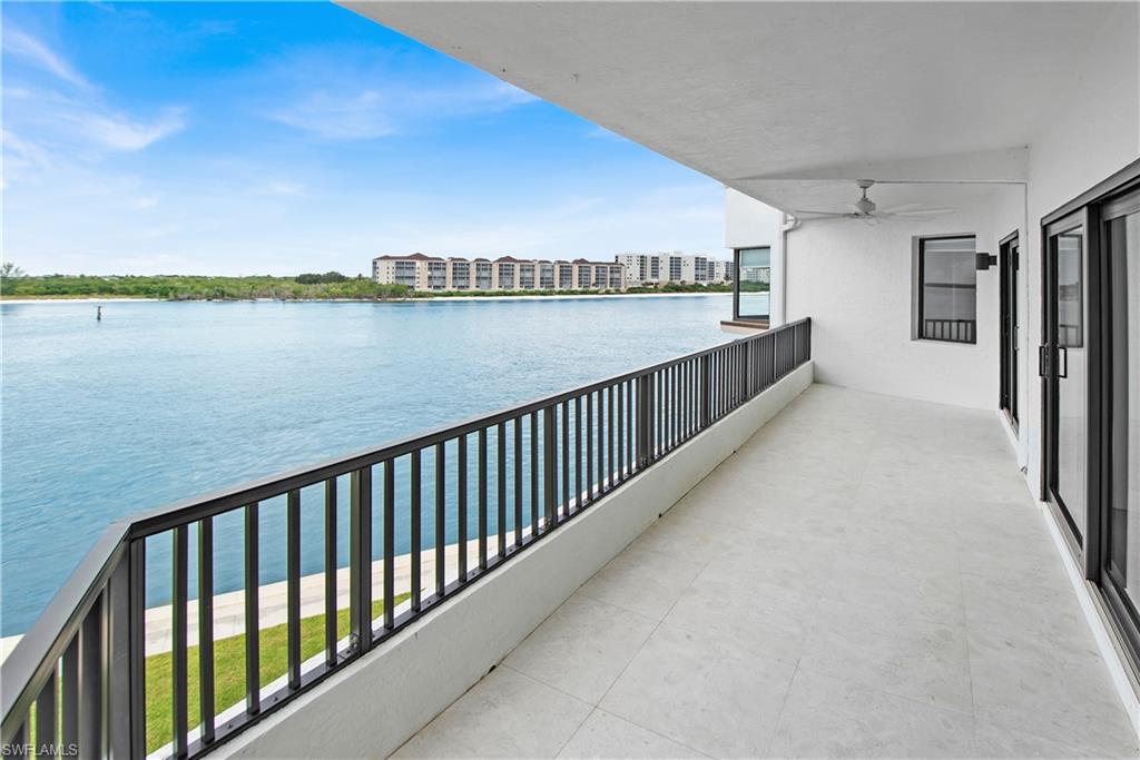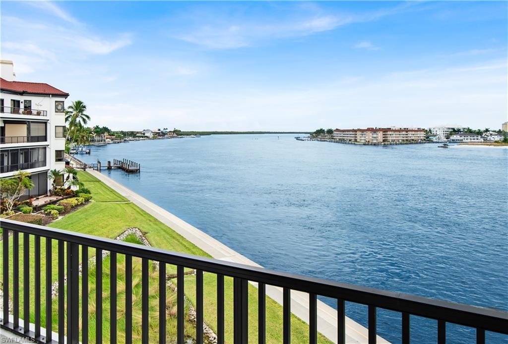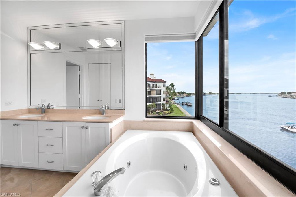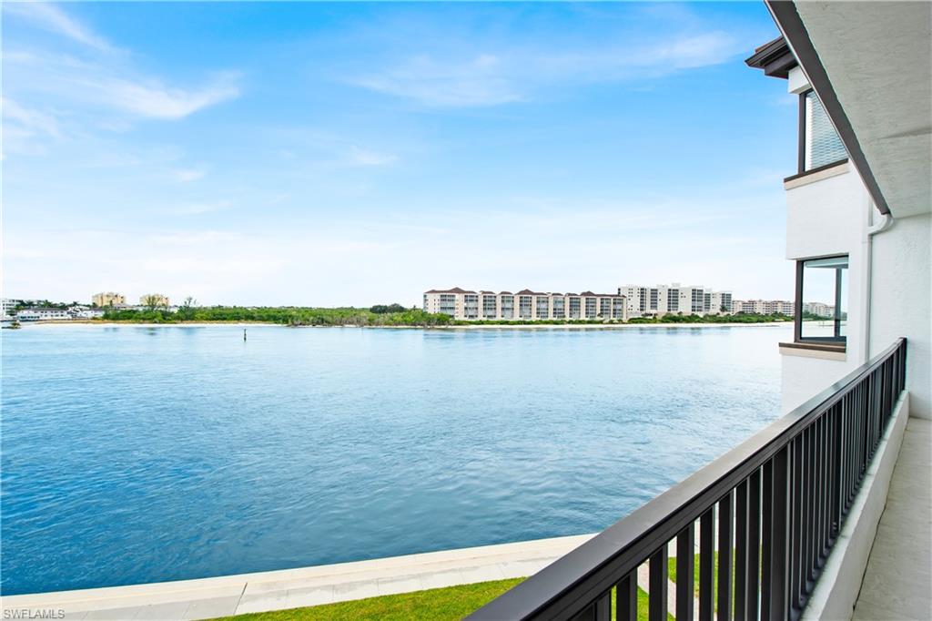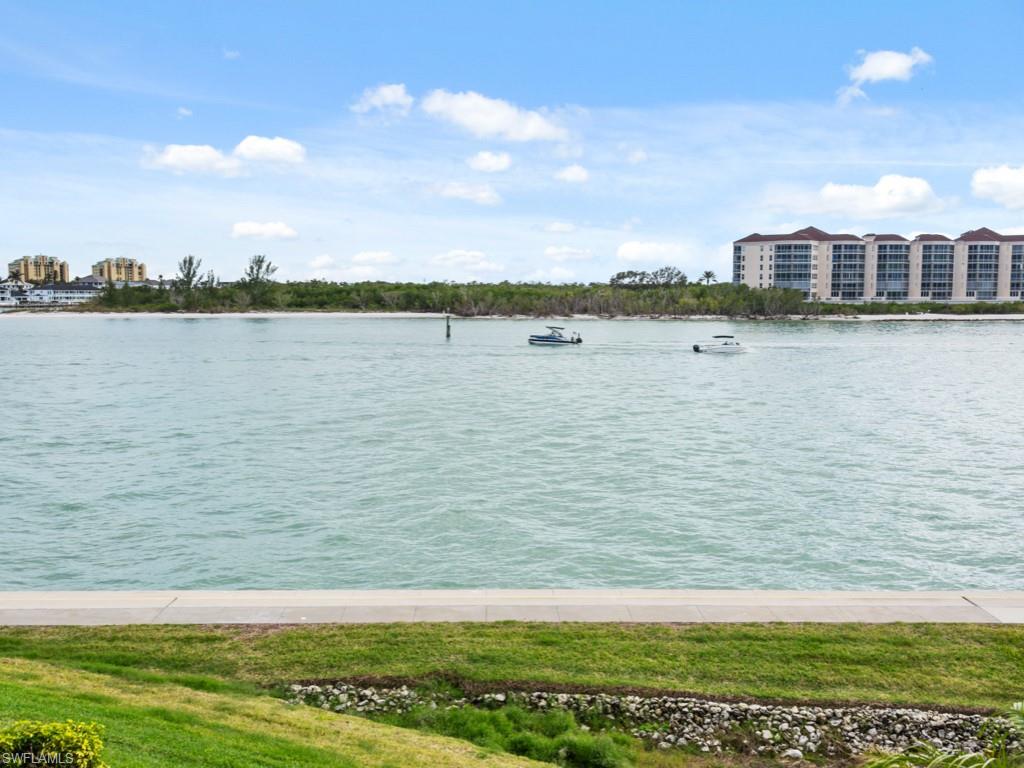 Exceptional views of the Maro River and Gulf of Mexico is all you see from this lovely condo in the beautiful La Peninsula. Located on the tip of the Isles of Capri, this spacious, single level condo has the highly desired Cote D'Azur floor plan. Features include elevator access, two bedrooms, two and a half bathrooms, and two spacious walk-in closets with 1,750 sq ft under air with newer air conditioning unit and hot water tank.The updated kitchen comes with induction cooktop and newer Whirlpool appliances. There is also a separate spacious storage area next to the covered ground level garage. Everything in this well-cared for and clean unit is ready for you to make it your own. The large master suite boasts breathtaking views and en-suite bath with dual vanity, soaking tub overlooking the Marco River/Gulf of Mexico, walk-in shower with new shower door, and spacious walk-in closet. The second bedroom with en-suite shower/bath and spacious walk-in closet provides plenty of privacy for you and your guests. The covered lanai is accessible from both the main living room and the master bedroom with breath-taking views of sunrise over Marco River and sunset over the Gulf. Enjoy spectacular views of the Big Marco River, Hideaway Beach, Marco Island, and Gulf of Mexico. Wherever you are, you will see boats sailing by quietly in the no-wake zone, lots of dolphins, manatees, occasional jumping fish, and other wildlife, putting on a show that never gets old. Let's not forget about how wonderful fishing is right off the seawall. Catching big Tarpon, Snook, Snapper, Sheephead, Grouper, and Blck Drum is a common occurrence. Boat docks are available for separate purchase. La Peninsula is a gated community with lush tropical landscaping throughout. Fitness room, club house, olympic-sized heated swimming pool, spa, and a large promenade along the water's edge which wraps around the whole seawall with wonderful sunset views over the Gulf. A new sports center is also coming soon along with existing tennis courts. Isles of Capri is a subtropical island that boasts abundance of wildlife, great restaurants, three marinas, and ready access to both Marco Island and downtown Naples in minutes without any congested bridge or causeway. Located one mile from Marco island and only 20 minutes away from downtown Naples with its sophisticated shopping and fine dining, our area is famous for its white sand beaches, world class fishing, boating, and fantastic golfing. Isles of Capri is the perfect place to sit back, relax, unwind, and let the sights and sounds sooth your mind, body, and soul.