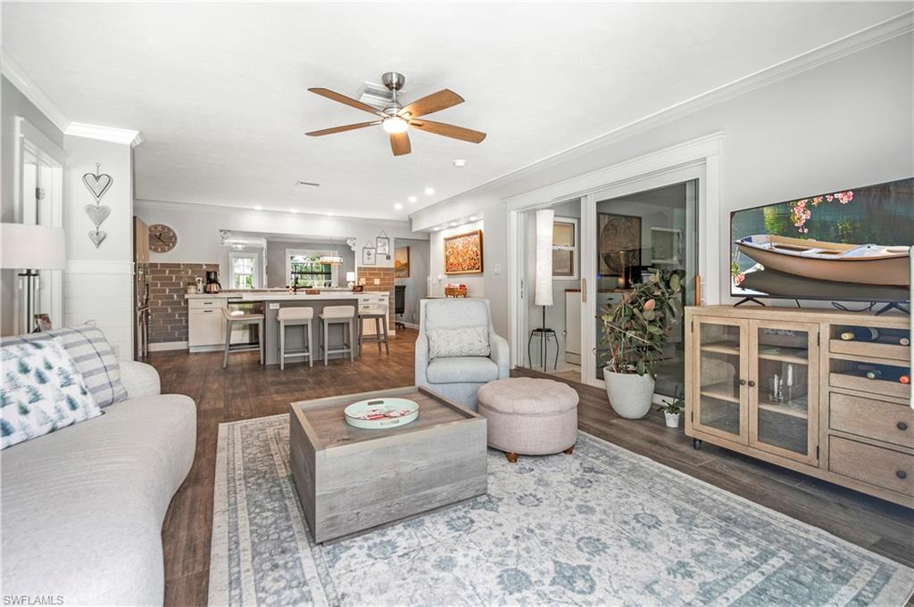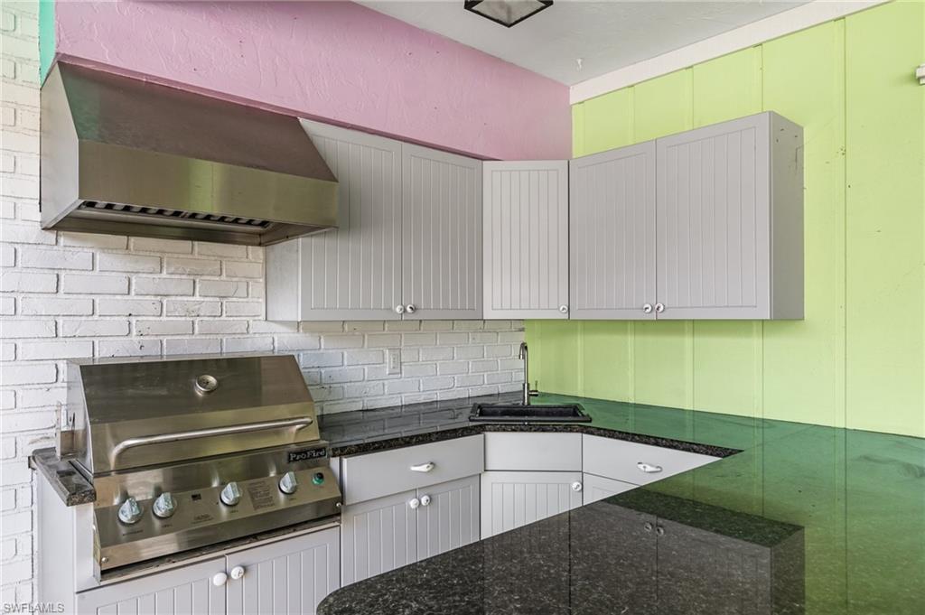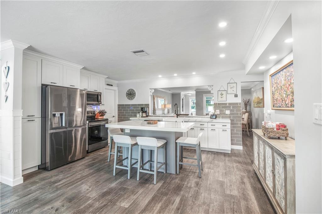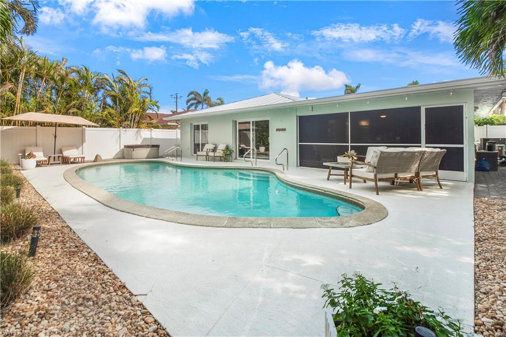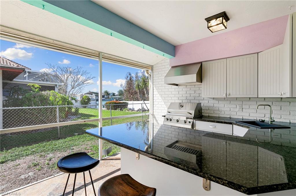 Welcome to your slice of paradise in the serene enclave of Isles of Capri in beautiful Naples, Florida! This beautifully renovated 3-bedroom, 2-bathroom home seamlessly blends modern elegance with coastal charm. Step inside to discover a stunning open-concept layout featuring new luxury vinyl, coastal wood-look flooring and vaulted ceilings that create an airy, spacious feel. Sunlight bathes the great room from two skylights and a three-panel sliding glass door. Both bathrooms have been tastefully updated, offering a spa-like retreat. The heart of the home is the renovated kitchen, complete with sleek stainless steel appliances, stylish cabinetry and a convenient pass through window to the outdoor kitchen. Escape to your screened and covered lanai, where you’ll find the outdoor kitchen equipped with a vented gas grill, large granite island bar and sink—ideal for entertaining! Enjoy the serene partial view of the water as you relax in this inviting outdoor space. Situated on a desirable corner lot, this property boasts a large circular driveway for ample parking. The fenced tropical landscaped back yard provides privacy and security, making it perfect for pets or family gatherings. Location is key, and this home doesn’t disappoint! You’ll be just 0.3 miles from delightful restaurants and the marina, allowing you to fully embrace the laid-back island lifestyle. Don’t miss your chance to own this stunning home in the Isles of Capri. Schedule your showing today and start living the dream!