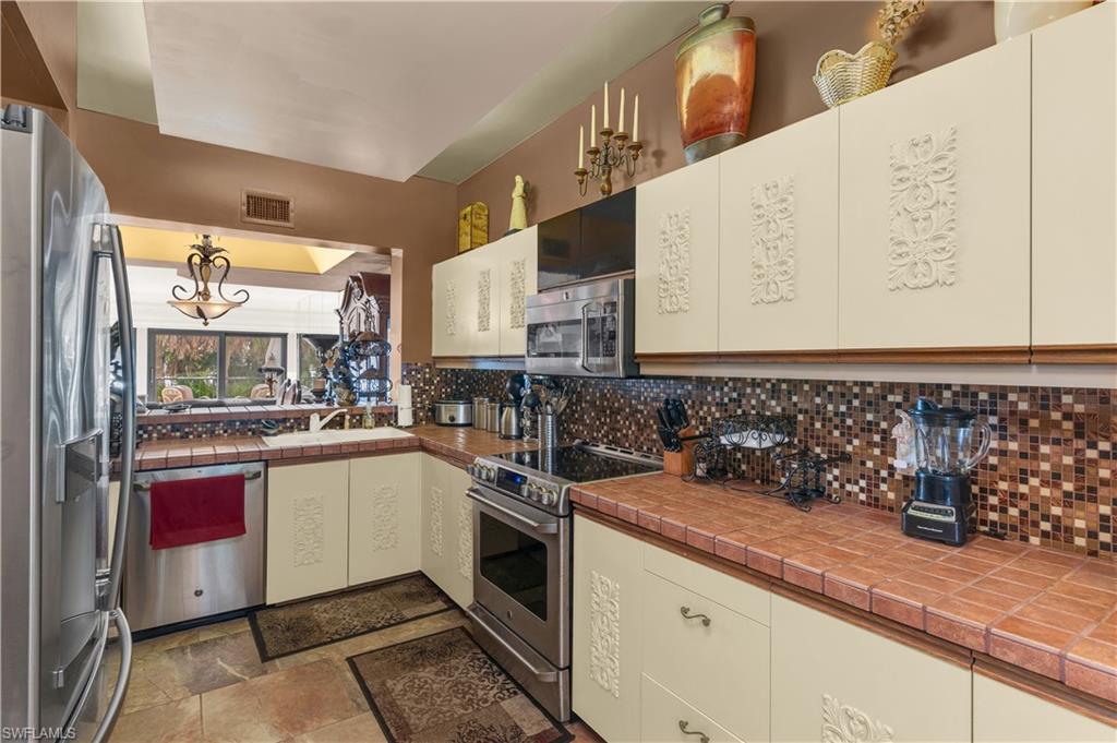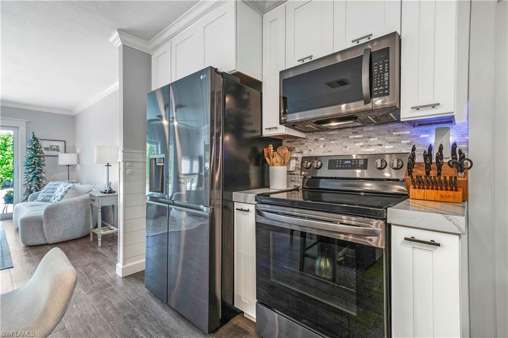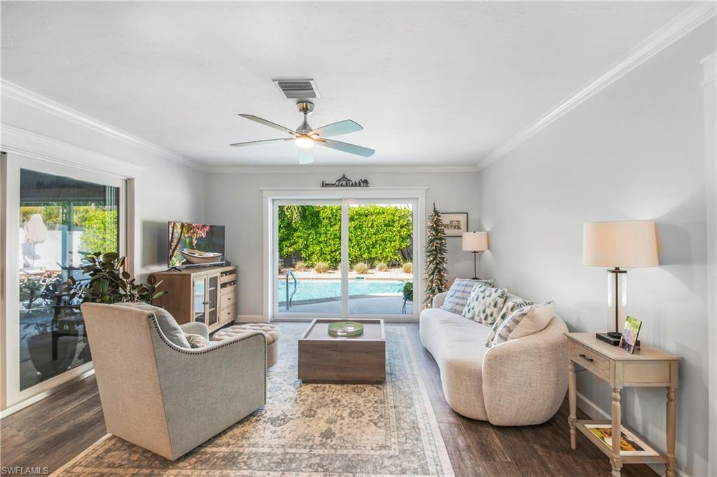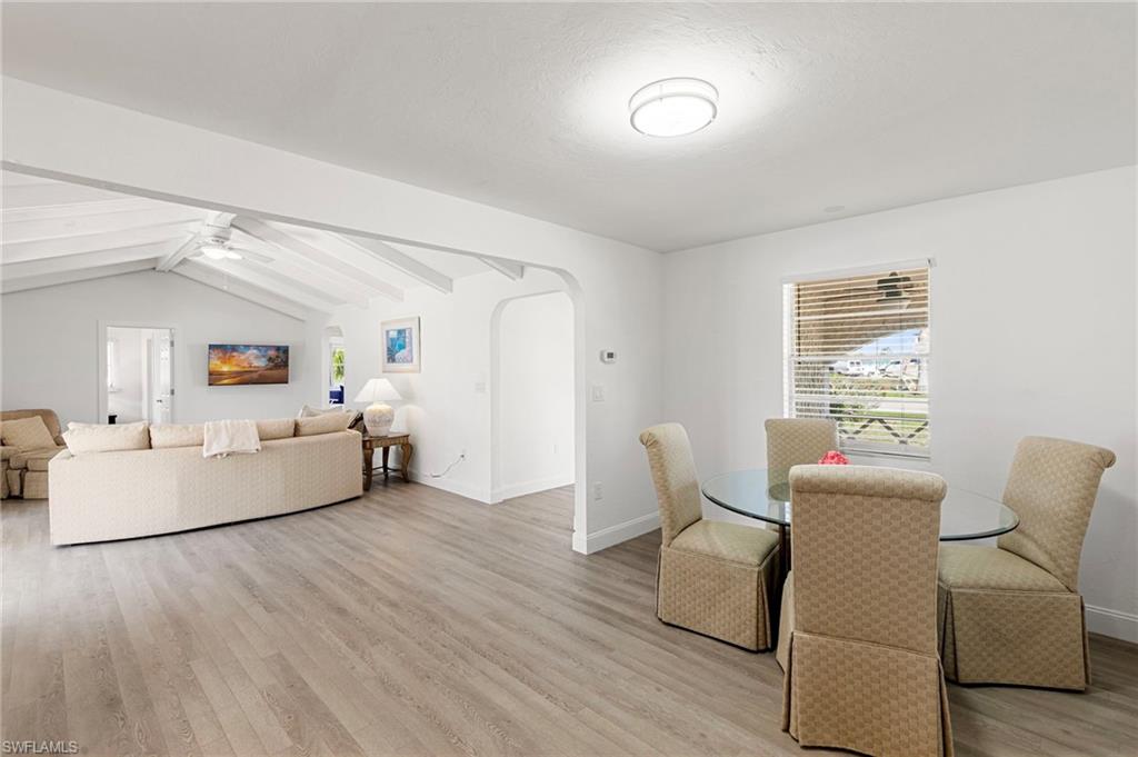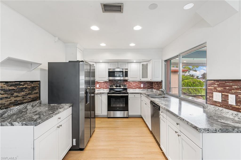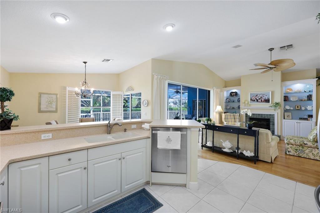 Welcome to your slice of paradise in the serene enclave of Isles of Capri in beautiful Naples, Florida! This beautifully renovated 3-bedroom, 2-bathroom home seamlessly blends modern elegance with coastal charm. Step inside to discover a stunning open-concept layout featuring new luxury vinyl, coastal wood-look flooring and vaulted ceilings that create an airy, spacious feel. Sunlight bathes the great room from two skylights and a three-panel sliding glass door. Both bathrooms have been tastefully updated, offering a spa-like retreat. The heart of the home is the renovated kitchen, complete with sleek stainless steel appliances, stylish cabinetry and a convenient pass through window to the outdoor kitchen. Escape to your screened and covered lanai, where you’ll find the outdoor kitchen equipped with a vented gas grill, large granite island bar and sink—ideal for entertaining! Enjoy the serene partial view of the water as you relax in this inviting outdoor space. Situated on a desirable corner lot, this property boasts a large circular driveway for ample parking. The fenced tropical landscaped back yard provides privacy and security, making it perfect for pets or family gatherings. Location is key, and this home doesn’t disappoint! You’ll be just 0.3 miles from delightful restaurants and the marina, allowing you to fully embrace the laid-back island lifestyle. Don’t miss your chance to own this stunning home in the Isles of Capri. Schedule your showing today and start living the dream!