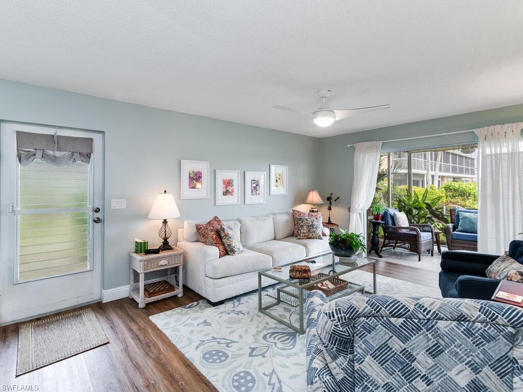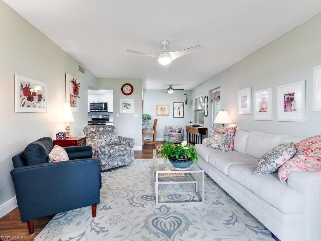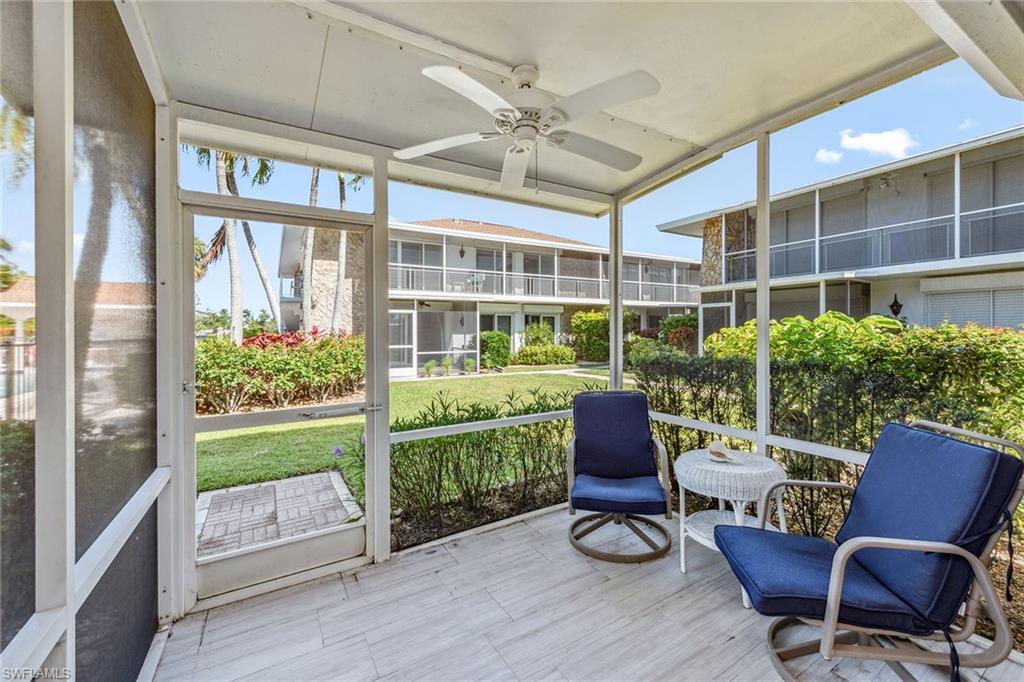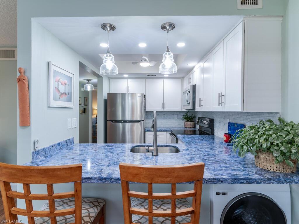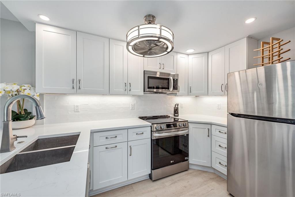 Now offered at a great price following a significant reduction, this beautifully remodeled first-floor residence in the sought-after Isles of Capri presents an exceptional value! Ideally suited for boaters and fishing enthusiasts, this turnkey two-bedroom, two-bath condominium combines stylish upgrades, tranquil surroundings, and direct Gulf access, all in a serene 55-plus waterfront community. Completely renovated in 2023, the home features a bright, open layout designed to maximize natural light and comfort. Luxury vinyl flooring flows throughout the main living spaces, while the baths feature upgraded tile. Updates include modernized plumbing, a relocated water heater for easy access, and a new HVAC system to ensure year-round climate control. The kitchen is a standout, showcasing quartz countertops, recessed lighting, white cabinetry, a breakfast bar and new stainless steel LG appliances including a range with a warming drawer, microwave, refrigerator and dishwasher. The spacious living and dining area opens through glass sliders to a screened lanai with lovely views of the heated community pool and tropical gardens. With desirable southwestern exposure, this outdoor space is ideal for enjoying the sunset or entertaining in privacy. The owner’s suite offers a large walk-in closet and a beautifully finished en-suite bath with a quartz vanity and a fully tiled walk-in shower. The guest bedroom sits adjacent to a second full bath with quartz vanity and a frameless glass walk-in shower. A new in-unit LG stackable washer and dryer adds convenience. Residents enjoy direct water access to the Gulf, and boat slips are available for lease, subject to availability. The home also includes a detached carport with additional storage. In the peaceful Isles of Capri community, this residence offers easy access to local restaurants, boutique shops, nature preserves and outdoor activities like boating, kayaking and birdwatching. Just a short drive to Marco Island and downtown Naples, this is an ideal opportunity to enjoy Southwest Florida’s signature lifestyle at an outstanding value!