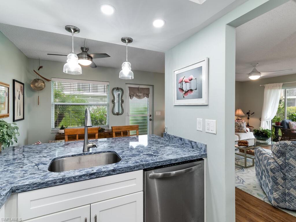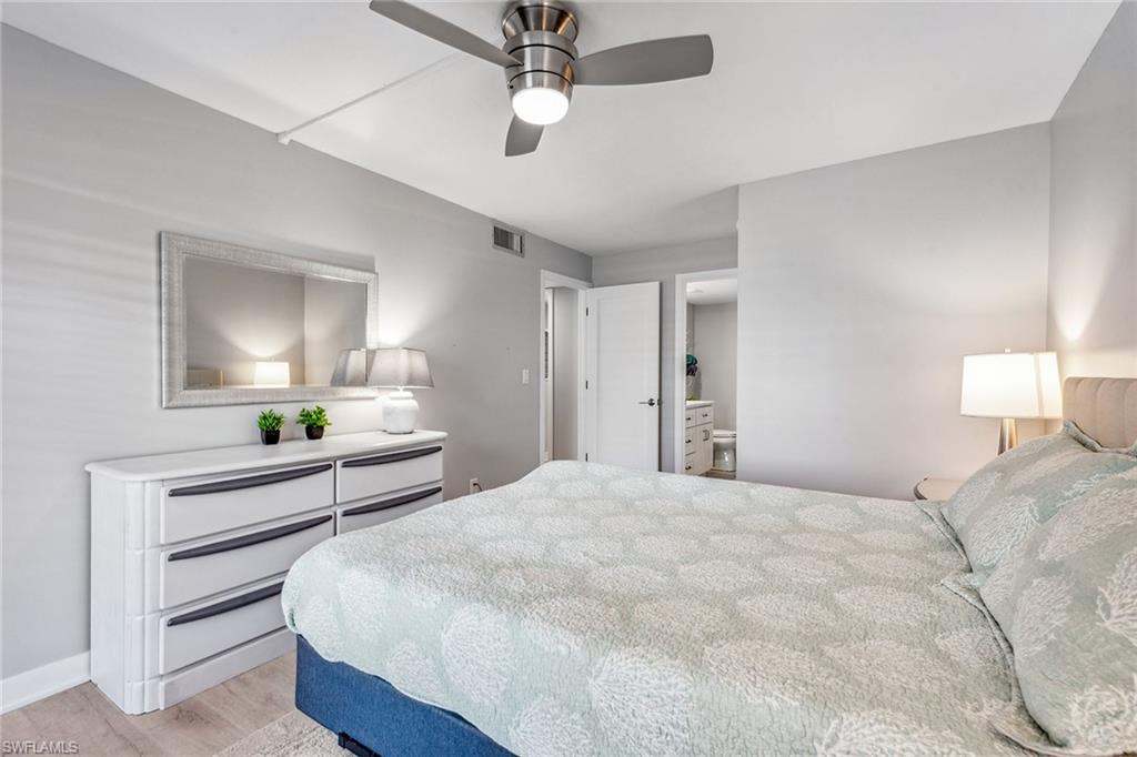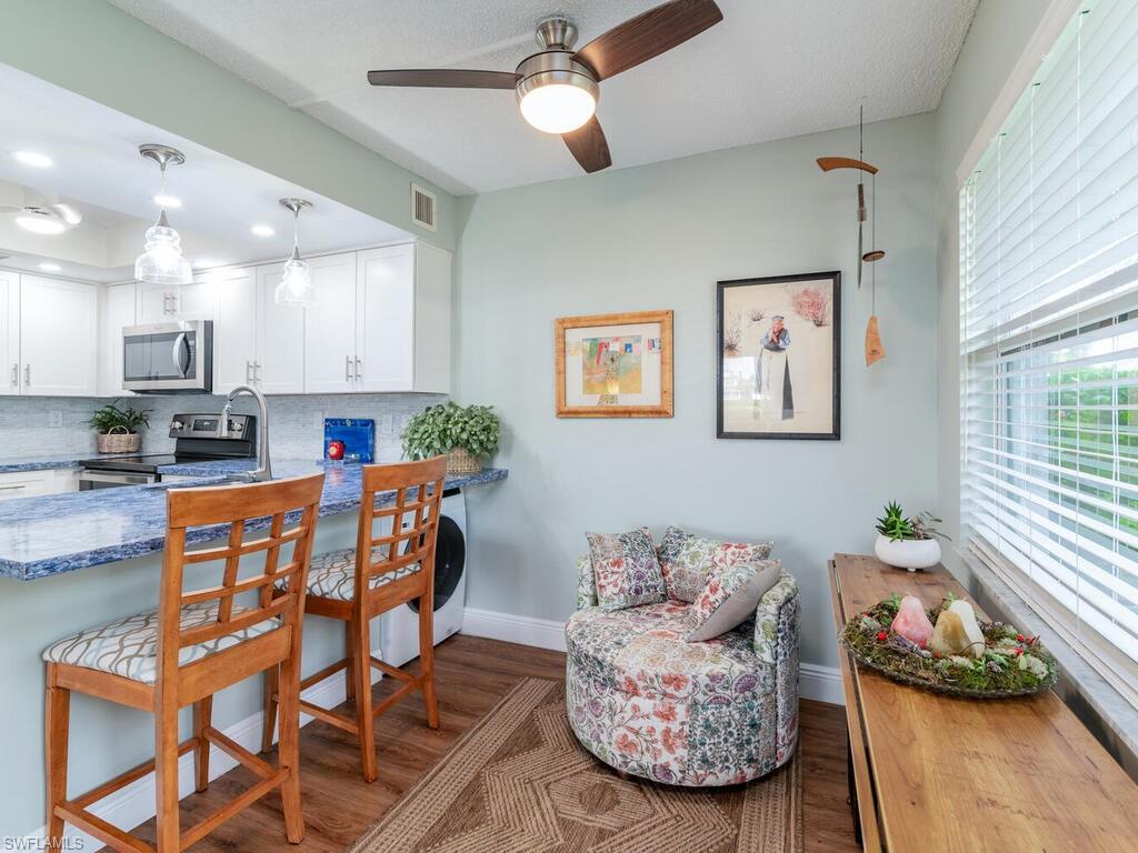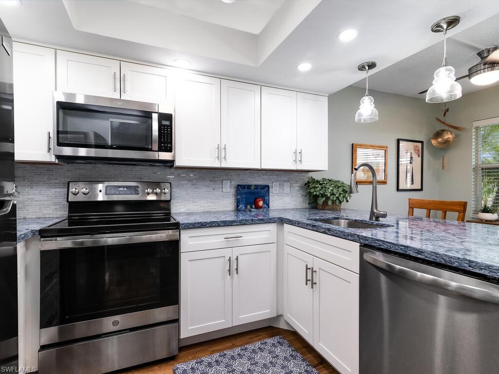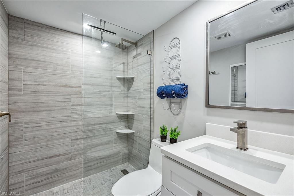Now offered at a great price following a significant reduction, this beautifully remodeled first-floor residence in the sought-after Isles of Capri presents an exceptional value! Ideally suited for boaters and fishing enthusiasts, this turnkey two-bedroom, two-bath condominium combines stylish upgrades, tranquil surroundings, and direct Gulf access, all in a serene 55-plus waterfront community. Completely renovated in 2023, the home features a bright, open layout designed to maximize natural light and comfort. Luxury vinyl flooring flows throughout the main living spaces, while the baths feature upgraded tile. Updates include modernized plumbing, a relocated water heater for easy access, and a new HVAC system to ensure year-round climate control. The kitchen is a standout, showcasing quartz countertops, recessed lighting, white cabinetry, a breakfast bar and new stainless steel LG appliances including a range with a warming drawer, microwave, refrigerator and dishwasher. The spacious living and dining area opens through glass sliders to a screened lanai with lovely views of the heated community pool and tropical gardens. With desirable southwestern exposure, this outdoor space is ideal for enjoying the sunset or entertaining in privacy. The owner’s suite offers a large walk-in closet and a beautifully finished en-suite bath with a quartz vanity and a fully tiled walk-in shower. The guest bedroom sits adjacent to a second full bath with quartz vanity and a frameless glass walk-in shower. A new in-unit LG stackable washer and dryer adds convenience. Residents enjoy direct water access to the Gulf, and boat slips are available for lease, subject to availability. The home also includes a detached carport with additional storage. In the peaceful Isles of Capri community, this residence offers easy access to local restaurants, boutique shops, nature preserves and outdoor activities like boating, kayaking and birdwatching. Just a short drive to Marco Island and downtown Naples, this is an ideal opportunity to enjoy Southwest Florida’s signature lifestyle at an outstanding value!