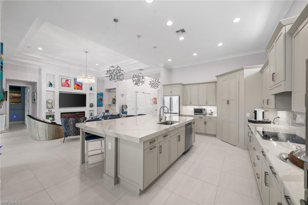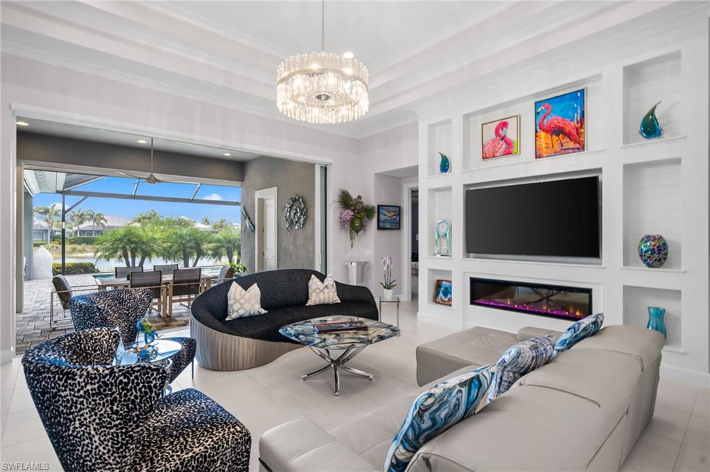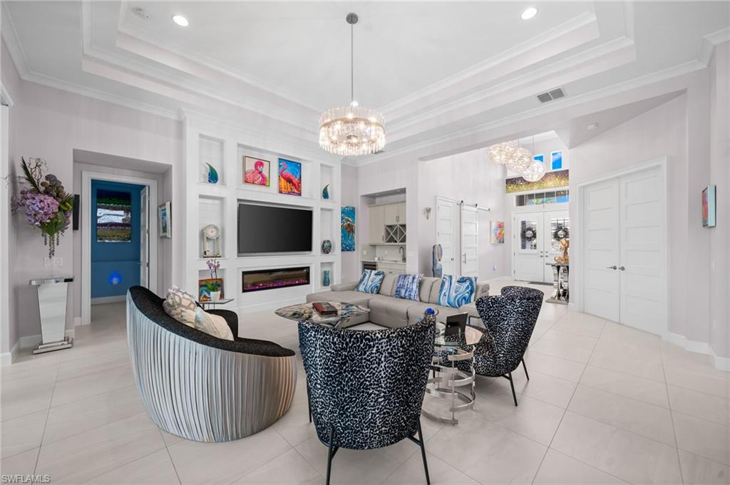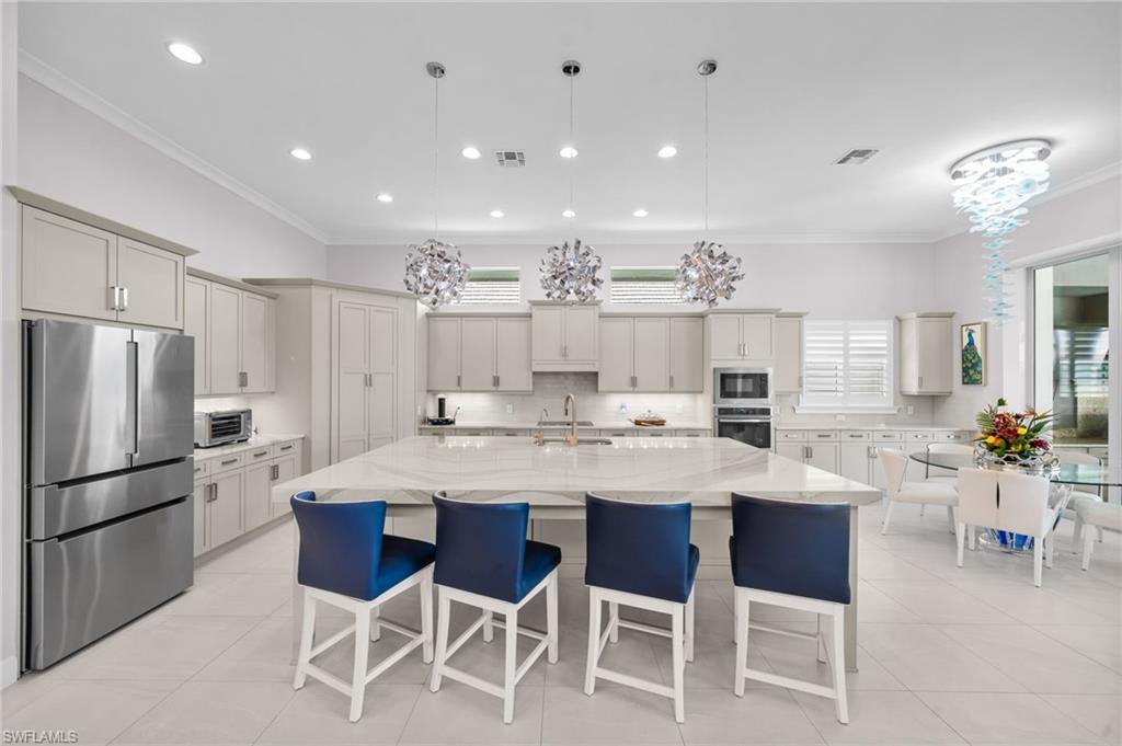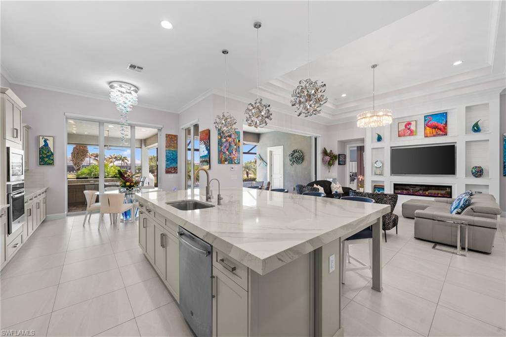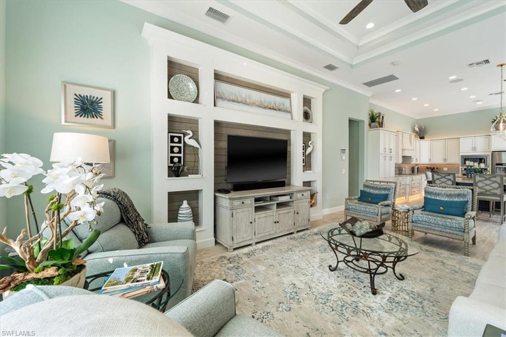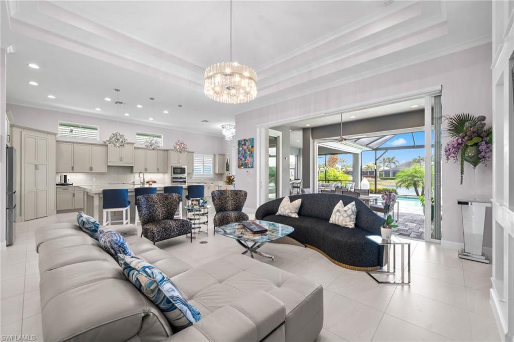 Rarely available, this meticulously maintained Jasmine Grande residence captures expansive private water views from nearly every room. Offering two spacious bedrooms, an office/den, a versatile flex room with wet bar, and 2.5 baths, the home blends everyday comfort with refined living. The impressive great room showcases 14-foot double tray ceilings, crown molding, and abundant natural light—an ideal backdrop for stylish entertaining. Seamlessly connected, the gourmet kitchen is a chef’s delight, featuring stainless steel appliances, granite countertops, and an oversized island with seating for four. A true showpiece, the Eastern-facing screened lanai is designed for relaxation and entertaining alike. Enjoy the sparkling pool, fully equipped outdoor kitchen with grill, and multiple seating areas—all while taking in tranquil water views. Set at the end of a quiet cul-de-sac with water wrapping two sides, the property offers unmatched privacy. Notable upgrades include 10-foot pocketing impact sliders, hurricane screens on the lanai, rich wood and tile flooring, and even an insulated garage door for year-round comfort. Beyond the home, the Isles of Collier Preserve spans 2,400 acres of pristine lakes and nature preserves, offering endless opportunities for recreation. Residents enjoy scenic walking and biking trails, kayaking, paddleboarding, tennis, pickleball, bocce, and a dog park. The community clubhouse features a state-of-the-art fitness center, resort and lap pools, and the inviting Overlook Bar & Grill. Perfectly located just minutes from Old Naples’ shops, dining, and beaches, and moments from the Naples Botanical Garden and acclaimed Naples Pickleball Center, this home offers the ideal blend of luxury, privacy, and vibrant community living.
