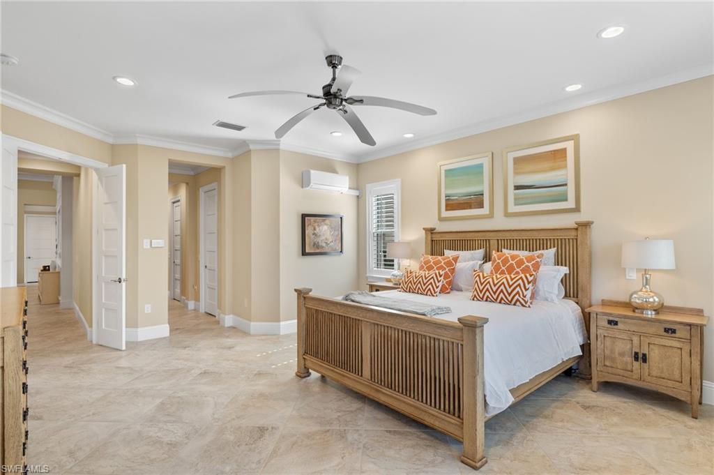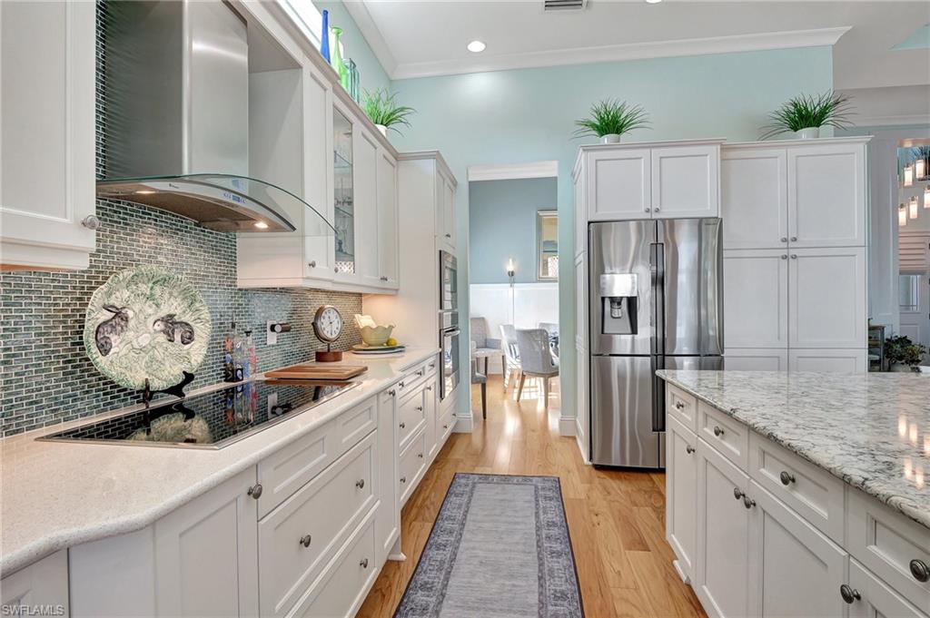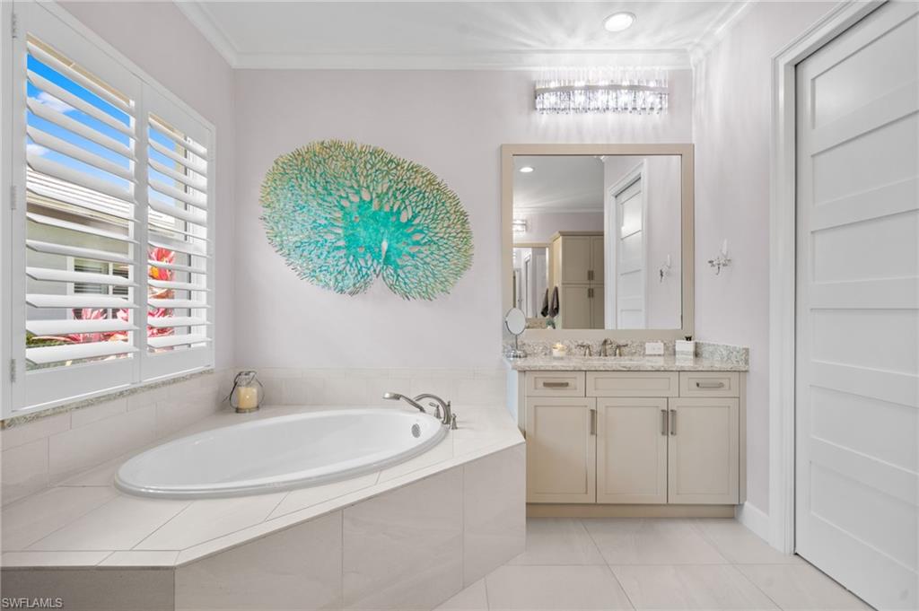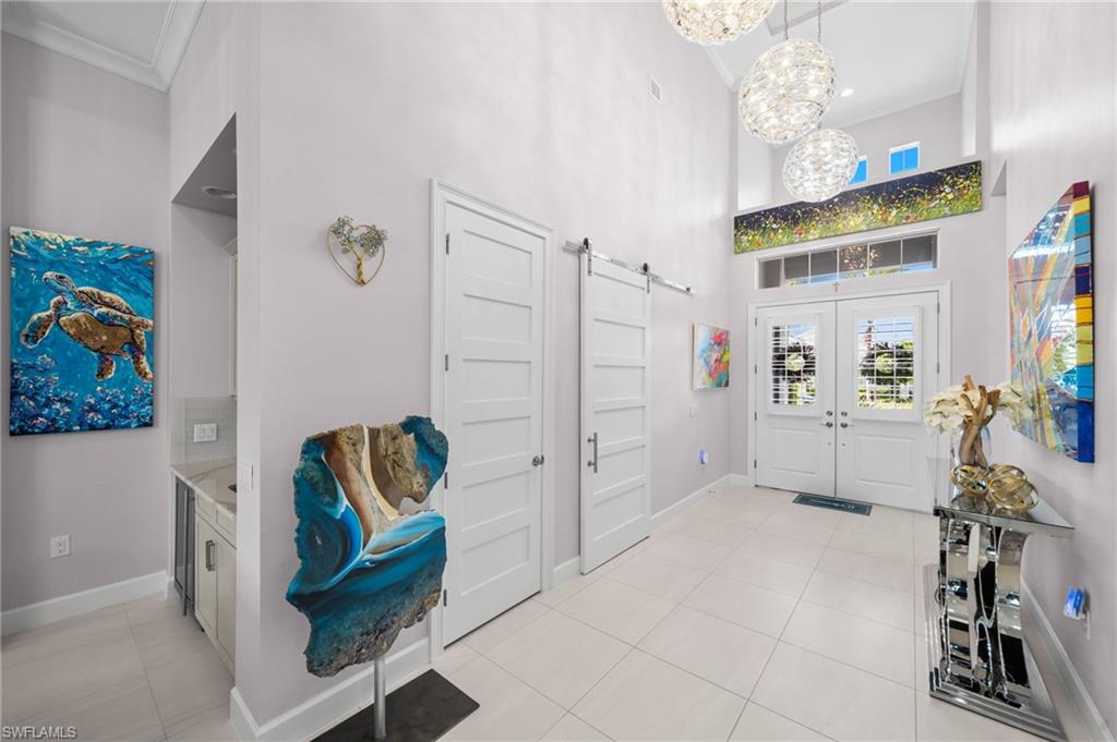 Tucked at the end of a quiet cul-de-sac, this Jasmine Grande claims an oversized pie-shaped homesite that opens to a wide, cinematic water panorama. A monumental, estate-scale Bismarck palm frames SW sunsets over tidal water—a resort-caliber ritual night after night. The coveted southwest orientation stages golden light from morning to evening, turning everyday living into a private-resort experience. Inside, volume ceilings and 10-foot pocketing glass sliders dissolve the boundary between great room and lanai, while a refined kitchen—induction cooktop, double ovens, and a generous island with prep sink—anchors effortless hosting. Texture and tone land in all the right places: crown molding, wood-look tile, plantation shutters, and a custom built-in entertainment wall. Outdoor living is the showpiece: a custom heated saltwater pool & spa wrapped in travertine, an outdoor shower, and an upgraded summer kitchen with new hood and a striking back-painted glass backsplash set the scene for long, languid afternoons. Thoughtful updates deliver peace of mind—impact windows & doors, electric shutters, newer A/C, water heater, washer/dryer, and pool pump—while fresh interior/exterior paint and landscaping with uplighting make the evenings glow. The garage is fully insulated and upgraded with a split-level A/C unit designed to safeguard your vehicles and possessions in any season. Positioned near the community’s signature amenities, the home enjoys effortless access to the Isles of Collier Preserve’s resort environment: resort and lap pools, state-of-the-art fitness, tennis, pickleball, bocce, the Overlook Bar & Grill, and miles of scenic paths and boardwalks through a celebrated natural setting. All of it just a short drive to Marco Island, Fifth Avenue South, and Naples’ sugar-sand coastline. A water-view residence that lives like a perpetual luxury getaway—curated, quiet, and beautifully tuned to the light.