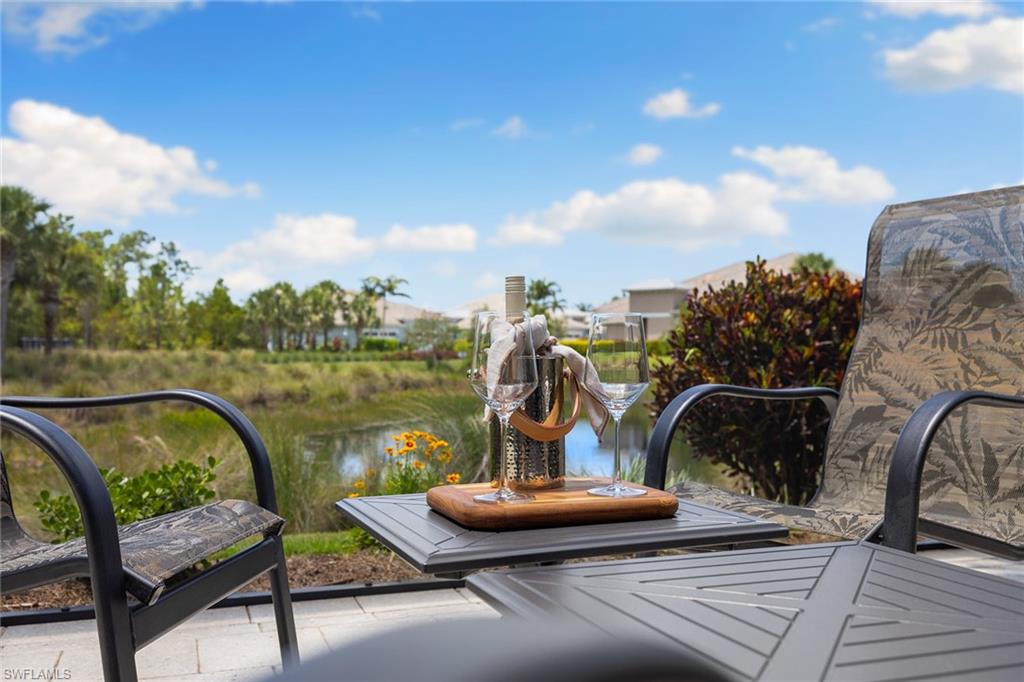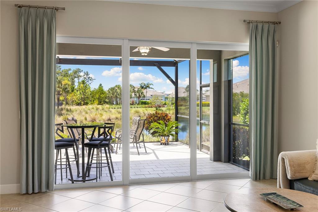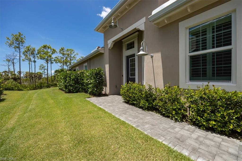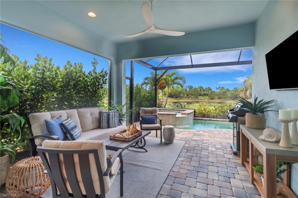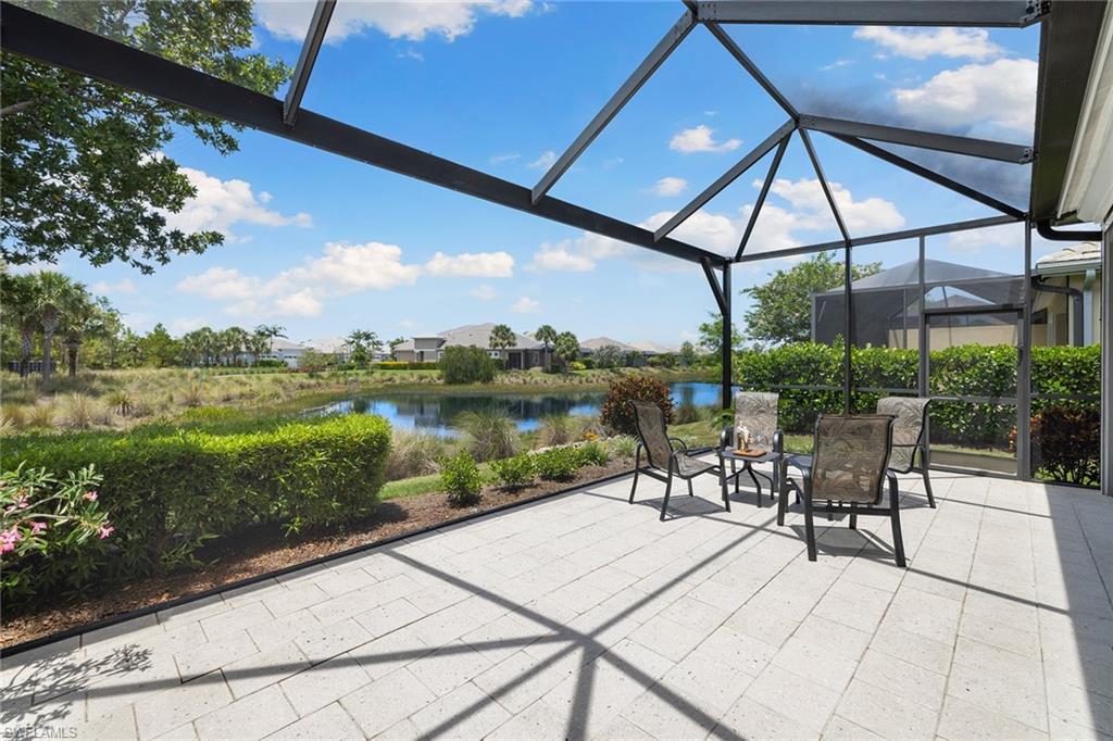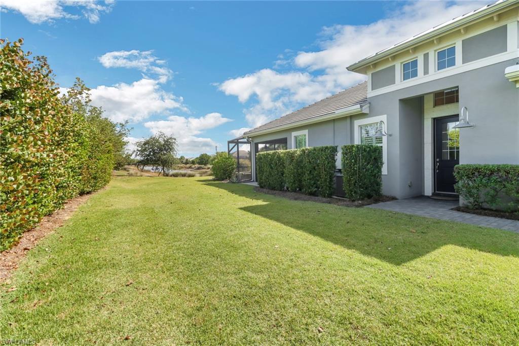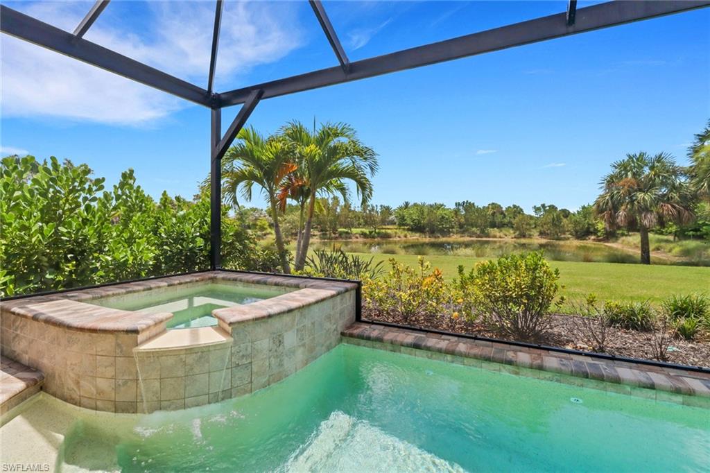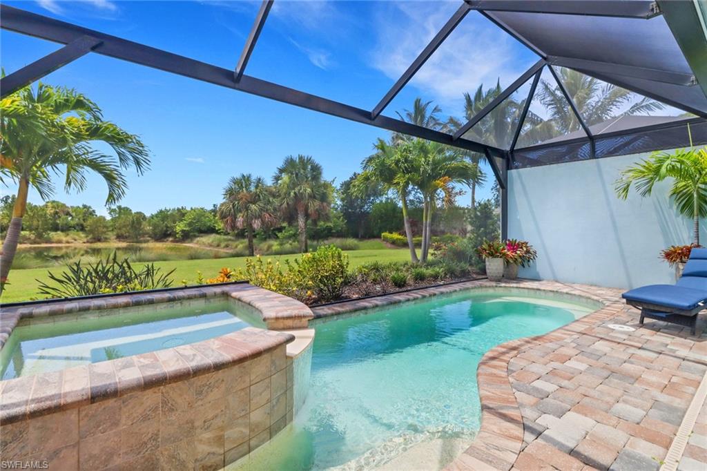 Experience resort-style living at the Isles of Collier Preserve in this elegantly appointed Dahlia model villa, set on a quiet cul-de-sac with a spacious, pie-shaped lot that widens toward the rear for enhanced privacy, generous backyard and stunning southern water views. For the Dahlia’s left-side front door entry, this lot is truly one of a kind! Beautifully maintained and offered substantially furnished, this home features two bedrooms plus a large den that can easily function as a third bedroom. The open-concept layout is ideal for both entertaining and everyday living, showcasing custom upgrades such as crown molding, plantation shutters, luxurious waterproof vinyl flooring, designer ceiling fans, upscale light fixtures, and a dramatic double tray ceiling. The kitchen boasts a chef’s island, French door refrigerator, a sleek black single bowl sink with matching faucet and cabinet hardware and a Purity Bay reverse osmosis water purification system. Additional features include hurricane impact windows and doors, motorized privacy shades on sliding doors, electric hurricane shutters, and “noseeum” screens on the lanai for added comfort and security. Step outside to enjoy the sparkling pool with waterfall hot tub, perfect for cooling off on warm afternoons or relaxing under the stars. Located just minutes from Naples 5th and 3rd avenues, you'll enjoy quick access to world-class shopping, dining, entertainment, and the Gulf’s pristine beaches. The Isles is an amenity-rich community with a grand clubhouse, state of the art fitness center, resort style walk-in pool, lap pool, spa, saunas, tennis, 12 pickle-ball courts, boccie, hiking, biking, kayak launch, dog parks and a full calendar of events, concerts and social gatherings. Don't miss your chance to own this stunning villa in one of Naples’ most sought after communities – schedule your private showing today!