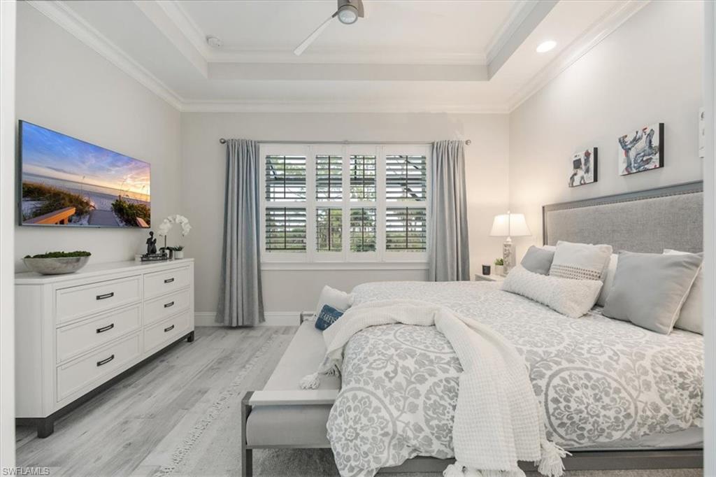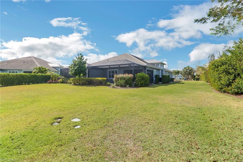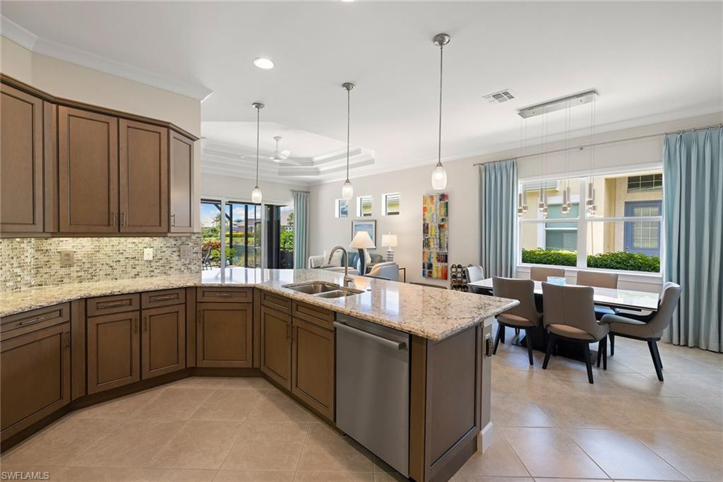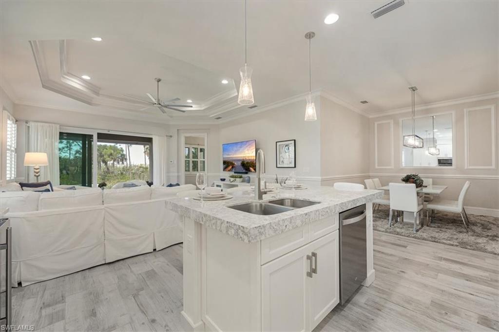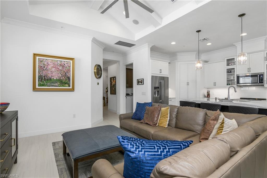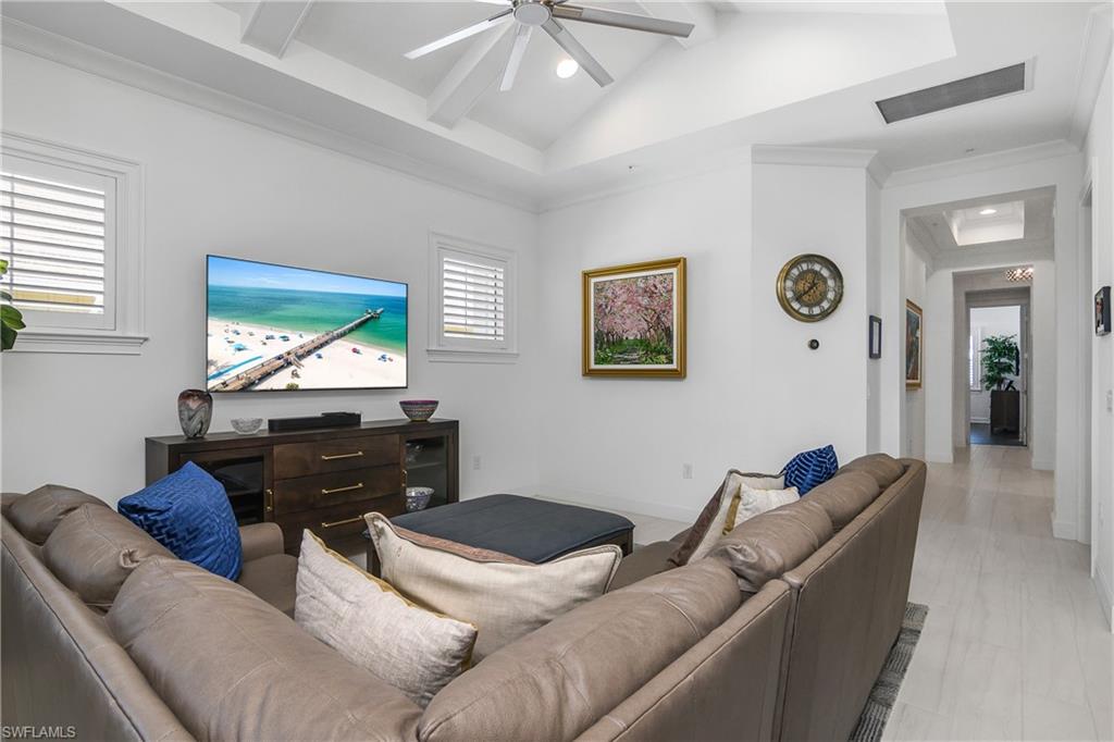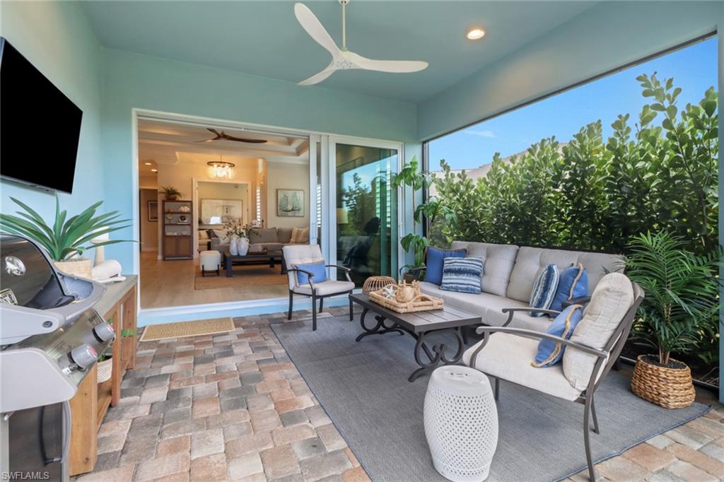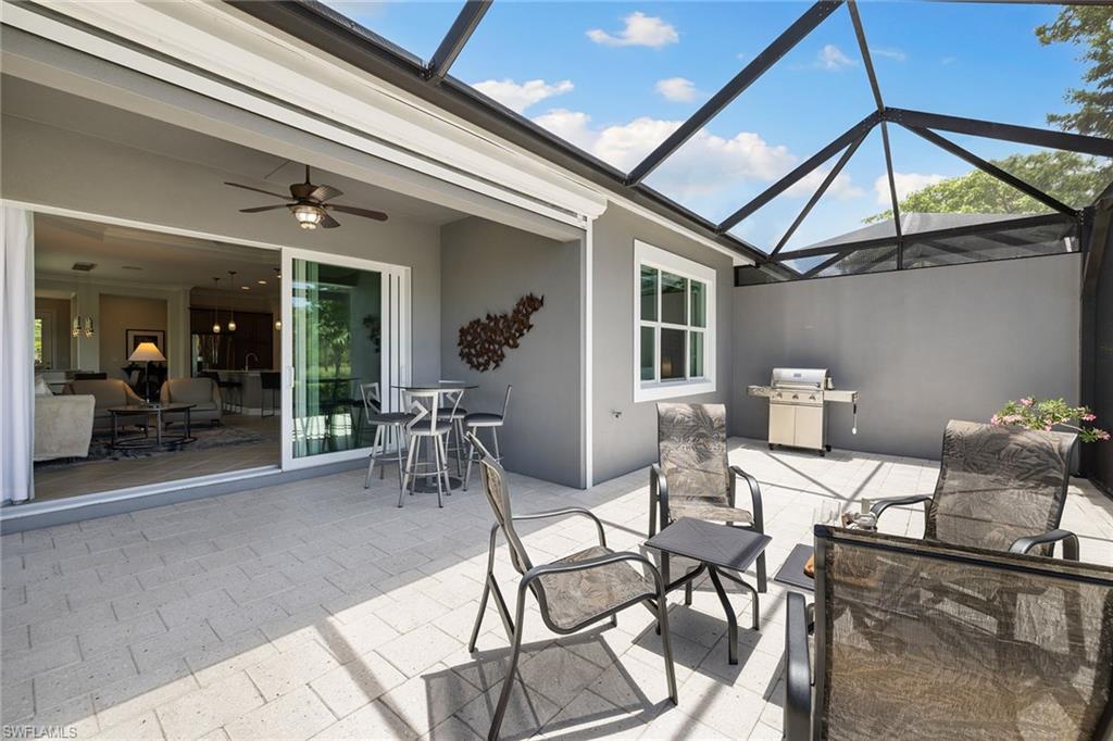 Experience resort-style living at the Isles of Collier Preserve in this elegantly appointed Dahlia model villa, set on a quiet cul-de-sac with a spacious, pie-shaped lot that widens toward the rear for enhanced privacy, generous backyard and stunning southern water views. For the Dahlia’s left-side front door entry, this lot is truly one of a kind! Beautifully maintained and offered substantially furnished, this home features two bedrooms plus a large den that can easily function as a third bedroom. The open-concept layout is ideal for both entertaining and everyday living, showcasing custom upgrades such as crown molding, plantation shutters, luxurious waterproof vinyl flooring, designer ceiling fans, upscale light fixtures, and a dramatic double tray ceiling. The kitchen boasts a chef’s island, French door refrigerator, a sleek black single bowl sink with matching faucet and cabinet hardware and a Purity Bay reverse osmosis water purification system. Additional features include hurricane impact windows and doors, motorized privacy shades on sliding doors, electric hurricane shutters, and “noseeum” screens on the lanai for added comfort and security. Step outside to enjoy the sparkling pool with waterfall hot tub, perfect for cooling off on warm afternoons or relaxing under the stars. Located just minutes from Naples 5th and 3rd avenues, you'll enjoy quick access to world-class shopping, dining, entertainment, and the Gulf’s pristine beaches. The Isles is an amenity-rich community with a grand clubhouse, state of the art fitness center, resort style walk-in pool, lap pool, spa, saunas, tennis, 12 pickle-ball courts, boccie, hiking, biking, kayak launch, dog parks and a full calendar of events, concerts and social gatherings. Don't miss your chance to own this stunning villa in one of Naples’ most sought after communities – schedule your private showing today!