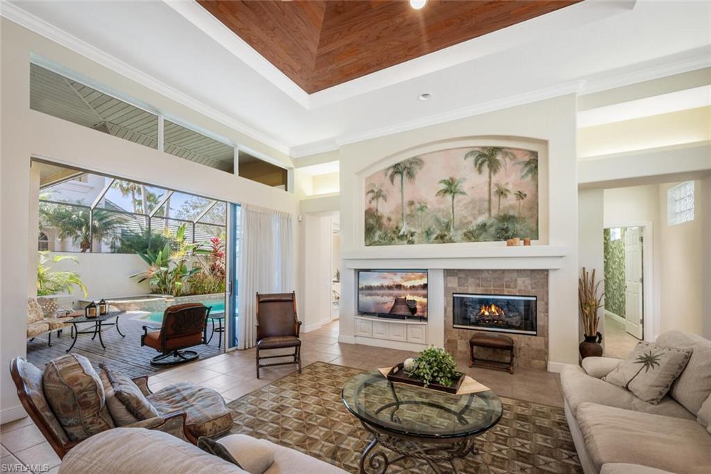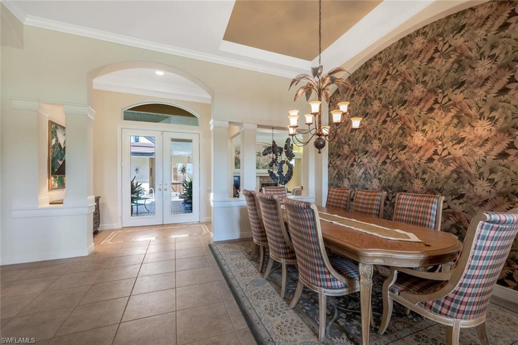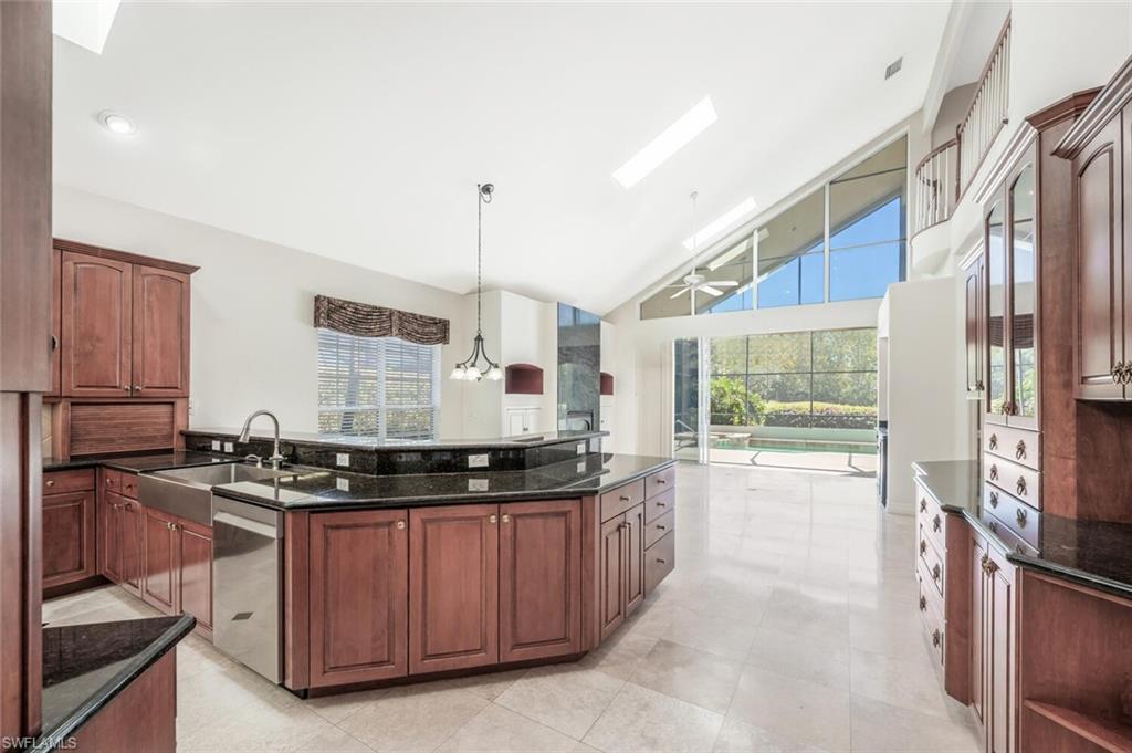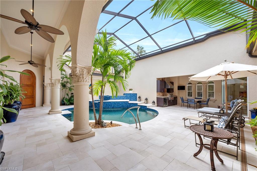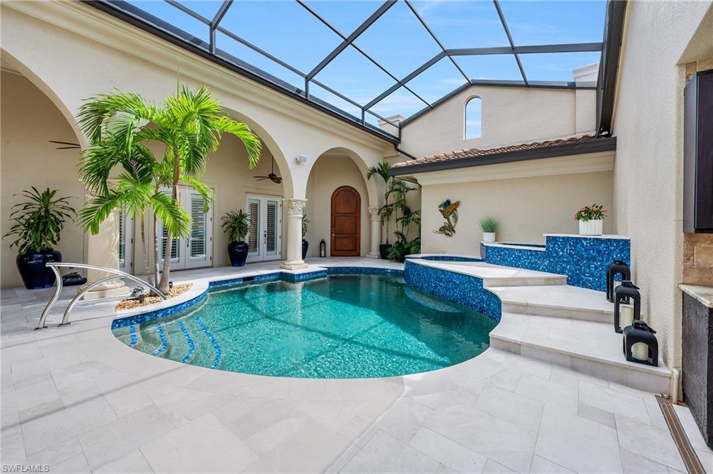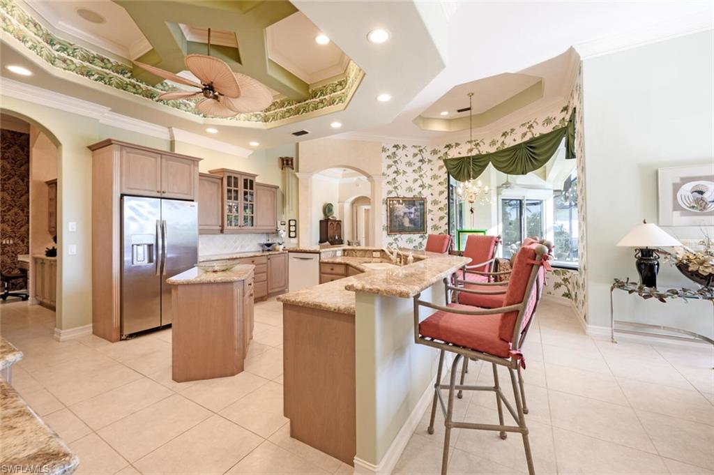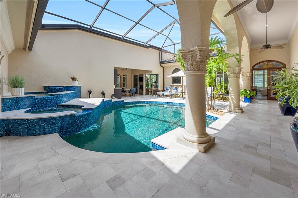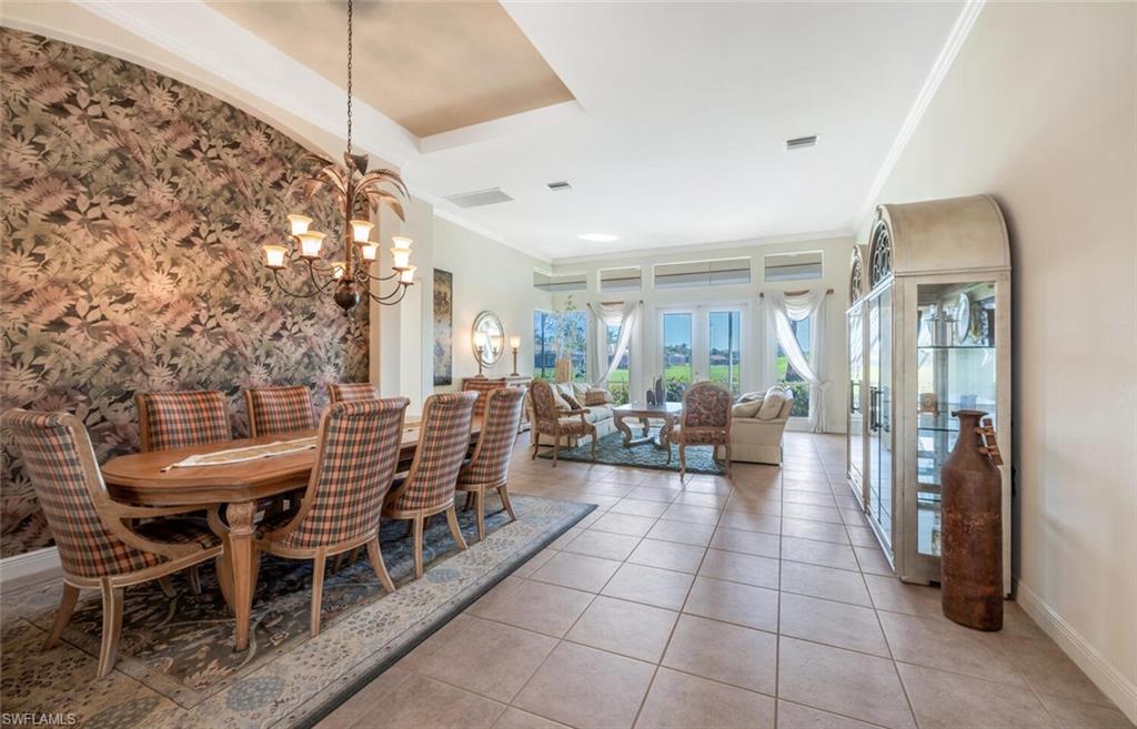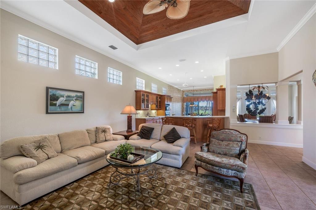 Regal in design and grand in proportion, this residence exemplifies timeless architectural beauty and offers a remarkable foundation for personalization. Perfectly positioned on a prime lakefront lot, the circular brick-paver driveway, manicured landscaping, and stately façade set the stage for what awaits within—soaring ceilings, exquisite mosaic inlay tile details, and walls of glass that showcase breathtaking lake views and bathe the interiors in natural light. The grand foyer transitions seamlessly into the formal living room, where tray ceilings elevate the residence’s sense of scale and sophistication. The spacious kitchen is a dream layout to modernize, featuring a large island, wraparound breakfast bar, and abundant cabinetry. Just off the kitchen lies a bar area additional cabinetry, and a wine cooler—perfectly positioned within view of the formal dining room, making it ideal for entertaining guests or hosting grand fêtes. The kitchen offers an eat-in dining area attached to a large Great room provide inviting spaces for casual dining and relaxed gatherings, all overlooking the lanai and lake beyond. Corner pocketing sliders open to the screened lanai, where a sparkling pool is surrounded by both undercover lounging areas for shaded comfort and open-air spaces for sunbathing. The primary suite continues the theme of elegance, offering private lanai access, mosaic inlay tile accents, and a sprawling ensuite bath with a luxurious pass-through “car wash” shower, soaking tub, dual vanities, and makeup station. The guest rooms, too, are given the attention they deserve, including a guest suite with French doors and a walk-in closet, along with additional spacious bedrooms that ensure comfort and privacy for family and guests alike. Ideally located within Kensington Golf & Country Club, just minutes from Mercato, Waterside Shops, the Naples Philharmonic, and Gulf beaches, this home offers fantastic bones, timeless appeal, and enduring architectural character—a rare opportunity to refresh a classic or reinvent it for modern living.