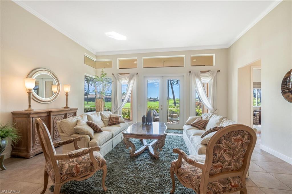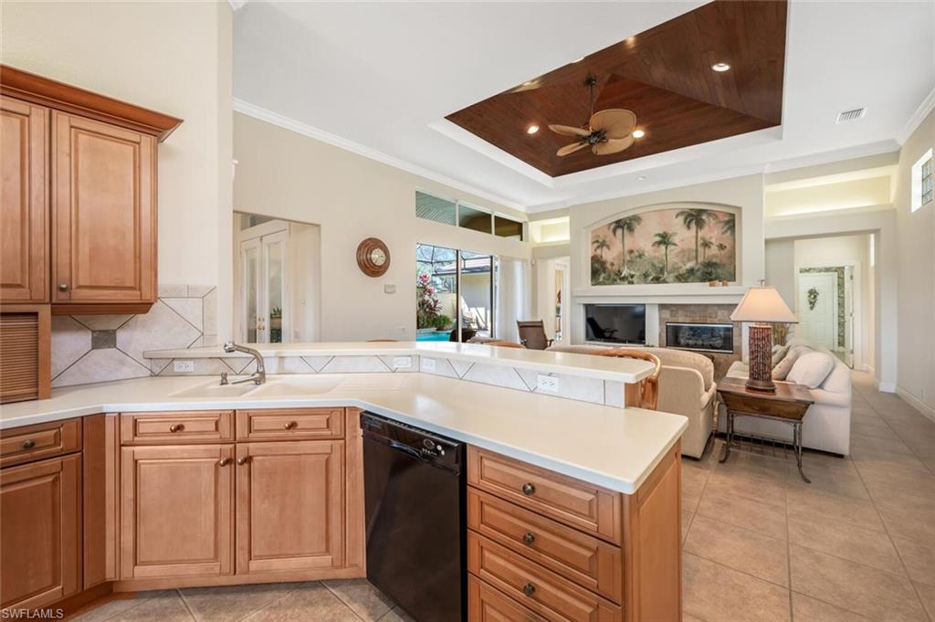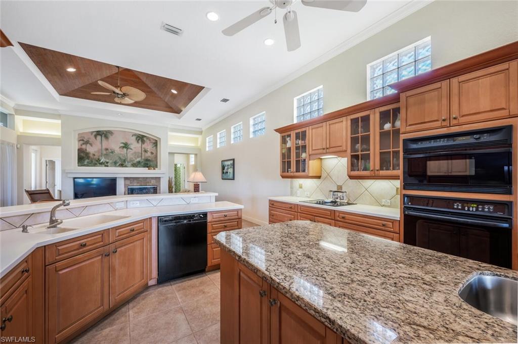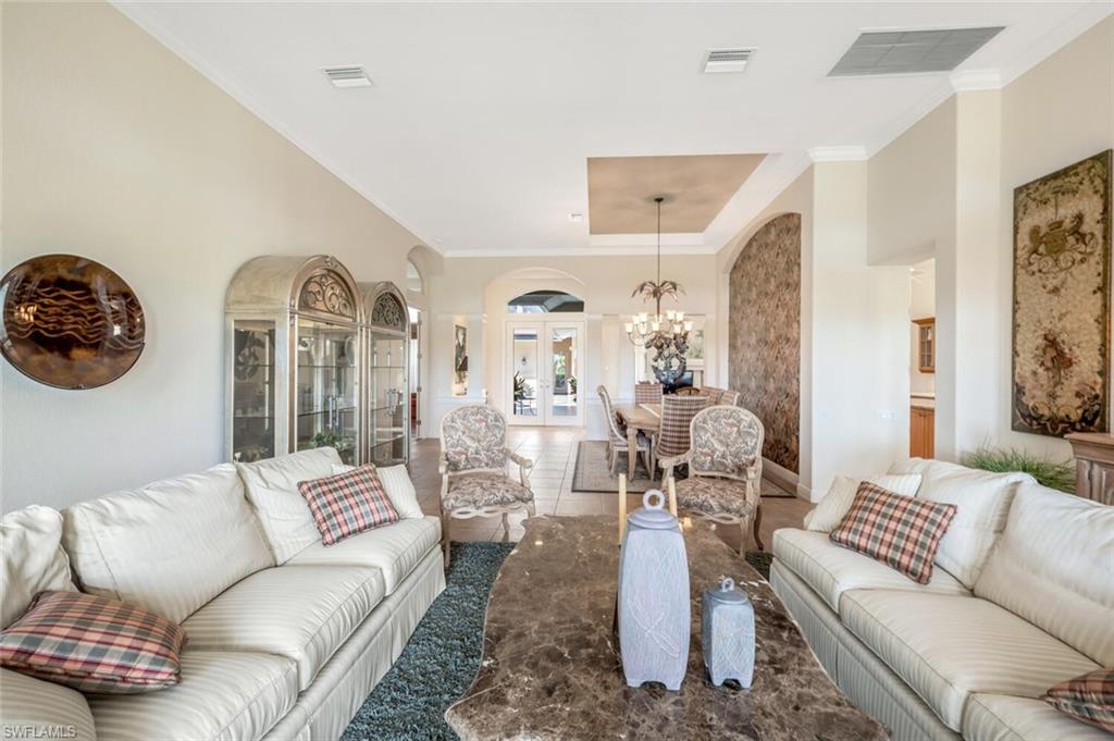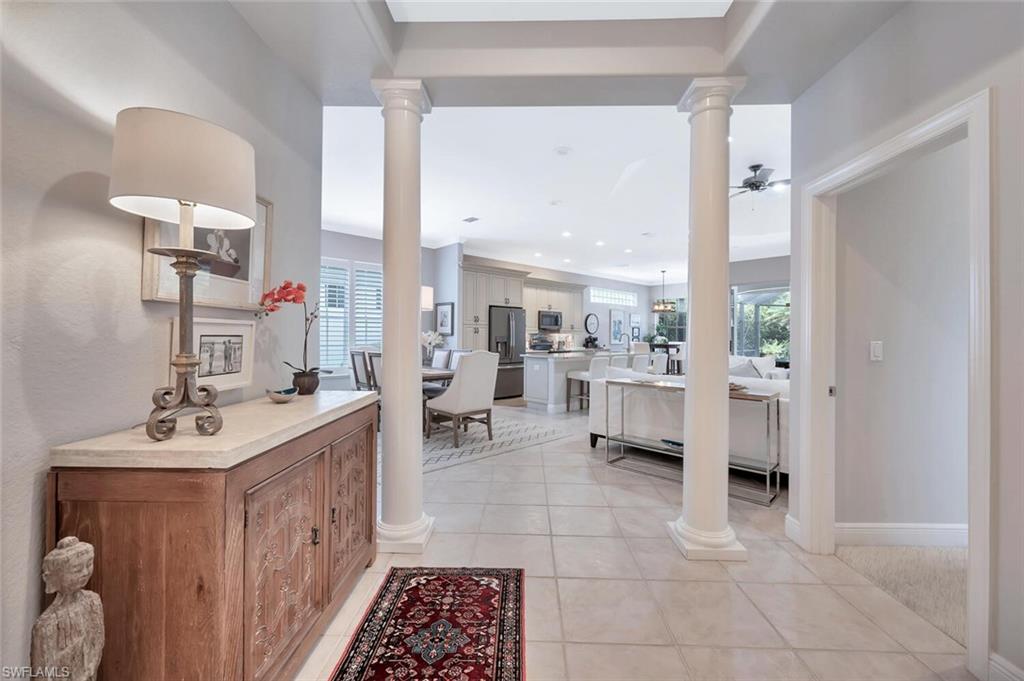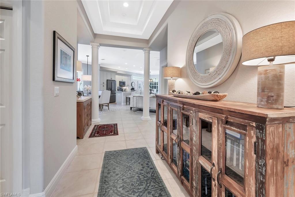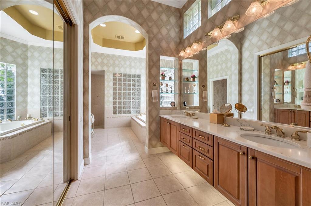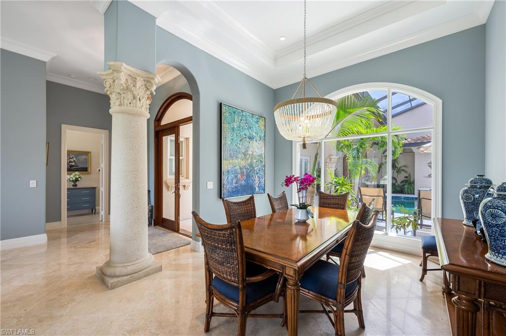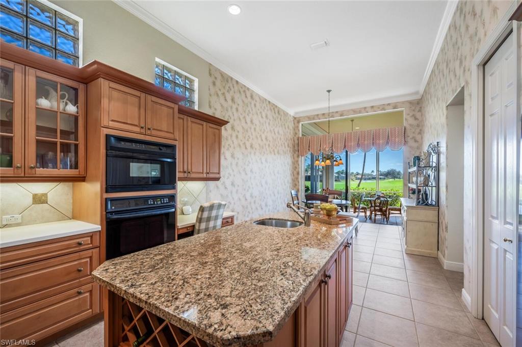 Regal in design and grand in proportion, this residence exemplifies timeless architectural beauty and offers a remarkable foundation for personalization. Perfectly positioned on a prime lakefront lot, the circular brick-paver driveway, manicured landscaping, and stately façade set the stage for what awaits within—soaring ceilings, exquisite mosaic inlay tile details, and walls of glass that showcase breathtaking lake views and bathe the interiors in natural light. The grand foyer transitions seamlessly into the formal living room, where tray ceilings elevate the residence’s sense of scale and sophistication. The spacious kitchen is a dream layout to modernize, featuring a large island, wraparound breakfast bar, and abundant cabinetry. Just off the kitchen lies a bar area additional cabinetry, and a wine cooler—perfectly positioned within view of the formal dining room, making it ideal for entertaining guests or hosting grand fêtes. The kitchen offers an eat-in dining area attached to a large Great room provide inviting spaces for casual dining and relaxed gatherings, all overlooking the lanai and lake beyond. Corner pocketing sliders open to the screened lanai, where a sparkling pool is surrounded by both undercover lounging areas for shaded comfort and open-air spaces for sunbathing. The primary suite continues the theme of elegance, offering private lanai access, mosaic inlay tile accents, and a sprawling ensuite bath with a luxurious pass-through “car wash” shower, soaking tub, dual vanities, and makeup station. The guest rooms, too, are given the attention they deserve, including a guest suite with French doors and a walk-in closet, along with additional spacious bedrooms that ensure comfort and privacy for family and guests alike. Ideally located within Kensington Golf & Country Club, just minutes from Mercato, Waterside Shops, the Naples Philharmonic, and Gulf beaches, this home offers fantastic bones, timeless appeal, and enduring architectural character—a rare opportunity to refresh a classic or reinvent it for modern living.