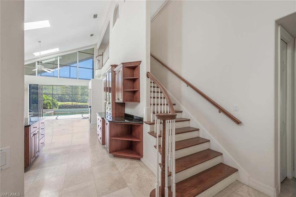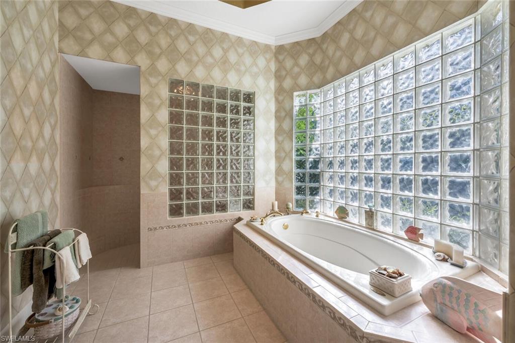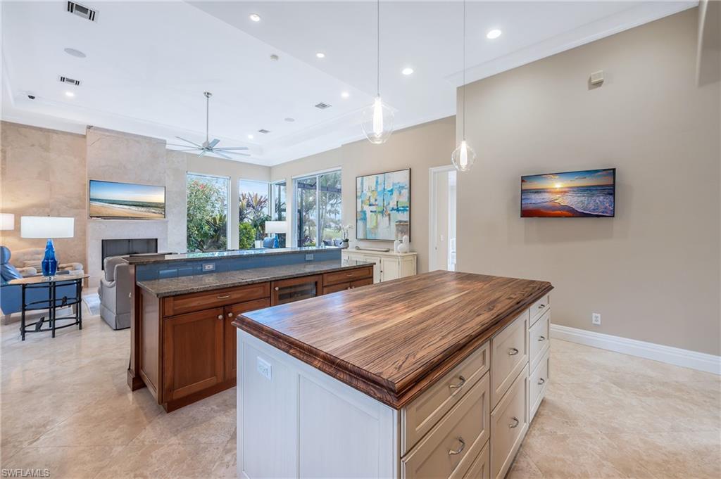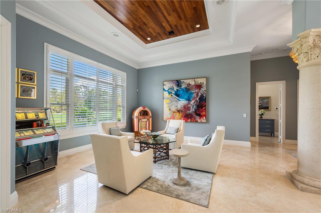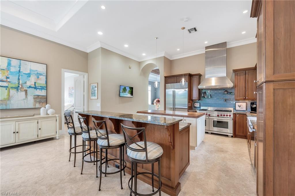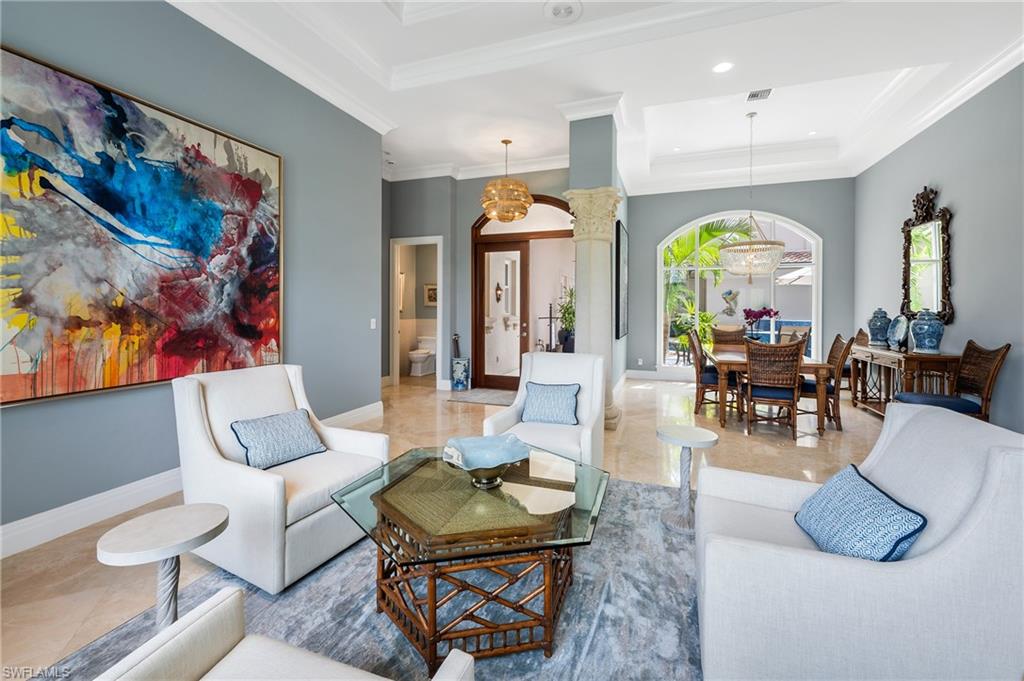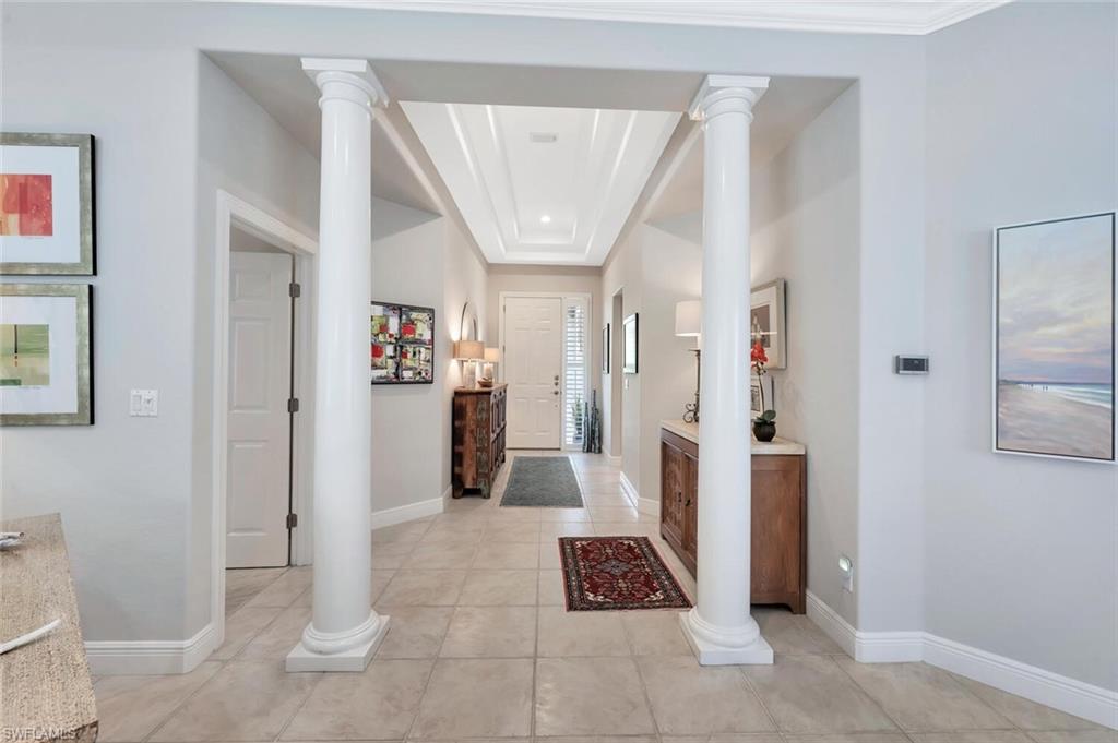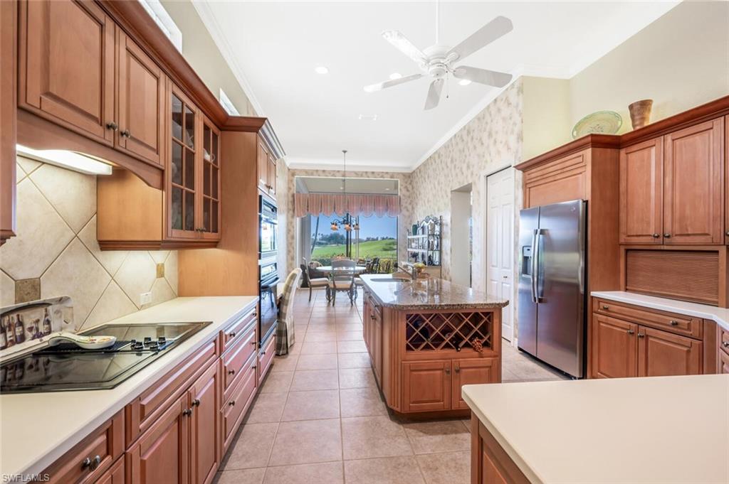 Regal in design and grand in proportion, this residence exemplifies timeless architectural beauty and offers a remarkable foundation for personalization. Perfectly positioned on a prime lakefront lot, the circular brick-paver driveway, manicured landscaping, and stately façade set the stage for what awaits within—soaring ceilings, exquisite mosaic inlay tile details, and walls of glass that showcase breathtaking lake views and bathe the interiors in natural light. The grand foyer transitions seamlessly into the formal living room, where tray ceilings elevate the residence’s sense of scale and sophistication. The spacious kitchen is a dream layout to modernize, featuring a large island, wraparound breakfast bar, and abundant cabinetry. Just off the kitchen lies a bar area additional cabinetry, and a wine cooler—perfectly positioned within view of the formal dining room, making it ideal for entertaining guests or hosting grand fêtes. The kitchen offers an eat-in dining area attached to a large Great room provide inviting spaces for casual dining and relaxed gatherings, all overlooking the lanai and lake beyond. Corner pocketing sliders open to the screened lanai, where a sparkling pool is surrounded by both undercover lounging areas for shaded comfort and open-air spaces for sunbathing. The primary suite continues the theme of elegance, offering private lanai access, mosaic inlay tile accents, and a sprawling ensuite bath with a luxurious pass-through “car wash” shower, soaking tub, dual vanities, and makeup station. The guest rooms, too, are given the attention they deserve, including a guest suite with French doors and a walk-in closet, along with additional spacious bedrooms that ensure comfort and privacy for family and guests alike. Ideally located within Kensington Golf & Country Club, just minutes from Mercato, Waterside Shops, the Naples Philharmonic, and Gulf beaches, this home offers fantastic bones, timeless appeal, and enduring architectural character—a rare opportunity to refresh a classic or reinvent it for modern living.