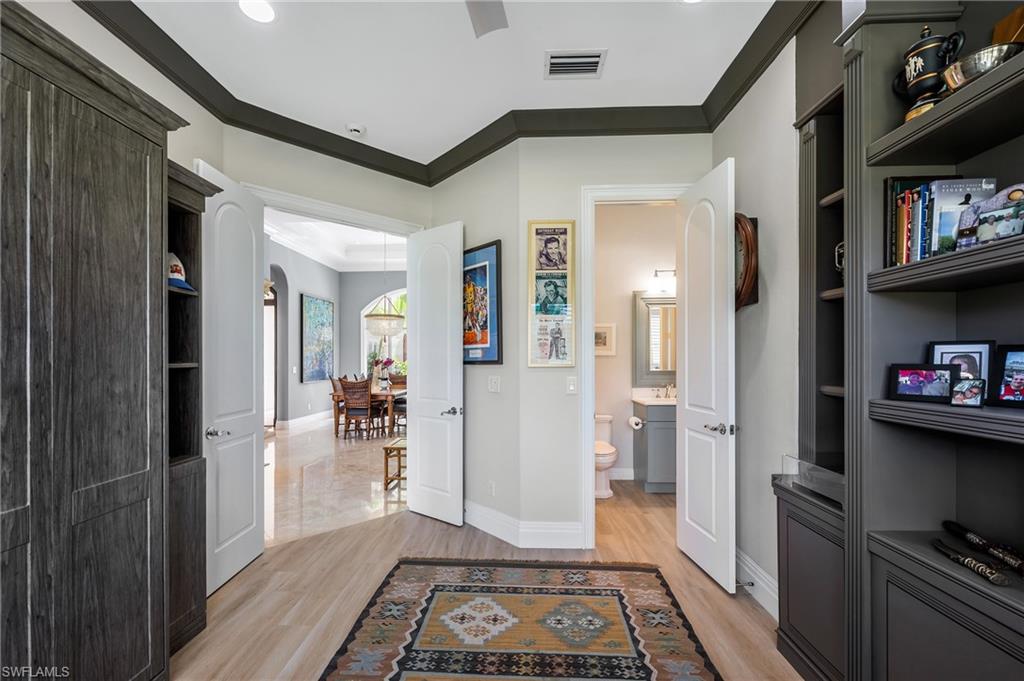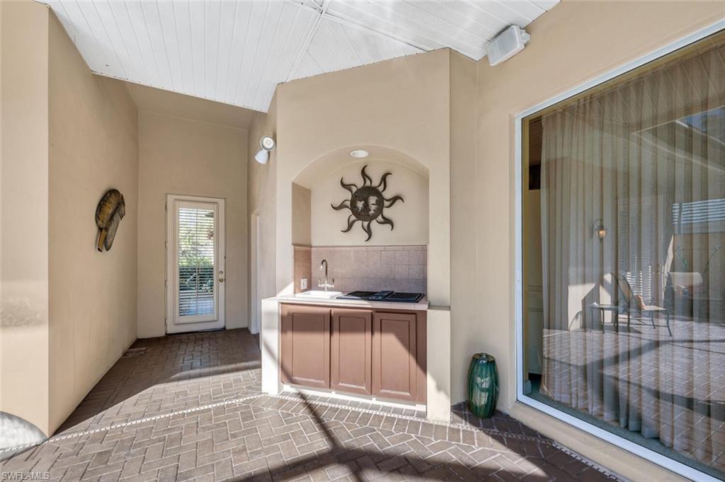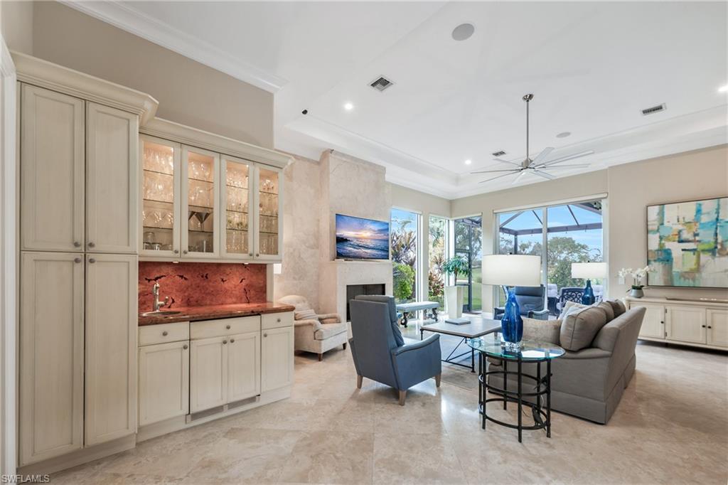 An extraordinary residence awaits in Kensington Country Club, perfectly positioned on the #4 Signature Hole. Beyond the grand Mahogany front door, an updated courtyard oasis welcomes you, where a fully renovated saltwater pool and spa, complemented by an outdoor kitchen, create a serene retreat that sets the tone for the artful craftsmanship and luxurious living that unfolds throughout this stunning 3-bed-plus-den, 3.5-bath home. The formal living room captivates with a distinctive fifth-wall teak plank accent, creating an inviting and refined ambiance. Walls of windows usher in natural light, seamlessly blending indoor and outdoor living while offering uninterrupted views of the greens through the newly added picture frame screen enclosure on the second lanai. This space feels like a front-row seat to the golf course, where western exposure provides majestic sunsets as the day fades over the fairway. The gourmet kitchen is a visual and functional masterpiece designed to delight even the most discerning chef. It's both stylish and practical, outfitted with high-end appliances, including Sub Zero Refrigerator, Wolf gas cooktop/range, Wolf Microwave, custom cherry wood cabinetry, and a striking zebra wood island with 2 refrigerated drawers and extra storage. Thoughtful additions like a pot filler, glass subway tile backsplash, and a wine cooler elevate the culinary experience. Adjacent to the kitchen, a wet bar enhances the home's entertaining appeal. Designed for comfort and versatility, the home features two separate living areas—a formal living room and Dining room and Kitchen Great Room with a gas fireplace for cozy evenings. The primary suite is a sanctuary of serenity, showcasing a comprehensive bathroom renovation with modern fixtures, elegant finishes, a massive walk-in shower with intricate tilework, multiple shower heads, and a freestanding soaking tub. The versatile office/den, featuring Custom Cabinetry, a Murphy bed and access to a Jack and Jill bathroom shared with added third bedroom, provides flexible sleeping space and can easily convert to a fourth bedroom, while the private casita off the pool creates an exclusive VIP retreat for guests. Recent impressive updates continue throughout, including the renovation of all bathrooms, a primary bedroom refresh, complete interior and ceiling painting, freshly painted exteriors, and new garage doors with sleek epoxy flooring. The courtyard area and pool were completely renovated, the back lanai sports new Leathered Marble and both areas have newly enclosed with super screens. Embrace a lifestyle of luxury and timeless beauty in this extraordinary Kensington estate.