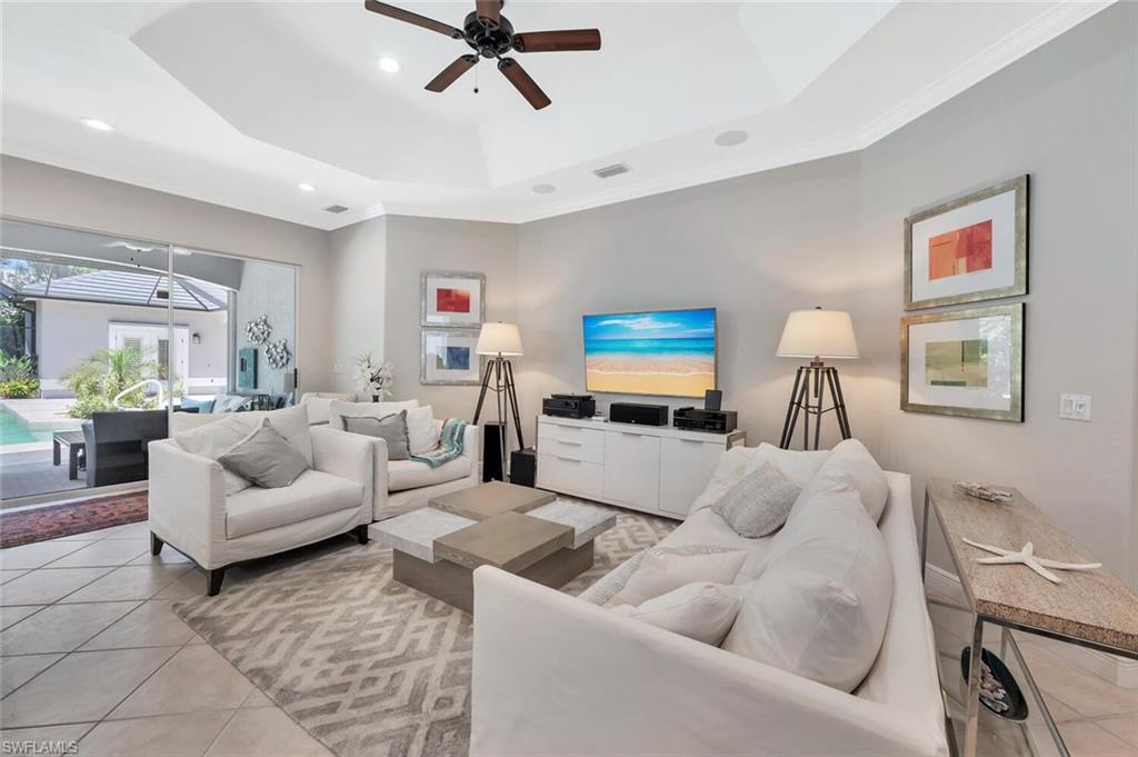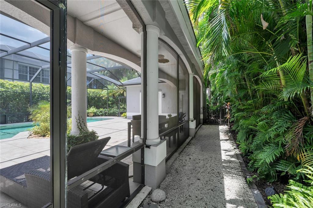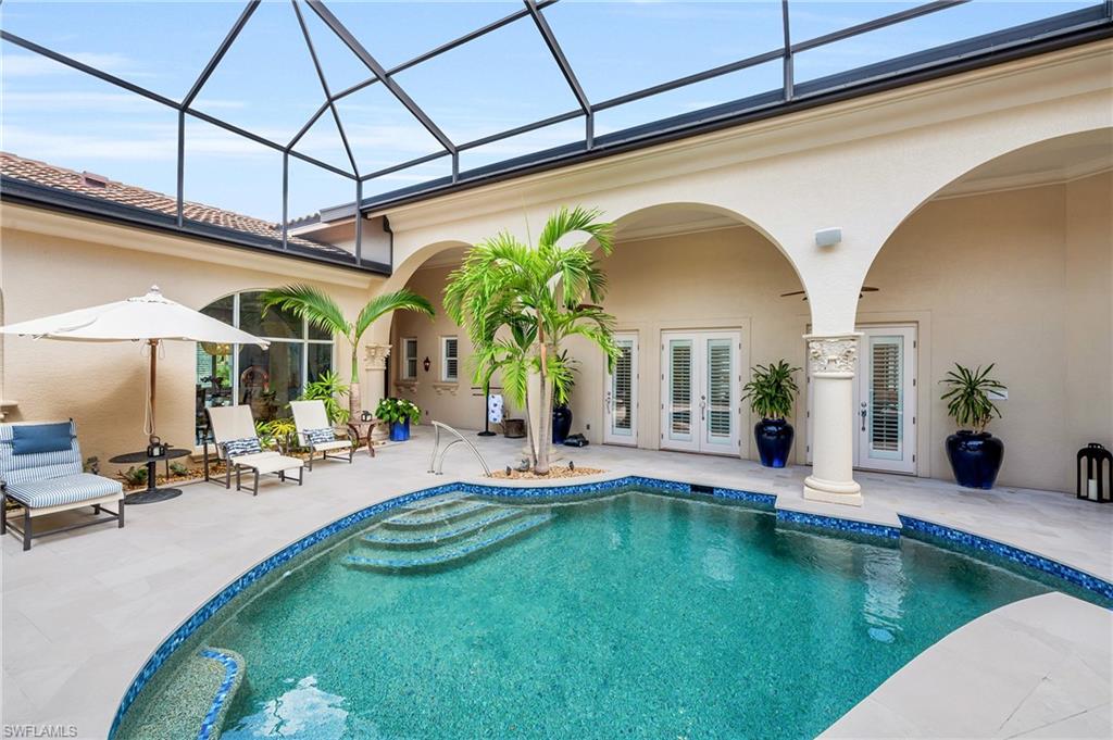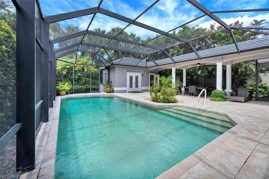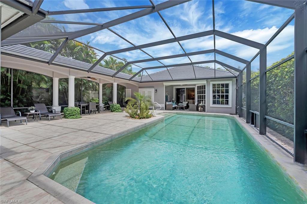 All the elements of a dream home come together in this light and airy Kensington retreat, where a timeless motif meets contemporary flair and a 2024 roof adds peace of mind. This 3-bed plus den, 3-bath residence boasts an open floor plan bathed in natural light and framed by tropical views, creating an inviting setting for both everyday living and entertaining. Multiple dining areas—indoors and out—make hosting effortless, while the layout flows seamlessly to the outdoors for true indoor–outdoor living. The spacious primary suite offers its own private entrance to the lanai, allowing you to slip outside for a morning swim or an evening under the stars. The ensuite bath provides a spa-like experience with elegant finishes and thoughtful design, making it the perfect place to unwind. A guest room and flexible den provide versatility for family, work, or hobbies, with the generously sized den offering potential for additional sleeping space. A rare guest cabana—complete with its own private entrance, living area, and full bath—offers ideal accommodations for visitors, extended family, or a private office. Outdoors, a large southern-exposure pool and sprawling screened lanai deliver the perfect blend of sun-soaked lounging and shaded comfort, all set against a lush tropical backdrop. This residence offers exceptional privacy and an unbeatable central Naples location—minutes from world-class shopping, dining, Artis–Naples, Sugden Theatre, and pristine Gulf beaches. Welcome to your private oasis in the heart of it all.