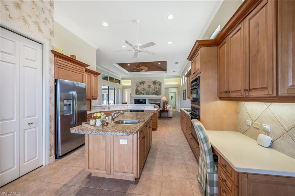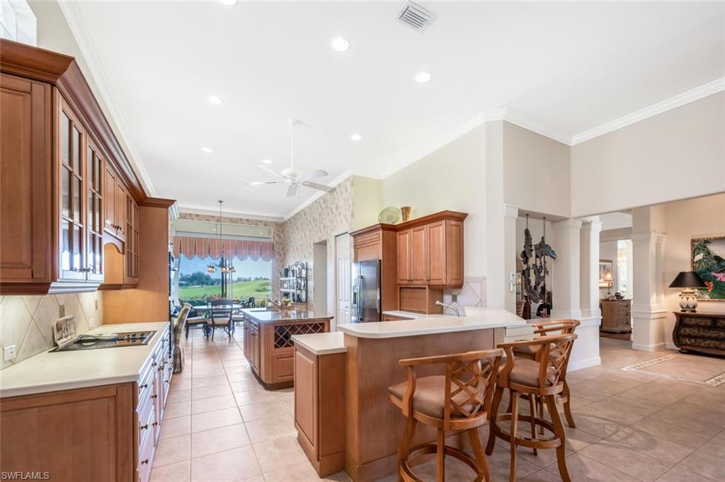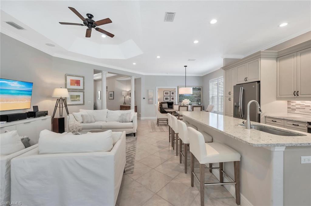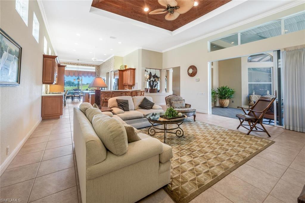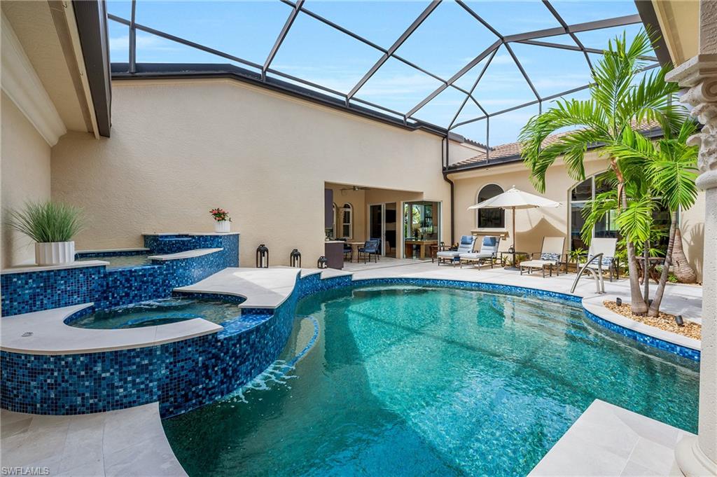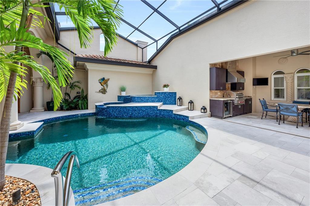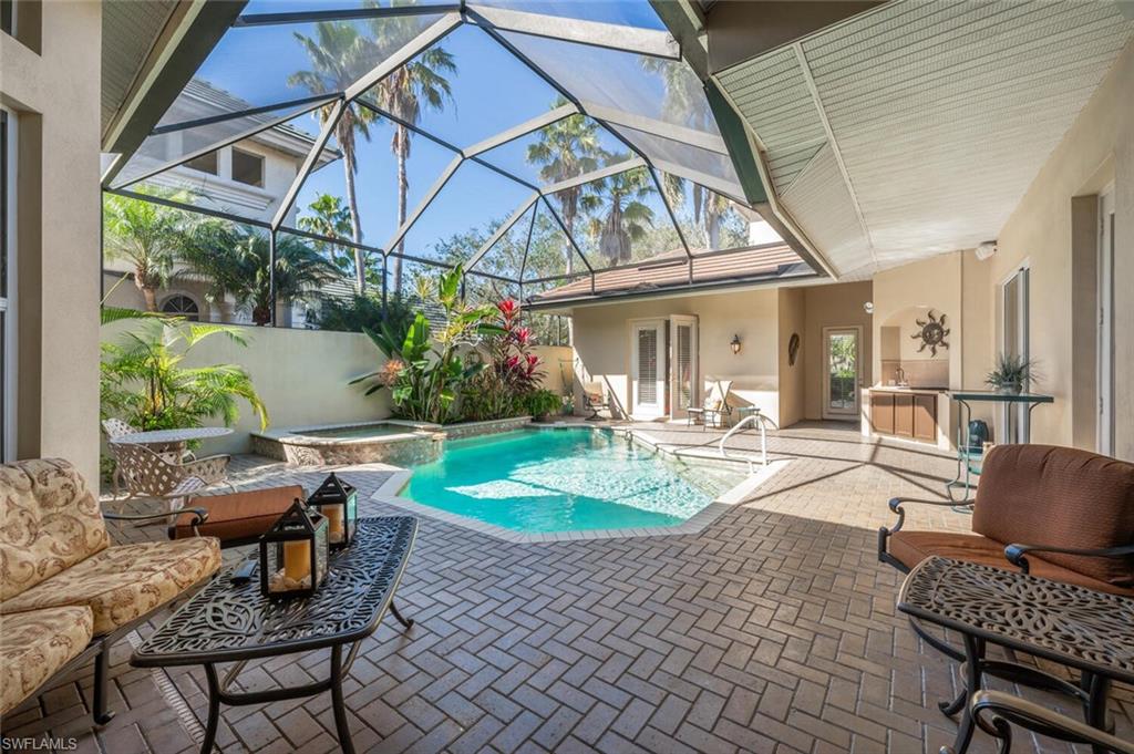 From the moment you enter the gated community of Kensington Golf & Country Club, you’re transported to a private resort. Surrounded by breathtaking landscapes, shimmering lakes, and 18 holes of championship golf, this exclusive enclave offers optional world-class amenities and a lifestyle like no other. Positioned along the 16th fairway, this stunning 3,580 sq ft residence effortlessly blends sophistication with comfort. Featuring 4 bedrooms + a den, home office, 3 ensuite bathrooms, and a powder room, the thoughtfully designed open layout is ideal for both everyday living and elegant entertaining. At the heart of the home is a gourmet kitchen outfitted with new stainless steel appliances, abundant cabinetry, and an island, extended breakfast bar—perfect for gatherings and casual dining. The main living spaces showcase tile flooring throughout, with newer wood flooring in all bedrooms for added warmth and elegance. Seamless indoor-outdoor living is made easy with 5-panel recessed sliders that open completely to a panoramic view of the golf course and your private outdoor oasis. The lanai features a new travertine tile surface, new custom tiled pool and spa, a brand new pool heater, outdoor kitchen and an expansive undercover seating area—creating the ultimate space for alfresco dining, lounging, and entertaining. The luxurious primary suite with sitting area offers direct lanai access and includes a spa-like bathroom with a large walk-in shower, jacuzzi tub, and dual vanities. All guest bedrooms include their own ensuite baths for complete comfort and privacy. Add to this a whole house generator, new pool heater, gas for the pool, jacuzzi and cooking, new landscaping and interior painting. The list keeps going...A BRAND NEW ROOF TO BE INSTALLED, COMPLETION TO BE DONE PRIOR TO CLOSING. As a Kensington resident, you have optional membership offering luxurious amenities, including a newly renovated multi-million clubhouse, restaurants, a resort style swimming pool, state-of-the-art fitness facility, har-tru tennis courts, pickleball and bocce courts. Kensington Golf & Country Club is more than a club, it is a lifestyle whether relaxing, recreation or social gatherings. This home delivers the best of Naples living - quality, upgrades, location and value.