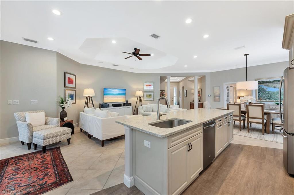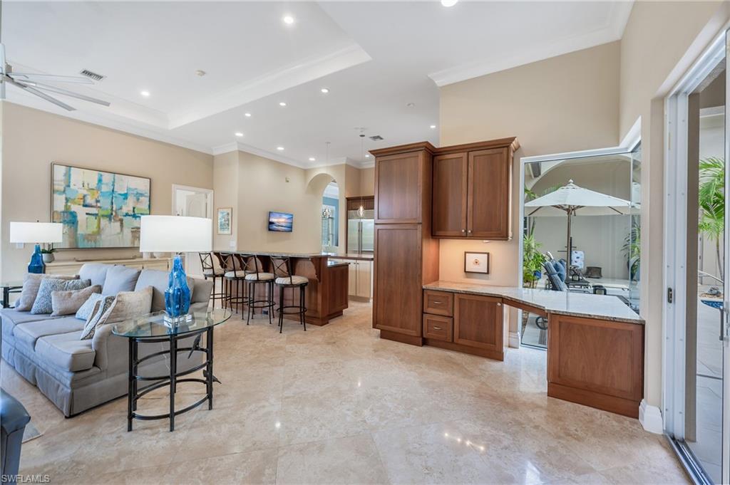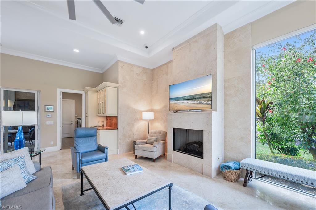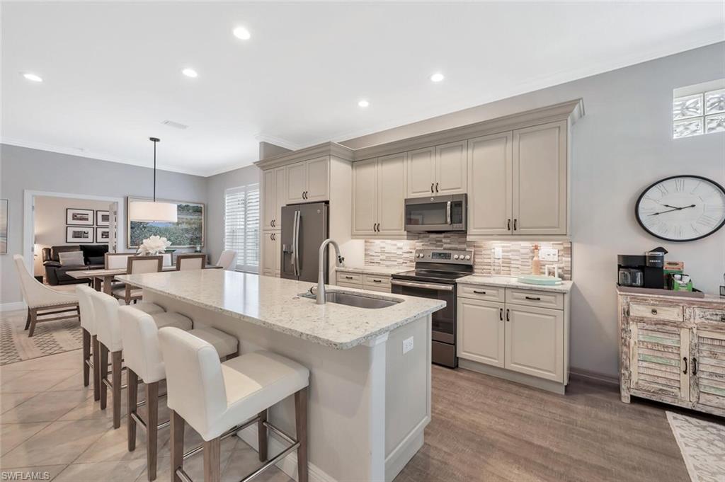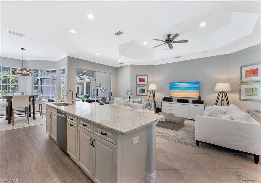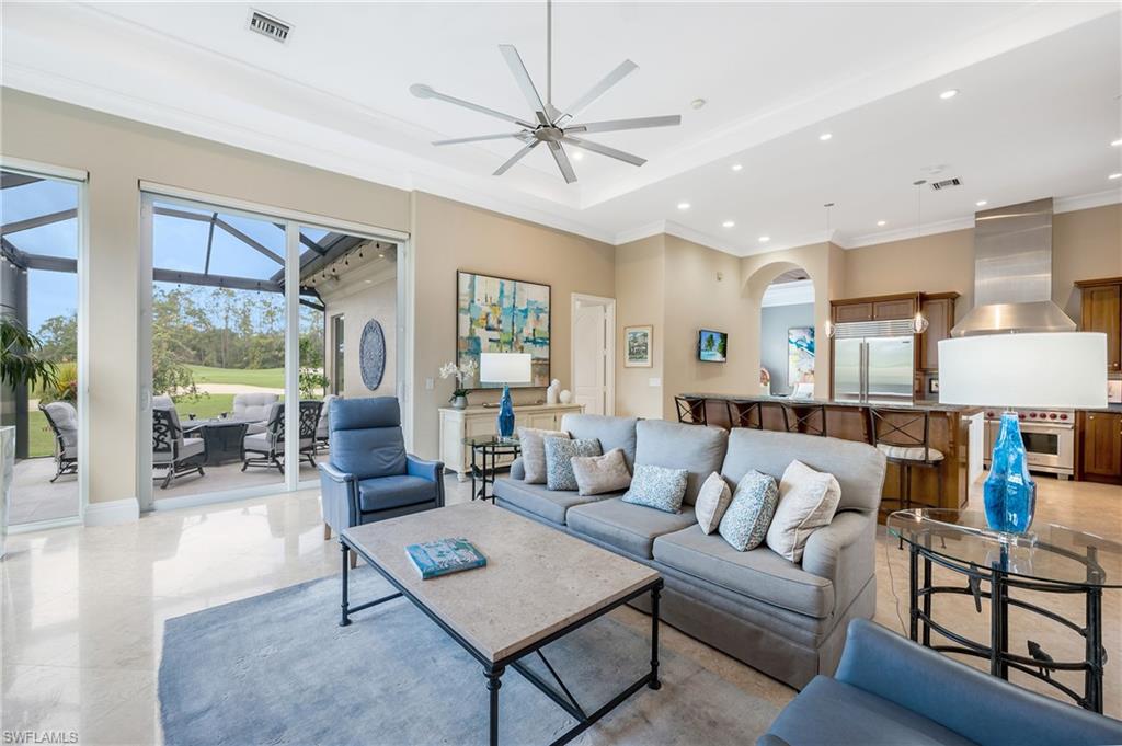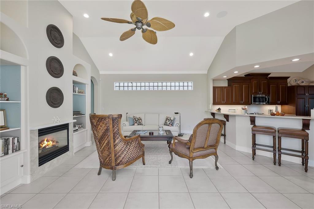 From the moment you enter the gated community of Kensington Golf & Country Club, you’re transported to a private resort. Surrounded by breathtaking landscapes, shimmering lakes, and 18 holes of championship golf, this exclusive enclave offers optional world-class amenities and a lifestyle like no other. Positioned along the 16th fairway, this stunning 3,580 sq ft residence effortlessly blends sophistication with comfort. Featuring 4 bedrooms + a den, home office, 3 ensuite bathrooms, and a powder room, the thoughtfully designed open layout is ideal for both everyday living and elegant entertaining. At the heart of the home is a gourmet kitchen outfitted with new stainless steel appliances, abundant cabinetry, and an island, extended breakfast bar—perfect for gatherings and casual dining. The main living spaces showcase tile flooring throughout, with newer wood flooring in all bedrooms for added warmth and elegance. Seamless indoor-outdoor living is made easy with 5-panel recessed sliders that open completely to a panoramic view of the golf course and your private outdoor oasis. The lanai features a new travertine tile surface, new custom tiled pool and spa, a brand new pool heater, outdoor kitchen and an expansive undercover seating area—creating the ultimate space for alfresco dining, lounging, and entertaining. The luxurious primary suite with sitting area offers direct lanai access and includes a spa-like bathroom with a large walk-in shower, jacuzzi tub, and dual vanities. All guest bedrooms include their own ensuite baths for complete comfort and privacy. Add to this a whole house generator, new pool heater, gas for the pool, jacuzzi and cooking, new landscaping and interior painting. The list keeps going...A BRAND NEW ROOF TO BE INSTALLED, COMPLETION TO BE DONE PRIOR TO CLOSING. As a Kensington resident, you have optional membership offering luxurious amenities, including a newly renovated multi-million clubhouse, restaurants, a resort style swimming pool, state-of-the-art fitness facility, har-tru tennis courts, pickleball and bocce courts. Kensington Golf & Country Club is more than a club, it is a lifestyle whether relaxing, recreation or social gatherings. This home delivers the best of Naples living - quality, upgrades, location and value.