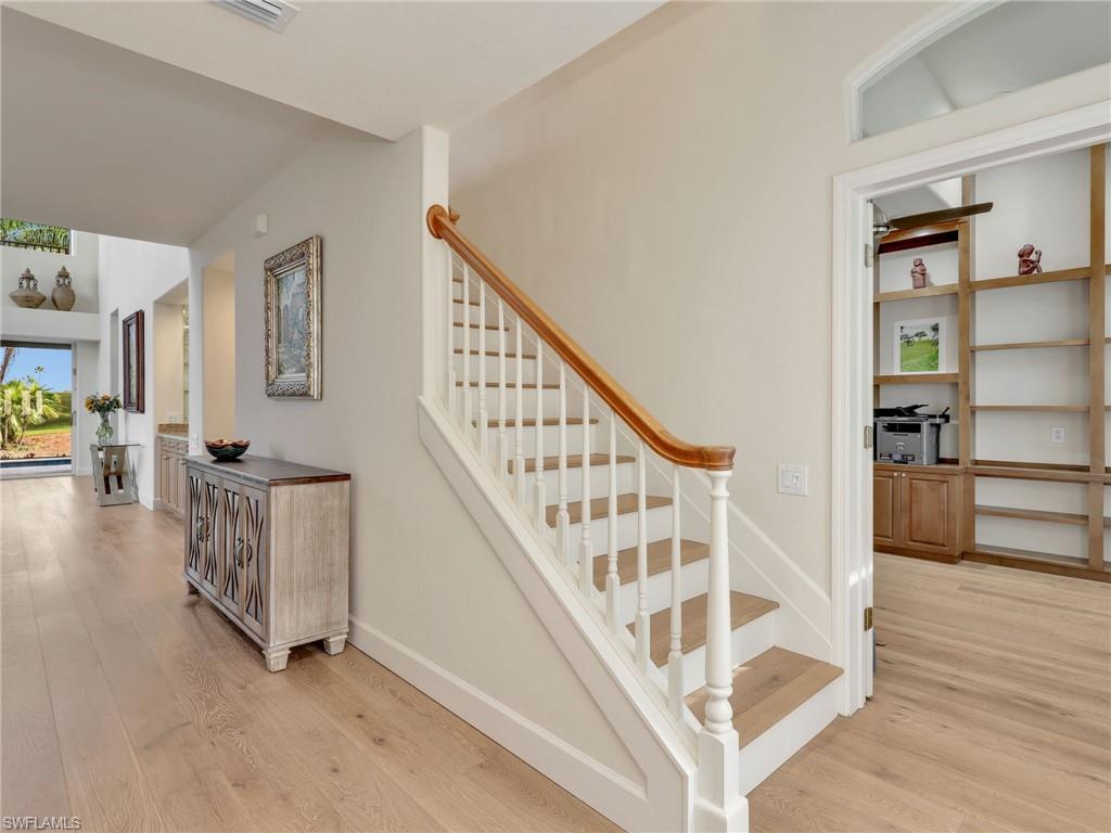This masterpiece of elegance and comfort, perched on the 9th hole of Kensington, is move-in ready and designed to maximize its 3,482 sq ft of well-appointed living space. Brand-new updates further elevate this residence with the addition of a sparkling new pool and panoramic picture-frame cage, transforming the lanai into a resort-style retreat that perfectly frames sweeping views of the 9th fairway. Soaring 18-foot ceilings and expansive windows fill the home with natural light, illuminating the exquisite European Oak hardwood flooring throughout. Designed for both grand entertaining and effortless everyday living, this 4-bed + den, 4-bath Arthur Rutenberg residence features an expansive great room with a wet bar and cozy wood-burning fireplace, ideal for hosting guests. The formal dining room and eat-in gourmet kitchen provide multiple dining options, while the generous-sized loft offers additional space for relaxation or recreation. The renovated kitchen is a showstopper, boasting custom cabinetry, high-end appliances, and a spacious center island perfect for entertaining. The dedicated office/flex space impresses with custom built-in shelving and its own bath. The sprawling primary suite on the ground floor is a serene retreat, offering breathtaking golf course views, while the remodeled en-suite bath features a Jacuzzi tub, quartz double vanity, and a walk-in shower. Upstairs, the VIP bedroom with an en-suite bath and private balcony offers stunning golf course views—a perfect spot for sunbathing. Two additional spacious bedrooms and another full bathroom with towel warmers complete the second floor. A versatile den/5th bedroom on the ground floor is ideal for a home office, an au pair, or multigenerational living. Additional highlights include an oversized 3-car garage, hurricane shutters on all windows and doors, and recent upgrades, such as a new roof (2021), high- efficiency A/C, new water heater, and freshly painted interior and exterior. The optional Kensington Golf & Country Club offers an 18-hole championship golf course, a restaurant, a cutting-edge fitness center, tennis & pickleball courts, a new resort-style pool & more. This home offers an exceptional living experience in one of Naples’ most desirable communities, just minutes from vibrant entertainment, shopping, and dining at Mercato and Waterside, and pristine Gulf beaches!