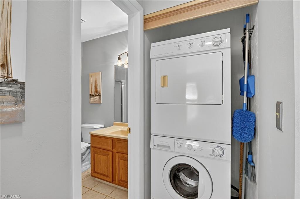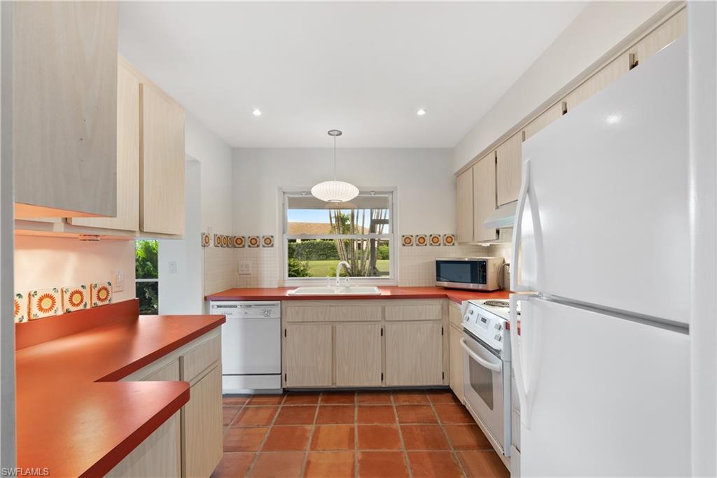 Nearly $100,000 spent to renovate this first-floor condominium near the community pool and hot tub. Gorgeous lake and golf course views! Goodbye galley kitchen. Hello stunning, open kitchen offering island with breakfast bar, quartz countertops, artfully designed backsplash, farm sink, soft-close drawers, pantry, white shaker cabinets and drawers, drop ceiling removed and custom lighting added, complete with a graphite-colored LG appliance package. Goodbye washer and dryer in outside closet. Hello in-residence, stacked laundry system. So many fantastic improvements. Warm, easy-to-maintain vinyl floors throughout main living areas and bedrooms. Primary bedroom with custom closet doors and lots of windows offering golf course and lake views, plus direct access to the glass-enclosed lanai. Primary bath has ship lapped walls, modern light fixtures, new storage cabinet and sink, mirrored medicine cabinet and stunning shower. Spacious guest bedroom has walk-in closet and a guest bath with shower/tub combo, and updated light fixtures, sink and faucet. Glass enclosed lanai with electric storm shutter for year-round enjoyment. Plus, an extra outdoor seating area in the rock garden. Large storage closet just outside the front door and another storage cubby around the corner. Reserved covered parking. Keyless entry pad on front door. Move-in ready! No stairs or elevators. Less than 10 minutes to downtown Naples and the beach. This is a must-see. Furniture is negotiable.