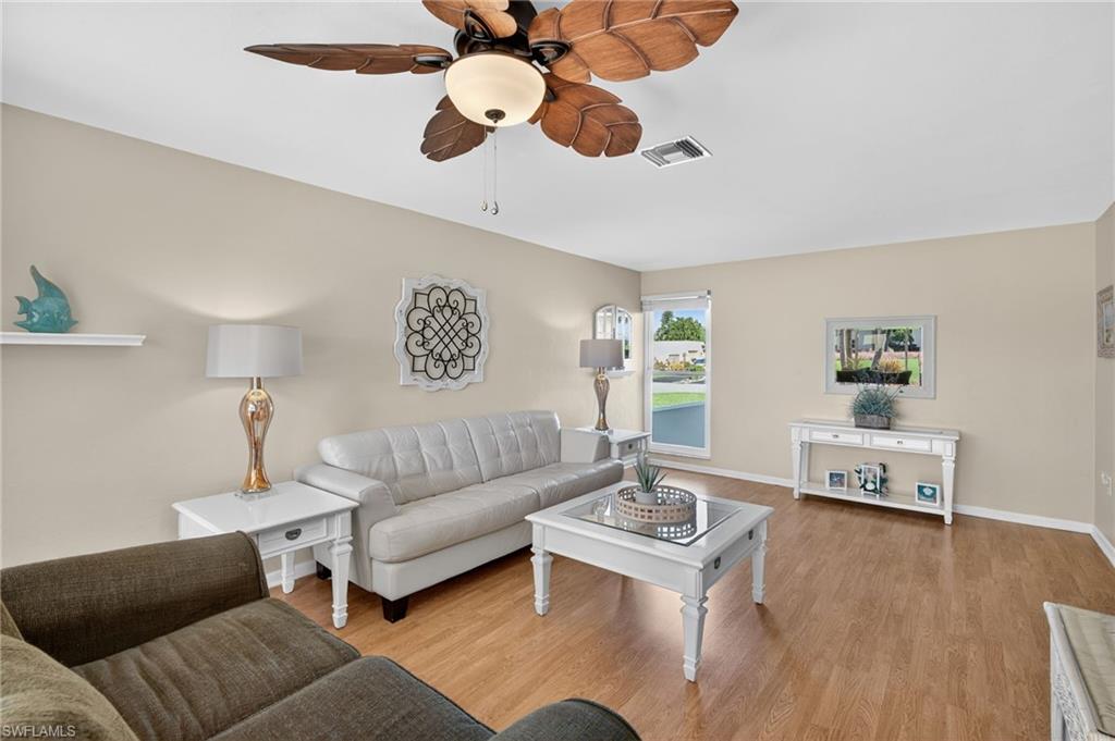PRIME LOCATION!. Minutes to everything. This Ranch style 2 bdrm Condo has been very well cared for with owners using sparingly throughout the year. The lanai was opened up to give more living area under air. Feels like a home, no one above you. New roofs 2022, W/H 2022 and air conditioning 2017. All new Hurricane impact windows 2025, new luxury vinyl flooring recent in both bedrooms, tile thoughout all other areas, crown molding in Entry and main living area plus Stackable laundry. Relax on the outdoor patio, landscaped lawn views. Ready to move right in. TURNKEY. Big bonus is good-sized storage great for beach chairs, grill or bikes. Carport parking steps away from yr front door, make this SW florida your next place in paradise.