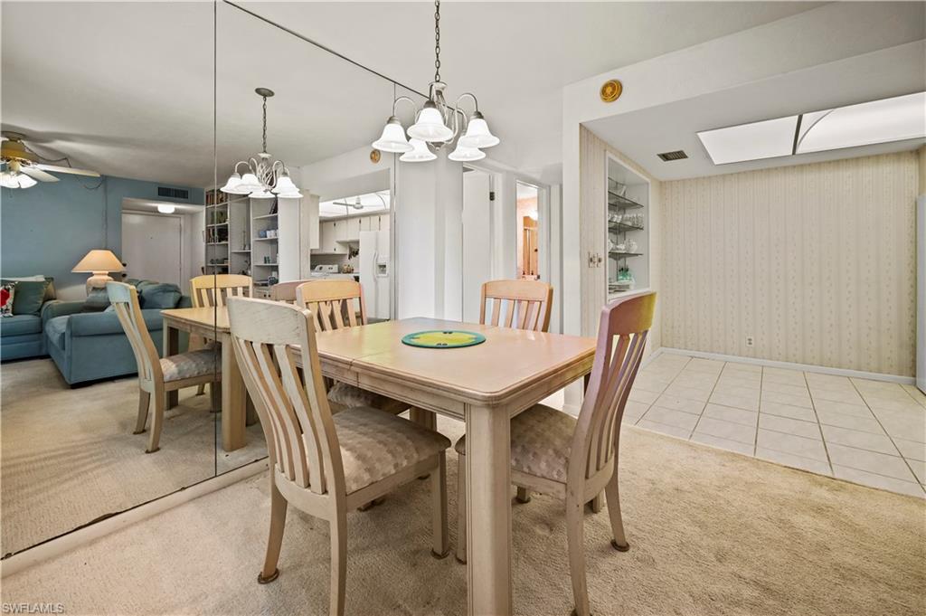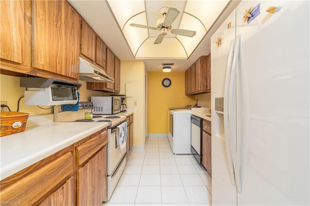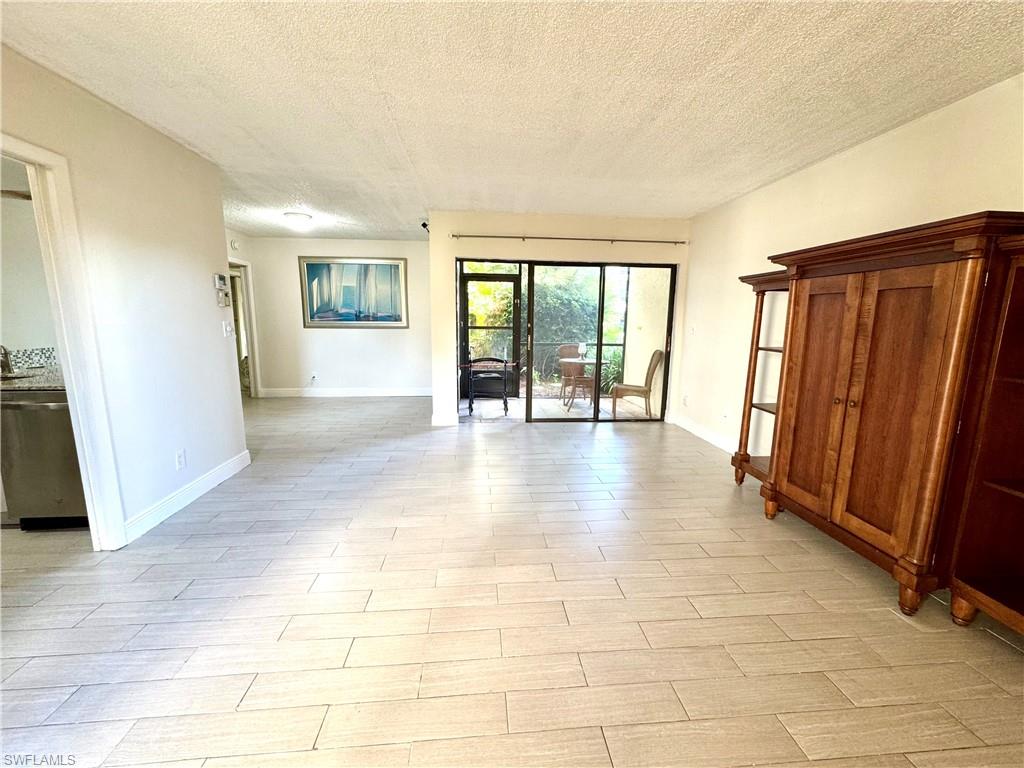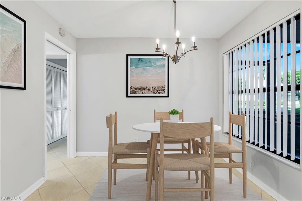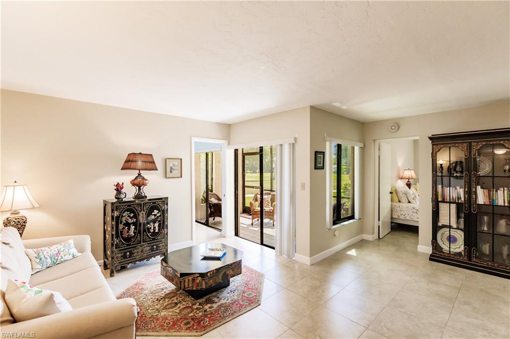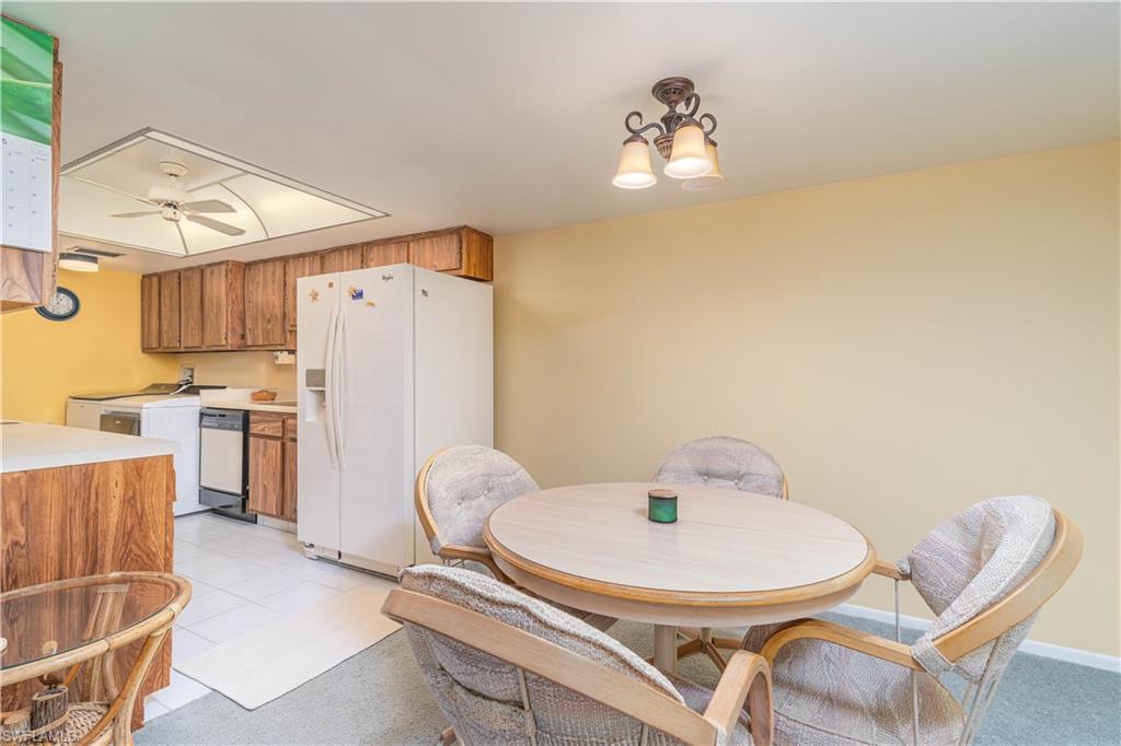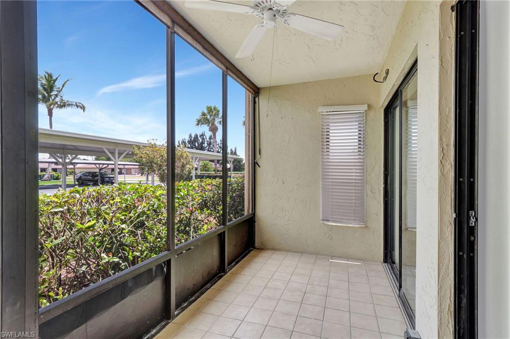 This condominium offers an inviting and open living space with several newer updates. The bright and spacious floor plan features a large living room, complemented by a separate dining area that is perfect for entertaining or enjoying daily meals. The kitchen is equipped with a breakfast bar, providing a convenient spot for casual dining, and tile flooring throughout adds a touch of modern style and easy maintenance. Step out onto the screened porch located at the rear of the unit, where you can relax while overlooking the scenic golf course and a distant lake, creating a peaceful and picturesque setting. The bedroom is generously sized and includes a large closet for ample storage. The bathroom has been updated with a new vanity, enhancing both functionality and appearance. An extra storage locker is available in the storage closet, providing additional room for your belongings. The washer and dryer are conveniently located in the condo's private utility closet in the front entry area, ensuring laundry tasks are easily managed. This highly sought-after location is just a 10-minute drive from downtown Naples and the beautiful beaches. Nearby plazas offer shopping and dining options for your convenience. Residents have the option to join the Lakewood Country Club, where they can take advantage of extra amenities such as golf, tennis, pickleball, and a clubhouse with dining facilities. Residents of the complex enjoy access to a community pool. The condo also includes a one-car carport and plenty of guest parking, making it easy to host visitors.