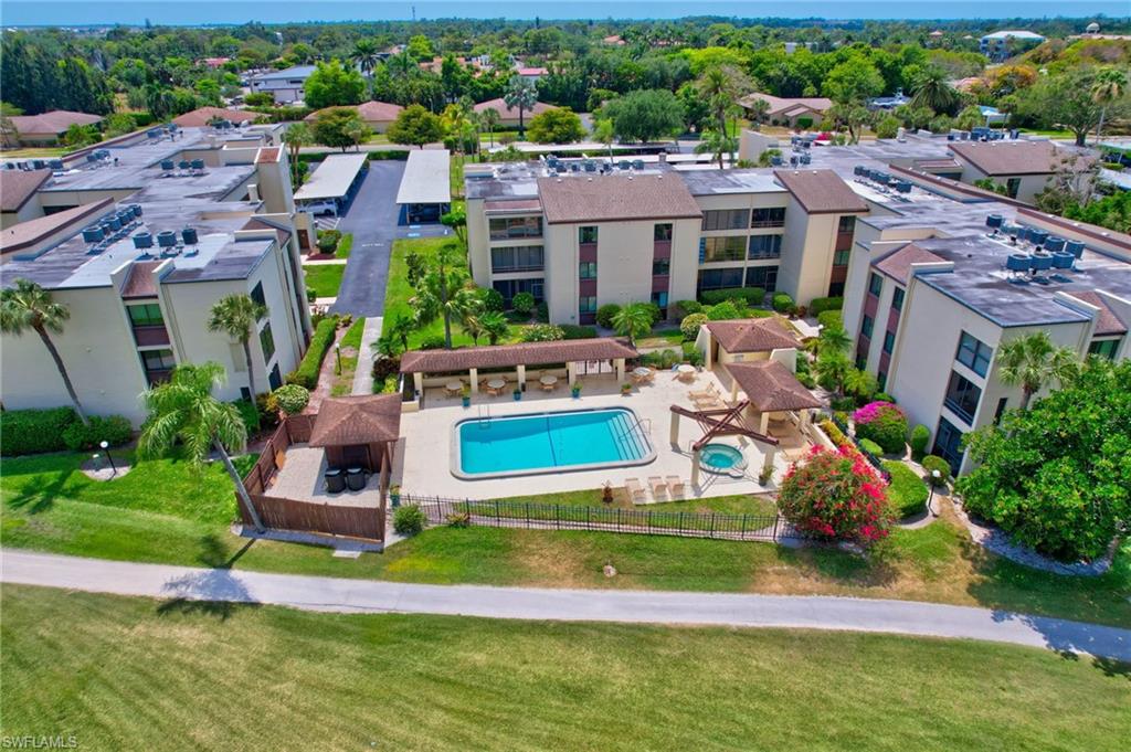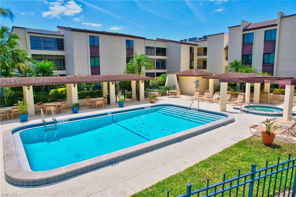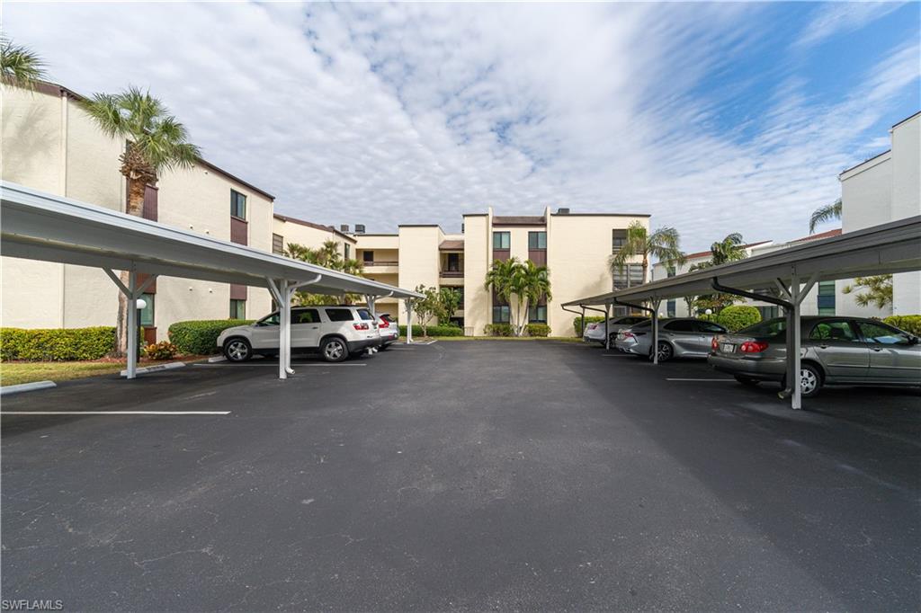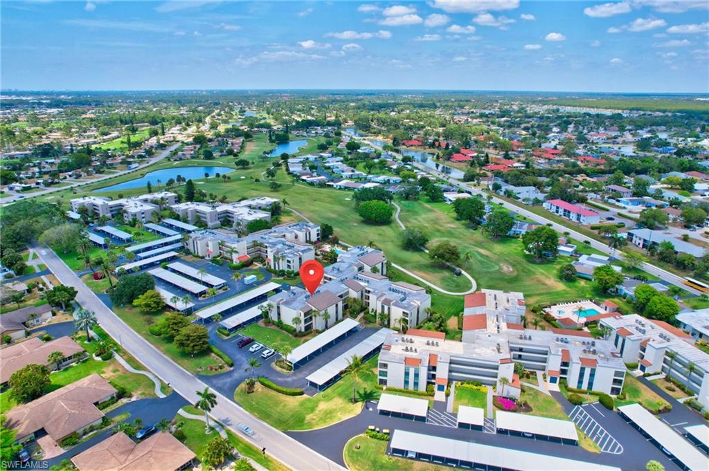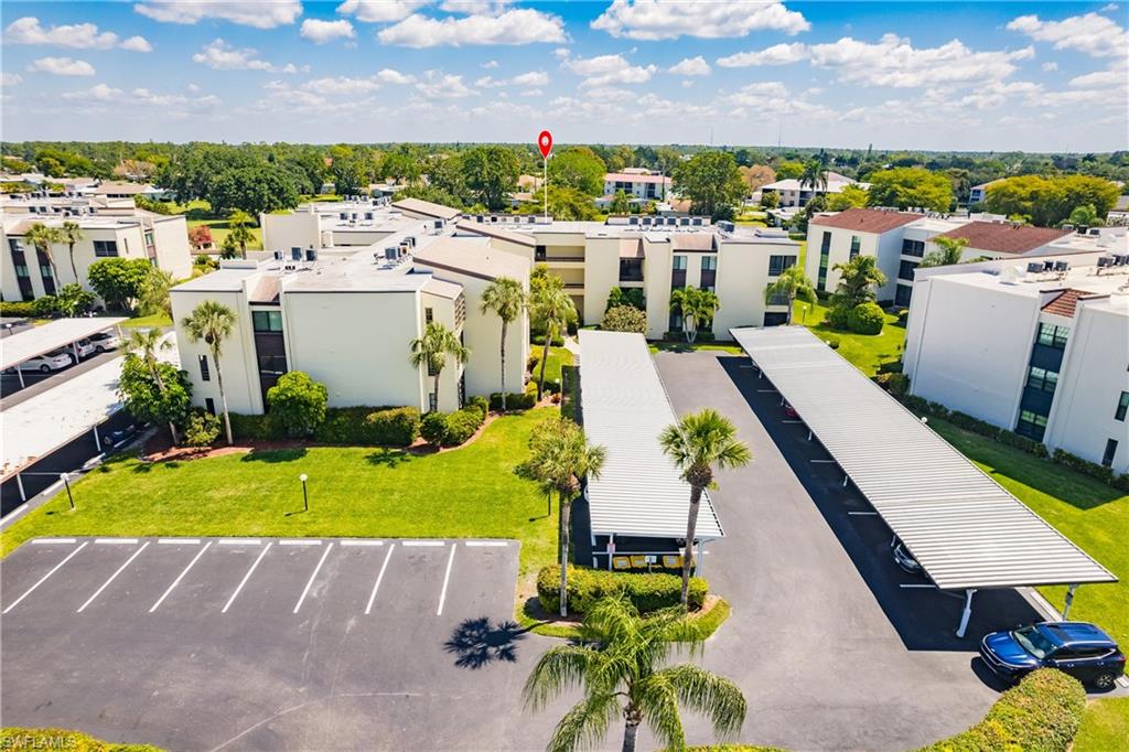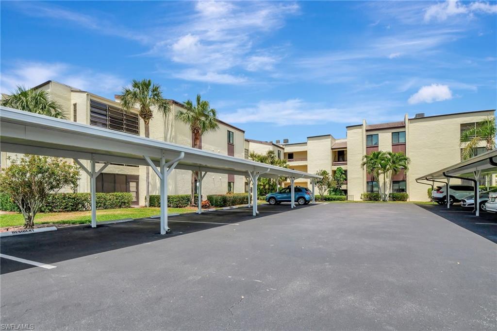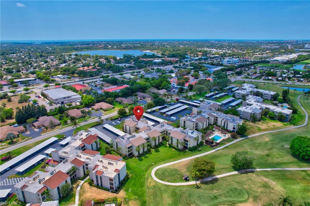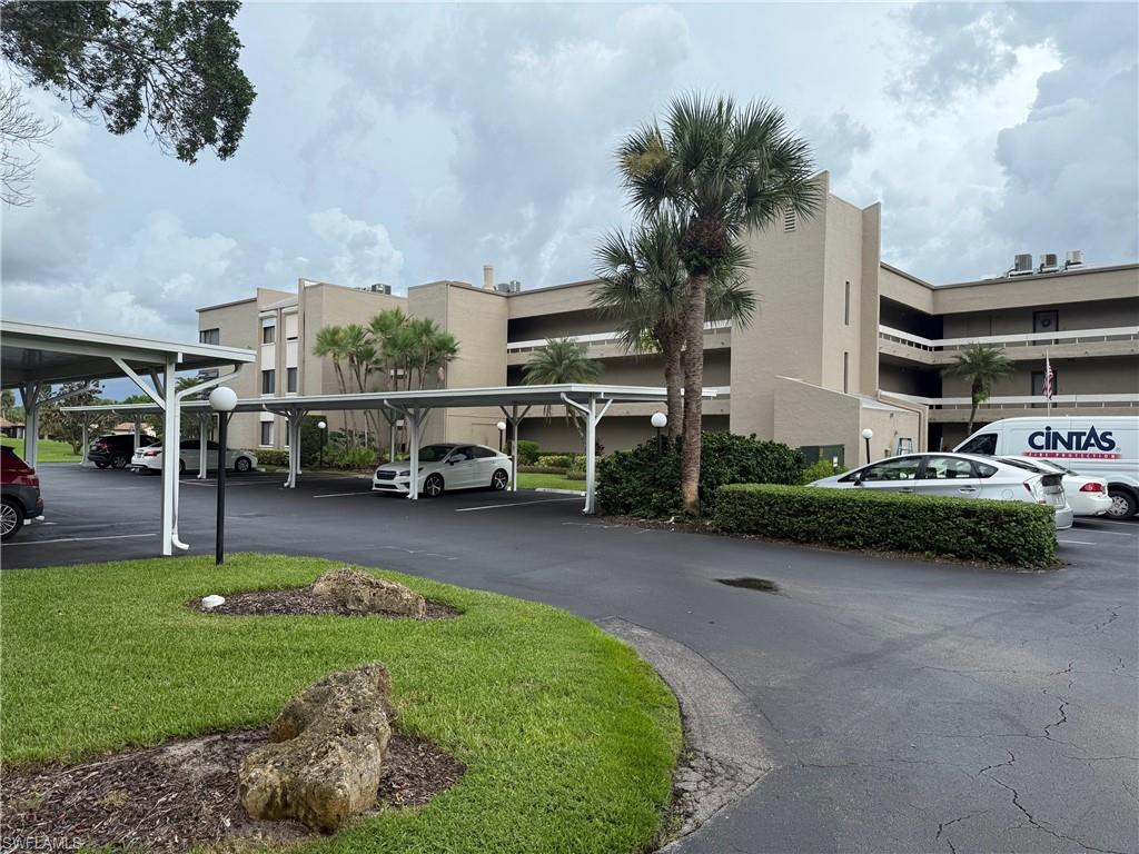 Discover this wonderful one bedroom one bath residence located on the top floor of a quiet three story building with no neighbors above you. Enjoy fantastic views overlooking the seventh green, fairway, and shimmering lake. The western exposure provides beautiful sunsets every evening and a peaceful outdoor setting. This community is situated on a public golf course with the option to join, and there are no required golf fees. Pay as you play and enjoy the luxury of having the course right behind the property. Residents also enjoy a relaxing pool and spa area with scenic golf course views. The building offers an elevator and the unit includes one covered carport space. This is an excellent opportunity for a first time buyer, seasonal resident, or investor looking for strong rental potential. Publix is located next door along with convenient nearby shopping and dining. Olde Naples and the beaches are only five miles away. Quarterly dues include water, cable, and wireless internet. A rare combination of location, views, amenities, and value. This property is easy to show and ready for its next owner.