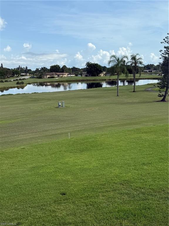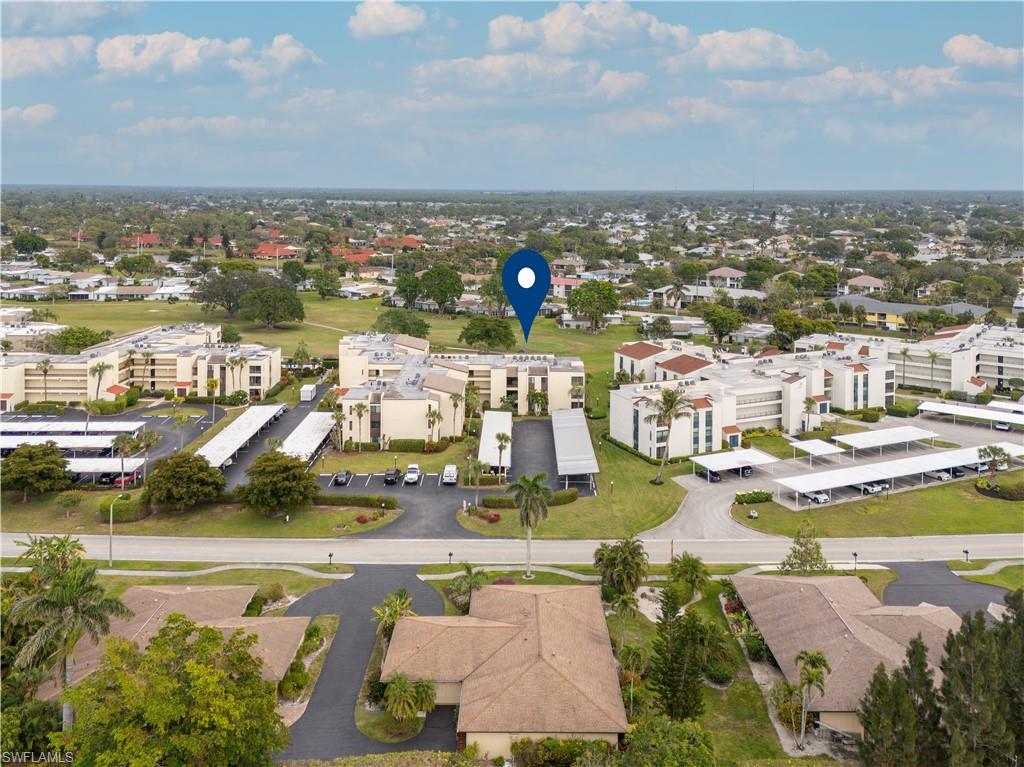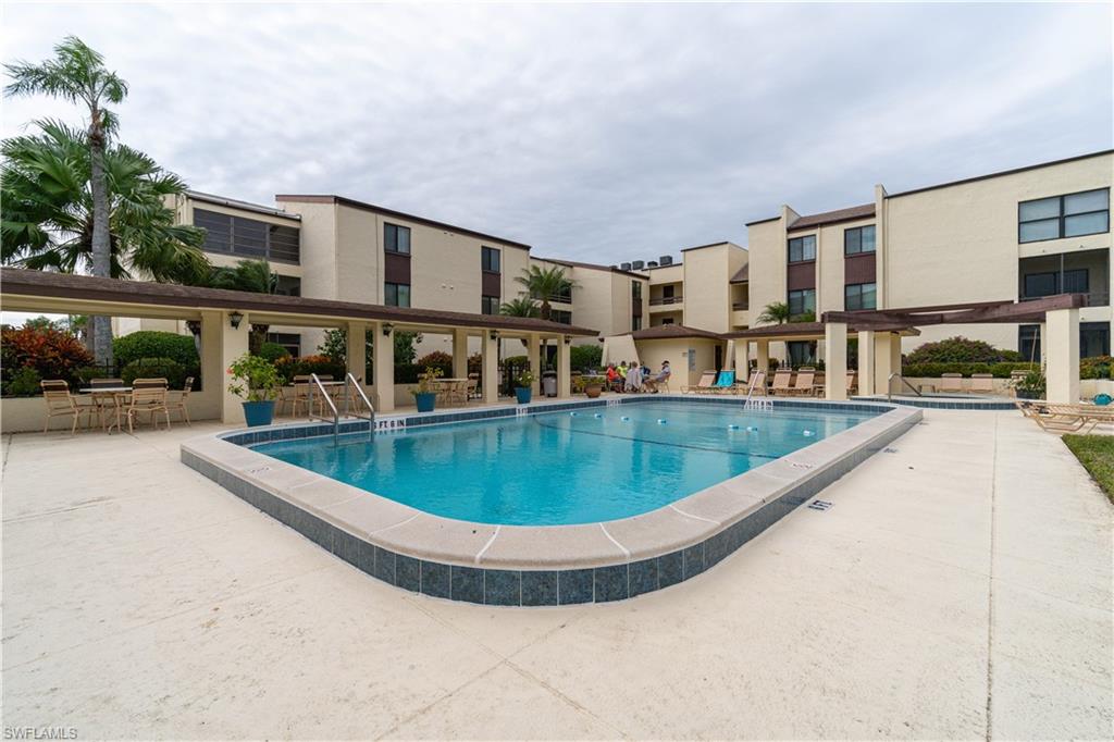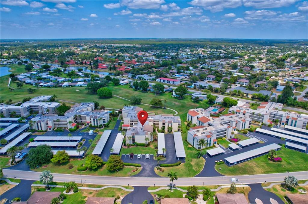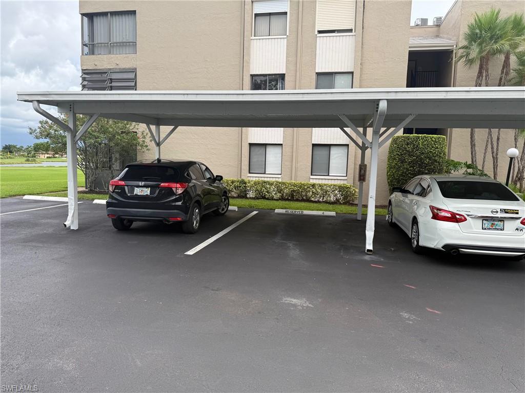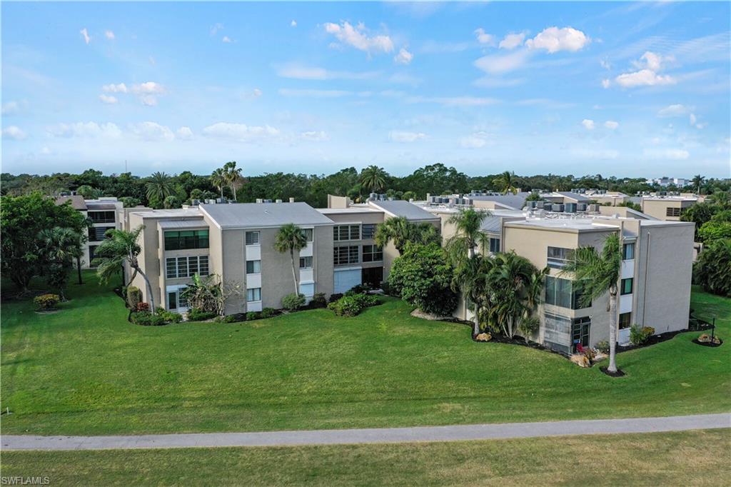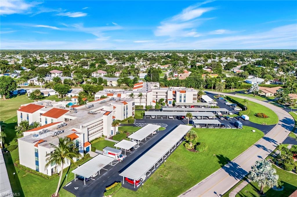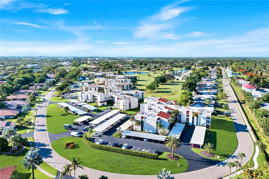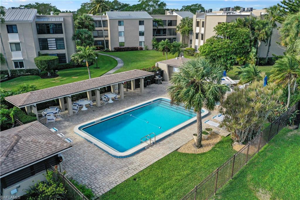Discover this wonderful one bedroom one bath residence located on the top floor of a quiet three story building with no neighbors above you. Enjoy fantastic views overlooking the seventh green, fairway, and shimmering lake. The western exposure provides beautiful sunsets every evening and a peaceful outdoor setting. This community is situated on a public golf course with the option to join, and there are no required golf fees. Pay as you play and enjoy the luxury of having the course right behind the property. Residents also enjoy a relaxing pool and spa area with scenic golf course views. The building offers an elevator and the unit includes one covered carport space. This is an excellent opportunity for a first time buyer, seasonal resident, or investor looking for strong rental potential. Publix is located next door along with convenient nearby shopping and dining. Olde Naples and the beaches are only five miles away. Quarterly dues include water, cable, and wireless internet. A rare combination of location, views, amenities, and value. This property is easy to show and ready for its next owner.