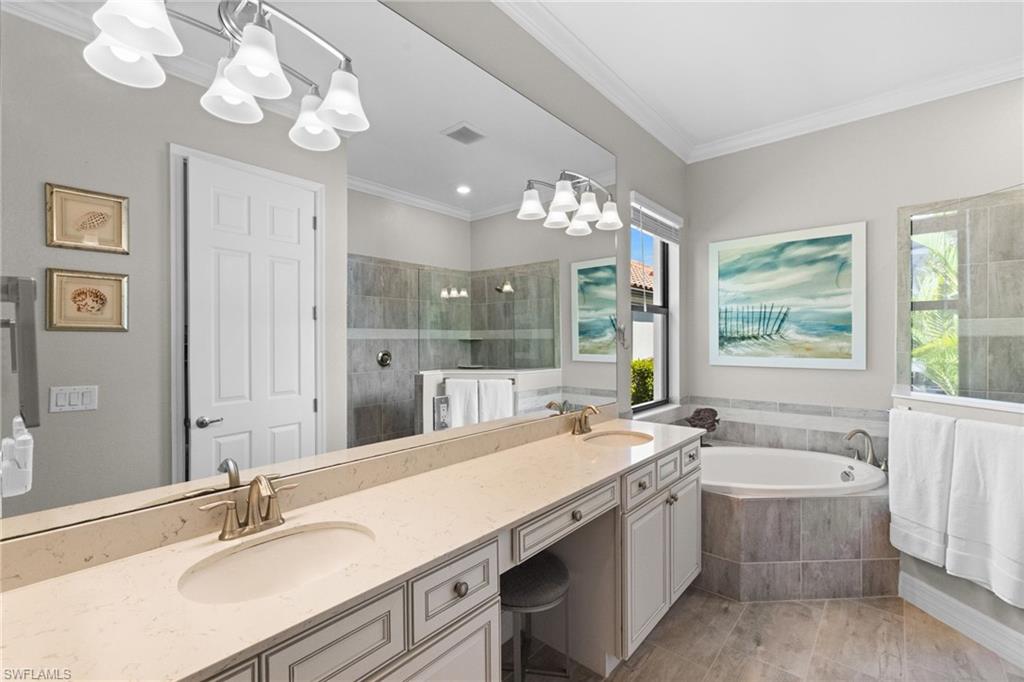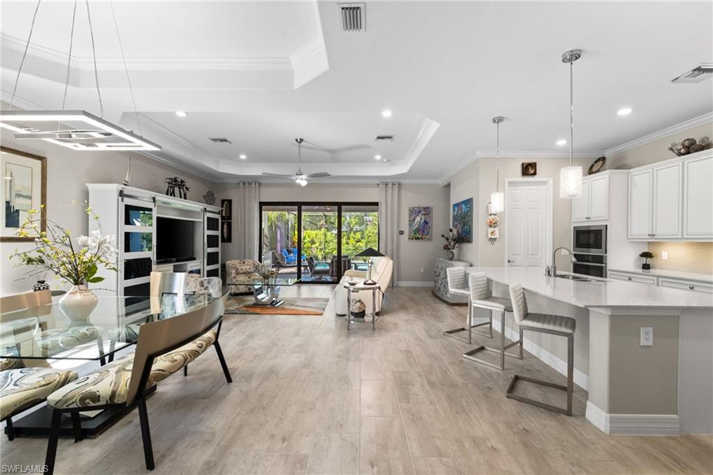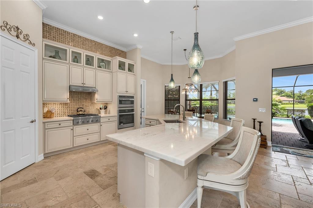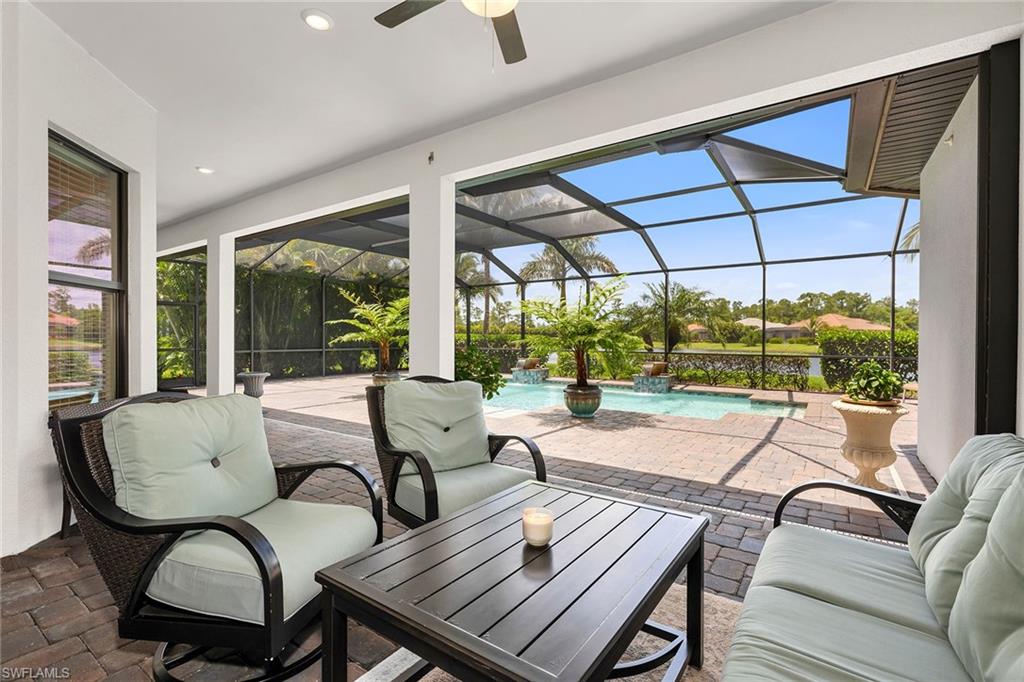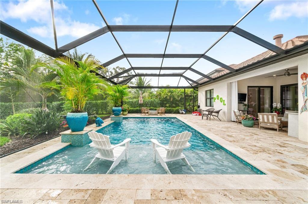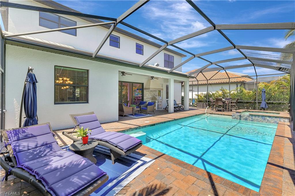 ELEGANT and sophisticated POOL Home on a PRIVATE cul-de-sac in LaMorada, a tranquil AMENITY-RICH community in highly desirable NORTH Naples. This popular Victoria floor plan offers an OPEN-CONCEPT design with classic finishes spanning 1900 square feet of living space. FURNITURE IS NEGOTIABLE. The home features 2 BEDROOMS PLUS A LARGE DEN and 2 and a half bathrooms, combining LUXURY and COMFORT. The GREAT ROOM seamlessly connects to the kitchen, formal dining area, a casual dining area with a built-in DRY BAR perfect for entertaining. The Living area has neutral rectangular tile, TEN foot ceilings, CROWN molding, TRAY ceilings and contemporary new light fixtures. This home also offers all HIGH IMPACT windows and sliders, BRAND NEW ELECTRIC hurricane shutters in the lanai, and a BRAND NEW GENERATOR with auto-transfer switch for your peace of mind. The kitchen features QUARTZ countertops, a large island, spacious pantry, stainless steel appliances, a natural GAS RANGE with a stainless vent hood, tile backsplash, and a large stainless-steel sink. The primary bedroom suite serves as a peaceful retreat, with a TRAY ceiling, large walk-in closet, sliders to the pool and BRAND NEW carpeting. The spacious primary bathroom has a walk-in shower, Roman tub and dual vanities. The Den is spacious and bright. The guest bedroom has BRAND NEW CARPETING and the guest bath a walk-in shower. The OUTDOOR living area is an ENTERTAINER'S DREAM, featuring a pavered Pool and Spa Patio enclosed area, beautiful manicured and a recently updated tropical landscape, new landscape/pool lighting, peaceful water views, and a POOL BATH, what a luxury. The patio has a modern OUTDOOR KITCHEN complete with a stainless steel refrigerator, gas grill and a brick accented wall; tankless water heater, epoxy flooring in garage. Close to $50k in recent upgrades. Enjoy world-class club amenities including a resort-style pool, fitness center, spa, tennis courts, pickleball courts, and casual pool dining. All of this just a short drive to some of Naples most popular destinations, Vanderbilt Beach, Mercato, Venetian Village and downtown Naples.