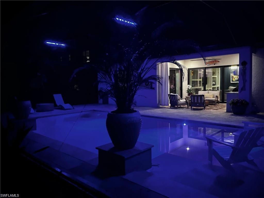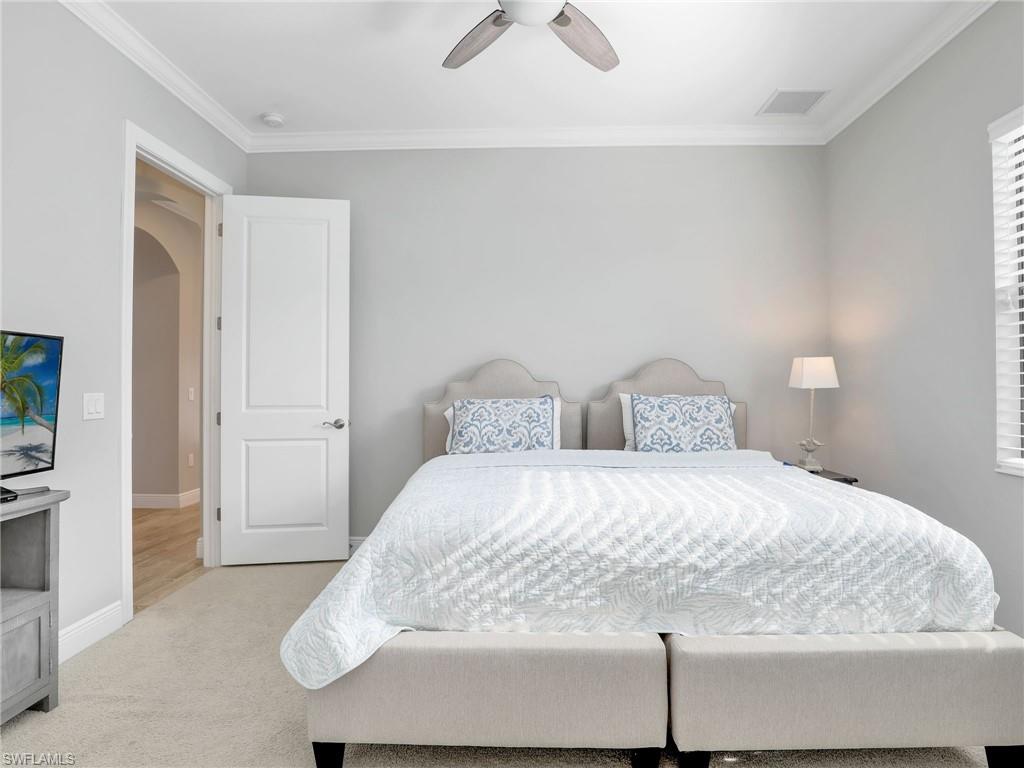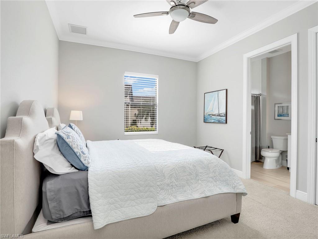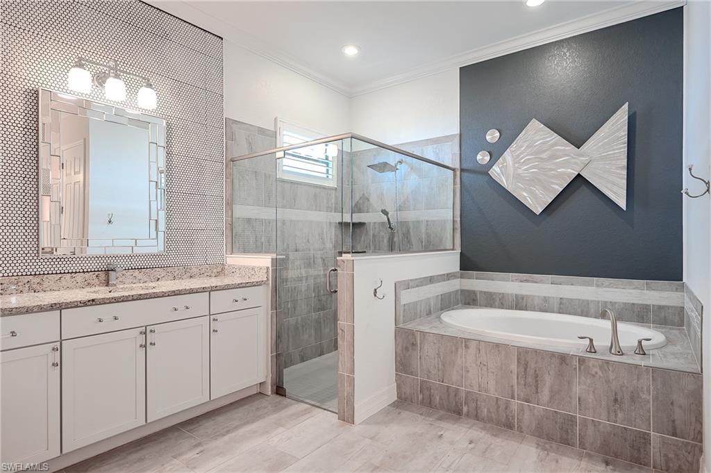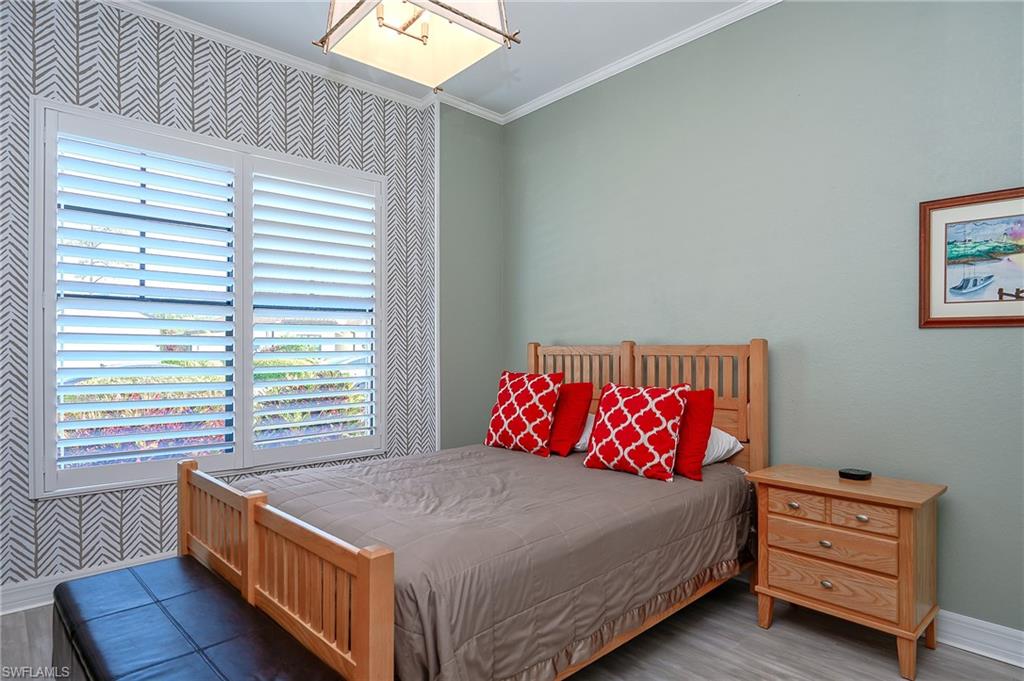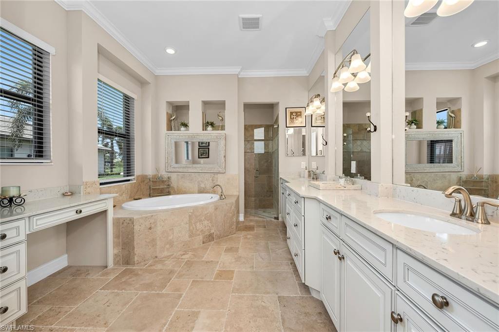 ELEGANT and sophisticated POOL Home on a PRIVATE cul-de-sac in LaMorada, a tranquil AMENITY-RICH community in highly desirable NORTH Naples. This popular Victoria floor plan offers an OPEN-CONCEPT design with classic finishes spanning 1900 square feet of living space. FURNITURE IS NEGOTIABLE. The home features 2 BEDROOMS PLUS A LARGE DEN and 2 and a half bathrooms, combining LUXURY and COMFORT. The GREAT ROOM seamlessly connects to the kitchen, formal dining area, a casual dining area with a built-in DRY BAR perfect for entertaining. The Living area has neutral rectangular tile, TEN foot ceilings, CROWN molding, TRAY ceilings and contemporary new light fixtures. This home also offers all HIGH IMPACT windows and sliders, BRAND NEW ELECTRIC hurricane shutters in the lanai, and a BRAND NEW GENERATOR with auto-transfer switch for your peace of mind. The kitchen features QUARTZ countertops, a large island, spacious pantry, stainless steel appliances, a natural GAS RANGE with a stainless vent hood, tile backsplash, and a large stainless-steel sink. The primary bedroom suite serves as a peaceful retreat, with a TRAY ceiling, large walk-in closet, sliders to the pool and BRAND NEW carpeting. The spacious primary bathroom has a walk-in shower, Roman tub and dual vanities. The Den is spacious and bright. The guest bedroom has BRAND NEW CARPETING and the guest bath a walk-in shower. The OUTDOOR living area is an ENTERTAINER'S DREAM, featuring a pavered Pool and Spa Patio enclosed area, beautiful manicured and a recently updated tropical landscape, new landscape/pool lighting, peaceful water views, and a POOL BATH, what a luxury. The patio has a modern OUTDOOR KITCHEN complete with a stainless steel refrigerator, gas grill and a brick accented wall; tankless water heater, epoxy flooring in garage. Close to $50k in recent upgrades. Enjoy world-class club amenities including a resort-style pool, fitness center, spa, tennis courts, pickleball courts, and casual pool dining. All of this just a short drive to some of Naples most popular destinations, Vanderbilt Beach, Mercato, Venetian Village and downtown Naples.