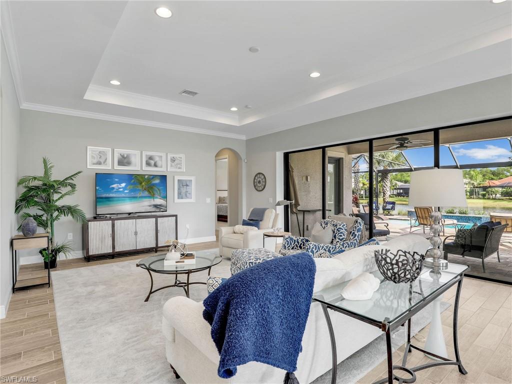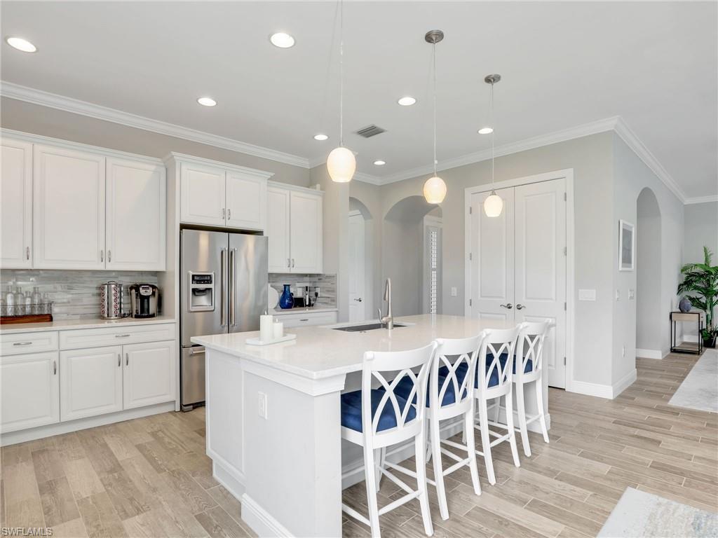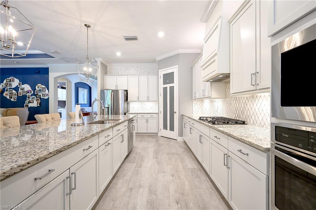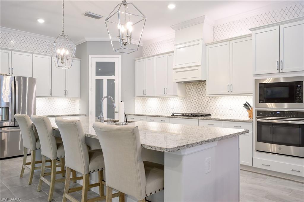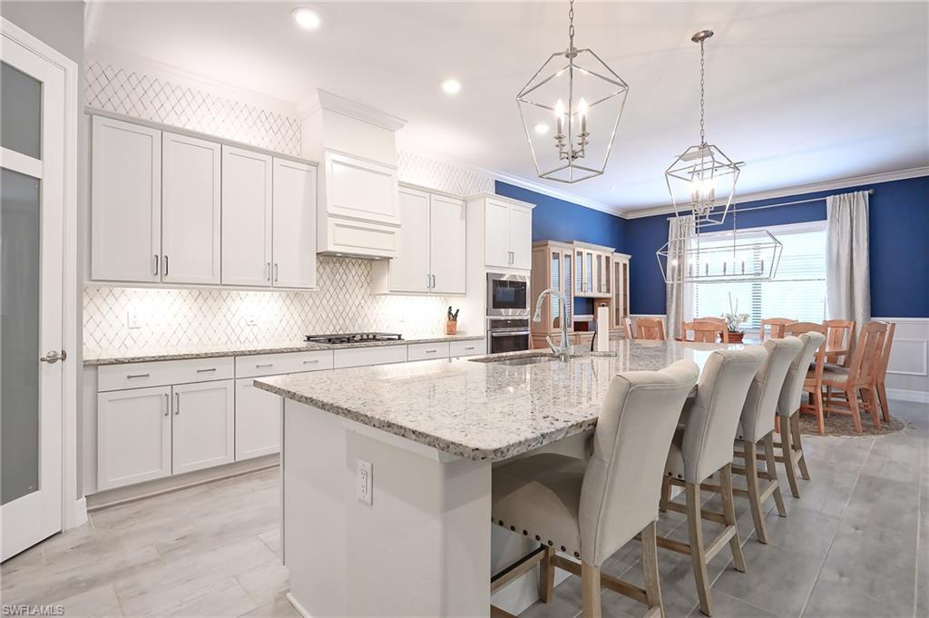 This upgraded Summerville model, part of the Manor Home Collection, offers spacious and stylish living with thoughtful design throughout. With 3 bedrooms, 3 full bathrooms, a den, and a 3-car garage, this home was built for comfort, functionality, and entertaining. Step through double glass doors into a wide foyer with a custom accent wall. The open-concept great room impresses with expansive views and a seamless connection between the living, dining, and kitchen areas. The chef’s kitchen features an 11-foot island, custom walk-in pantry, and a full-height backsplash that extends over the cabinets to the ceiling for a dramatic finish. Each bedroom has been tastefully styled with custom wall or ceiling accents. The master suite is a serene retreat with two walk-in closets, a chandelier, and a statement accent wall. The master bath includes dual vanities, a soaking tub with custom wall art above, and an oversized walk-in shower. The guest suite offers privacy and comfort with its own en-suite bathroom, ideal for visitors or extended stays. The den is enclosed with 8-foot French doors and plantation shutters, creating a quiet and flexible space for work or relaxation. Outdoors, the covered lanai delivers the full Florida lifestyle with a complete outdoor kitchen, built-in grill and exhaust hood, refrigerator, marble countertops, and a wall-mounted TV. The custom saltwater pool, installed in 2021, is 15 by 32 feet and features a sun shelf with loungers, a bubbler, water features, and two built-in stanchions with matching planters. The oversized panoramic cage is finished with travertine tile and landscape lighting, offering the perfect setting for day or night entertaining. Additional features include hurricane impact windows and doors throughout and three large overhead storage racks in the garage that eliminate the need for off-site storage. LaMorada is a gated, natural gas community in North Naples that combines the amenities of a large resort-style neighborhood with a more intimate residential feel. Residents enjoy pickleball, tennis, bocce, a fitness center, resort-style pool and bar, theater, culinary arts studio, and a library.
