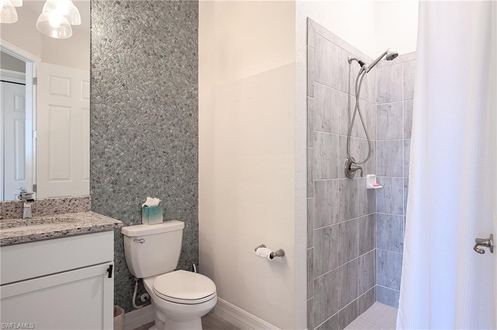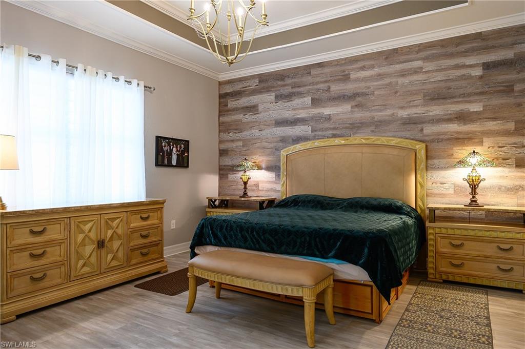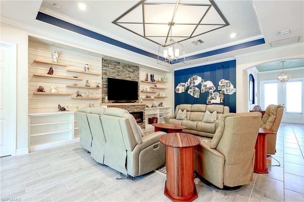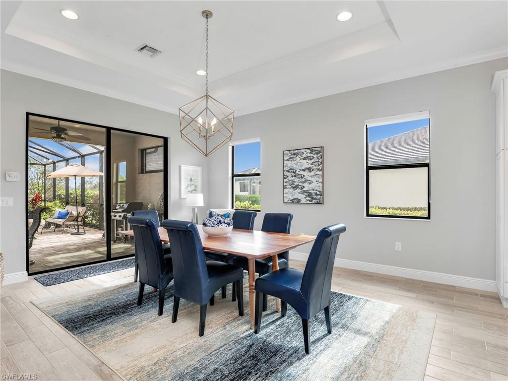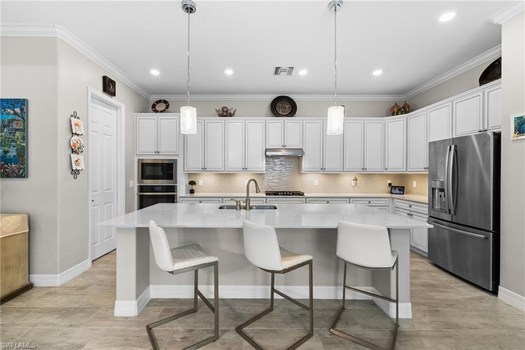 This upgraded Summerville model, part of the Manor Home Collection, offers spacious and stylish living with thoughtful design throughout. With 3 bedrooms, 3 full bathrooms, a den, and a 3-car garage, this home was built for comfort, functionality, and entertaining. Step through double glass doors into a wide foyer with a custom accent wall. The open-concept great room impresses with expansive views and a seamless connection between the living, dining, and kitchen areas. The chef’s kitchen features an 11-foot island, custom walk-in pantry, and a full-height backsplash that extends over the cabinets to the ceiling for a dramatic finish. Each bedroom has been tastefully styled with custom wall or ceiling accents. The master suite is a serene retreat with two walk-in closets, a chandelier, and a statement accent wall. The master bath includes dual vanities, a soaking tub with custom wall art above, and an oversized walk-in shower. The guest suite offers privacy and comfort with its own en-suite bathroom, ideal for visitors or extended stays. The den is enclosed with 8-foot French doors and plantation shutters, creating a quiet and flexible space for work or relaxation. Outdoors, the covered lanai delivers the full Florida lifestyle with a complete outdoor kitchen, built-in grill and exhaust hood, refrigerator, marble countertops, and a wall-mounted TV. The custom saltwater pool, installed in 2021, is 15 by 32 feet and features a sun shelf with loungers, a bubbler, water features, and two built-in stanchions with matching planters. The oversized panoramic cage is finished with travertine tile and landscape lighting, offering the perfect setting for day or night entertaining. Additional features include hurricane impact windows and doors throughout and three large overhead storage racks in the garage that eliminate the need for off-site storage. LaMorada is a gated, natural gas community in North Naples that combines the amenities of a large resort-style neighborhood with a more intimate residential feel. Residents enjoy pickleball, tennis, bocce, a fitness center, resort-style pool and bar, theater, culinary arts studio, and a library.