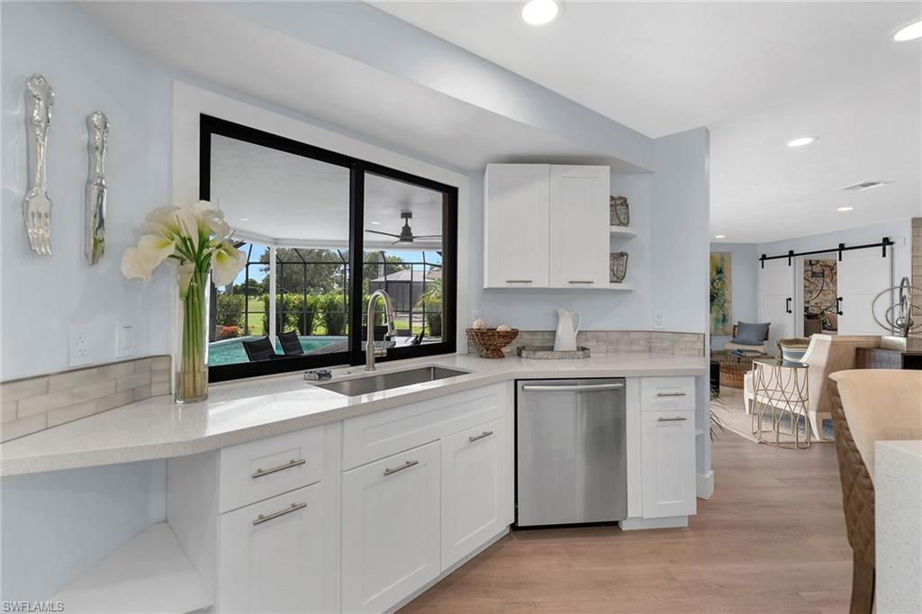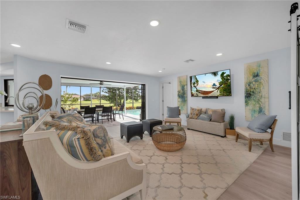 Completely renovated and offered turnkey, this four-bedroom, two-bath home enjoys peaceful views of Hibiscus Golf Course and a lifestyle of comfort and convenience. Recent updates include a brand-new roof and freshly painted lanai deck, making this residence move-in ready or ideal as a rental investment. An open and airy floor plan showcases stylish finishes throughout. The living room flows seamlessly to the screened lanai through pocket doors, where tranquil golf course vistas create a perfect backdrop for relaxation or entertaining. The family room features a modern accent wall, while the updated kitchen is a showpiece with quartz countertops, an island, glass tile backsplash, under-cabinet lighting, stainless steel appliances, including a double oven stove with vent hood, and a window overlooking the pool and fairways. The primary suite is a private retreat with an accent wall, recessed LED lighting, fan, window coverings, and a spa-like bath featuring dual sinks, LED backlit mirrors, cabinet closet, frameless glass walk-in shower with tiled walls, and modern finishes. Guest bedrooms are equally inviting, with recessed lighting, ceiling fans, and custom touches such as barn doors. Both baths feature walk-in showers with sleek tile work. Additional highlights include a Nest thermostat, custom lighting, and turnkey furnishings for immediate enjoyment. Outdoors, the newly painted lanai deck offers ample space for lounging and dining while overlooking the golf course. This home combines stylish modern updates with the tranquility of its golf course setting, just minutes from Naples’ beaches, shopping, dining, and attractions.