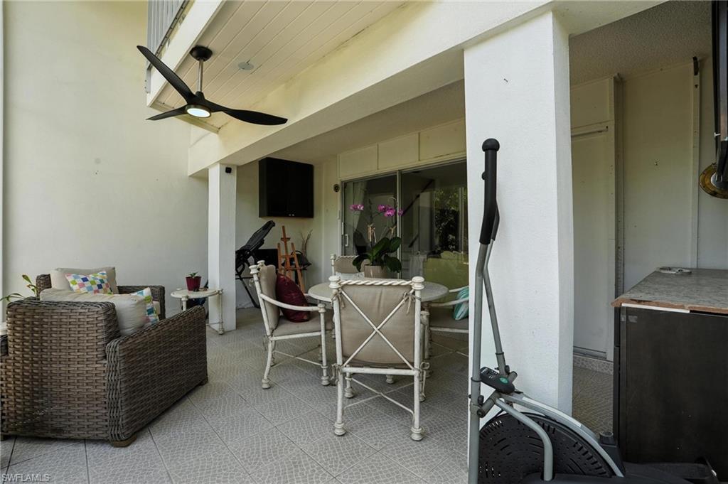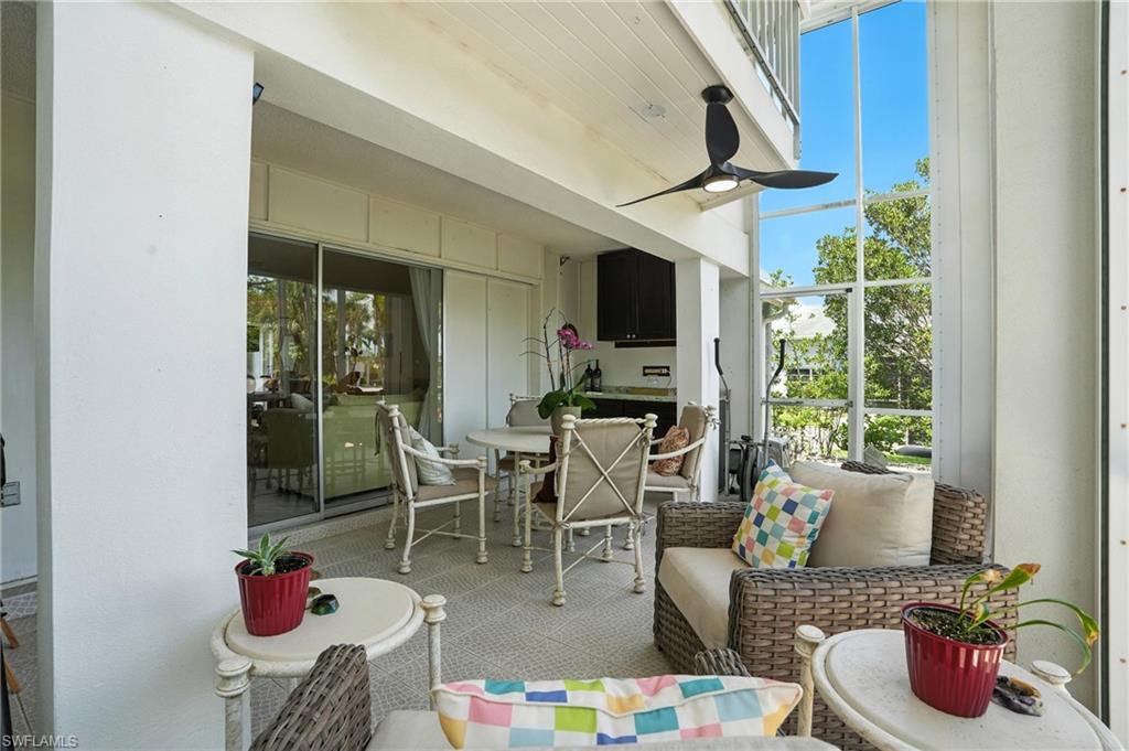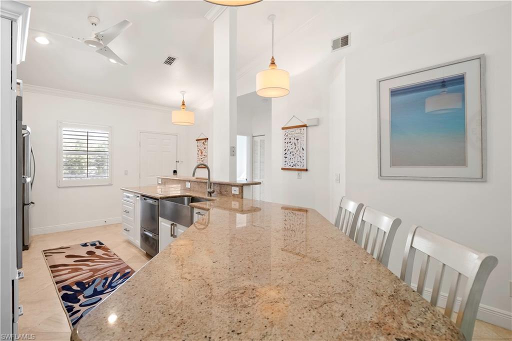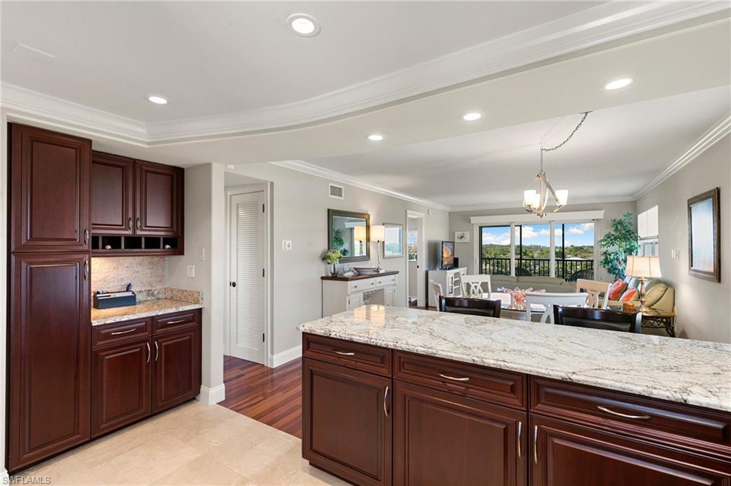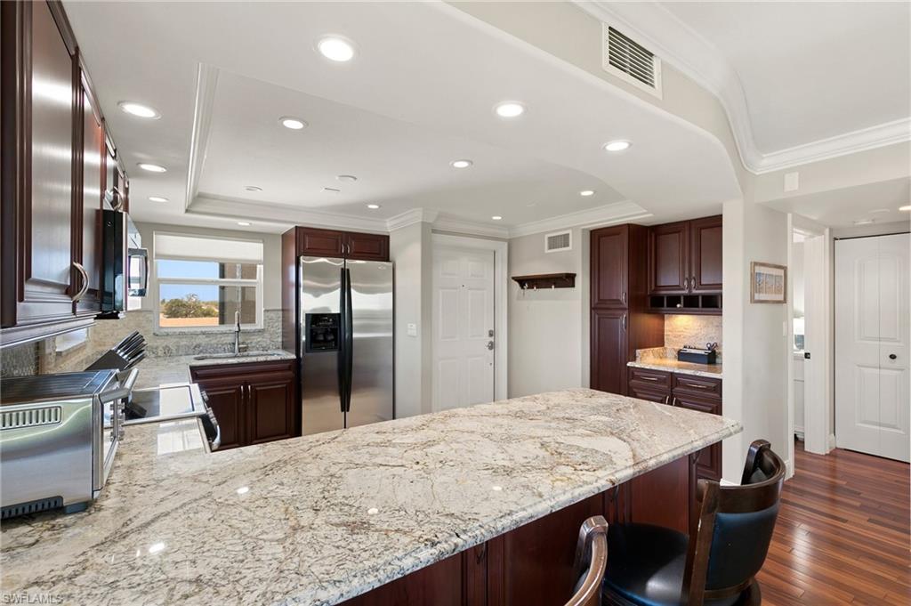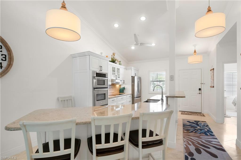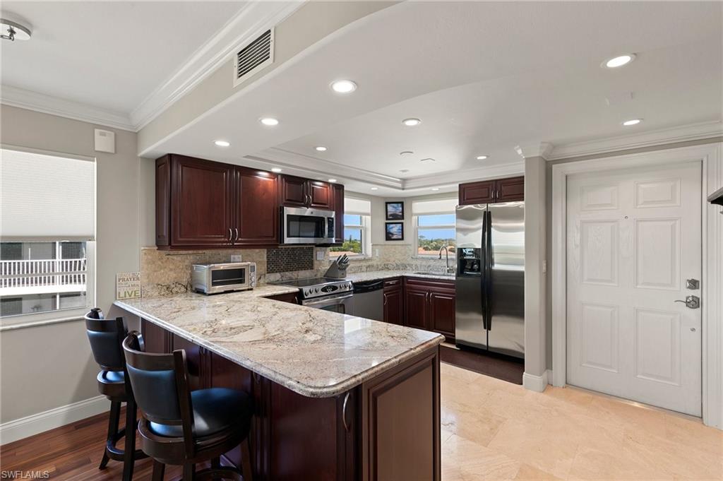 This stunning move-in ready upstairs condo is guaranteed to exceed expectations with its professional upgrades and impeccable style. Owned and renovated by a professional interior designer, every inch of this home has been thoughtfully curated for comfort, functionality, and elegance. Step inside to find a beautifully remodeled kitchen featuring stylish granite countertops, a convenient breakfast bar, new Samsung appliances, and an ultra-quiet Bosch dishwasher—a dream setup for any home chef. The open-concept dining area is enhanced by a tray ceiling, faux fireplace, and a built-in wine fridge, creating the perfect space for entertaining. Throughout the home, you’ll find sleek, wood-look tile flooring, offering both durability and contemporary appeal. The primary suite is a true retreat, boasting a spacious walk-in closet, an entire wall of additional storage cabinetry, and a fully remodeled bath with custom tile work, new vanity, comfort-height toilet, and upscale fixtures. The second bedroom, currently used as a home office, includes custom-built closet cabinets, while the second bathroom has also been stylishly updated with a new vanity, faucet, and comfort-height toilet. Enjoy peaceful mornings or evening breezes from the custom-designed lanai, complete with built-in planters and a cozy sitting area. A private one-car garage is located just downstairs for your convenience. Located in a well-maintained community offering a pool, clubhouse, and tennis courts, and just minutes from vibrant downtown Naples and the area's world-famous beaches, this condo blends luxury, lifestyle, and location into one irresistible package.