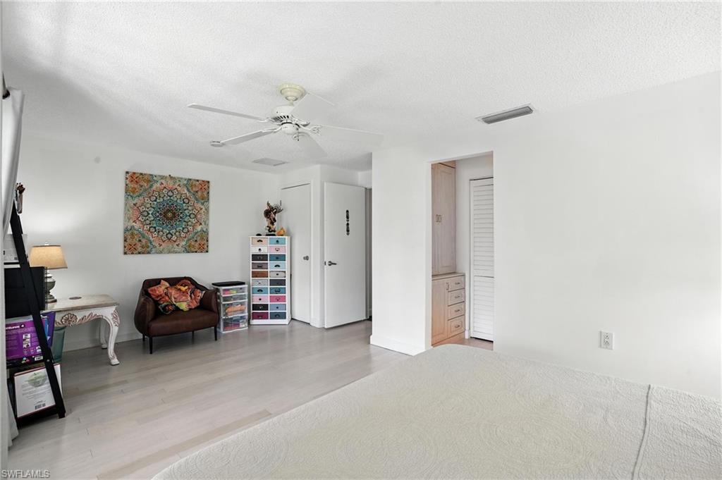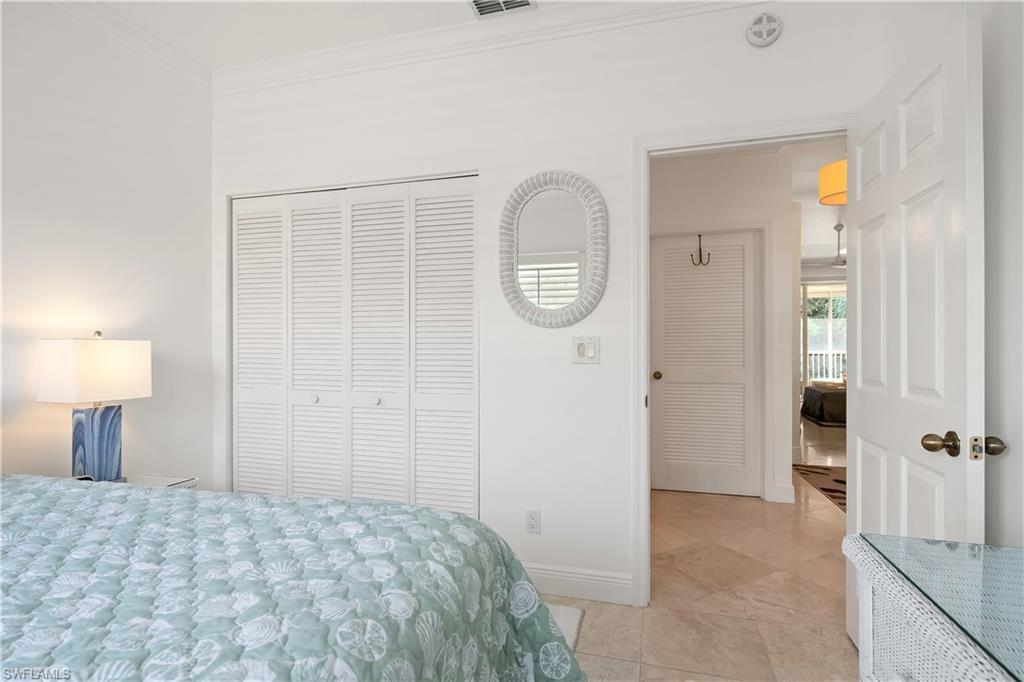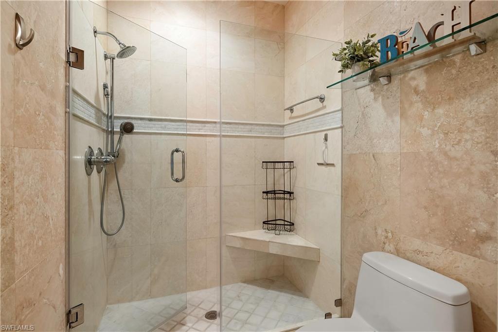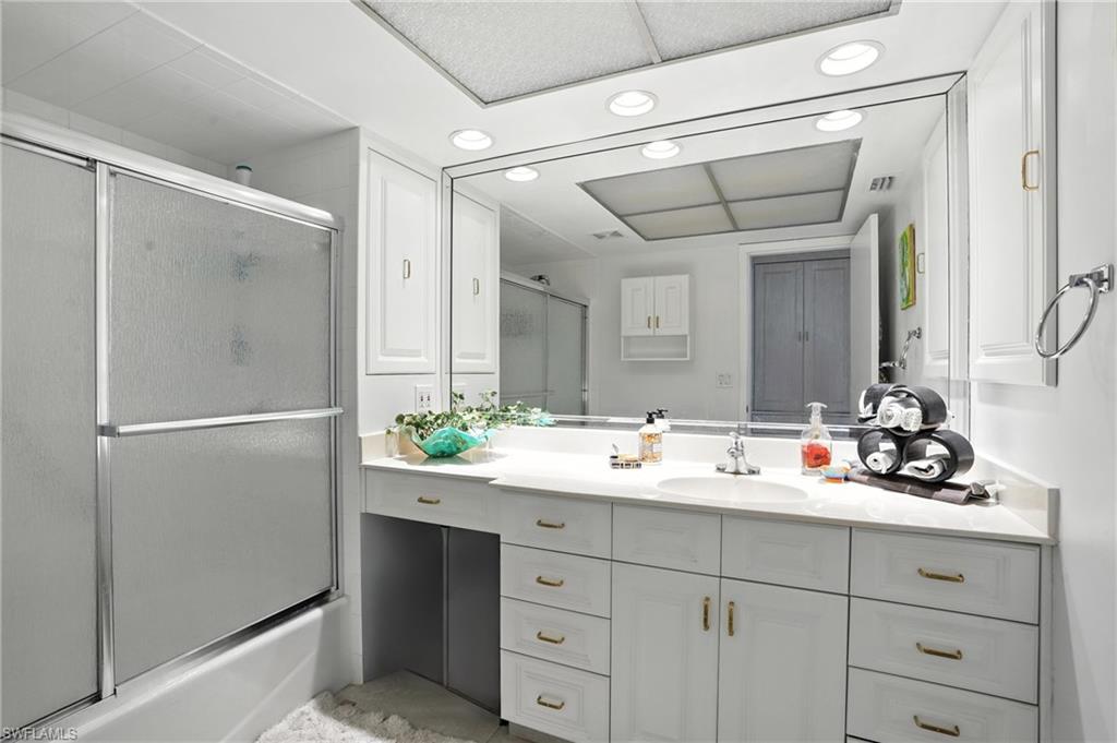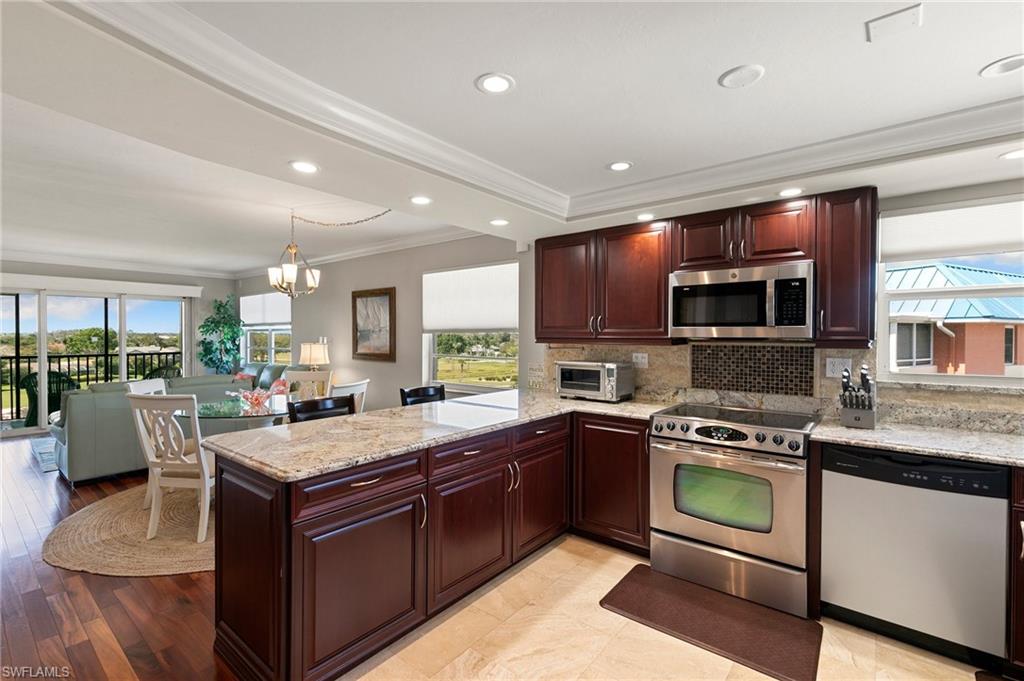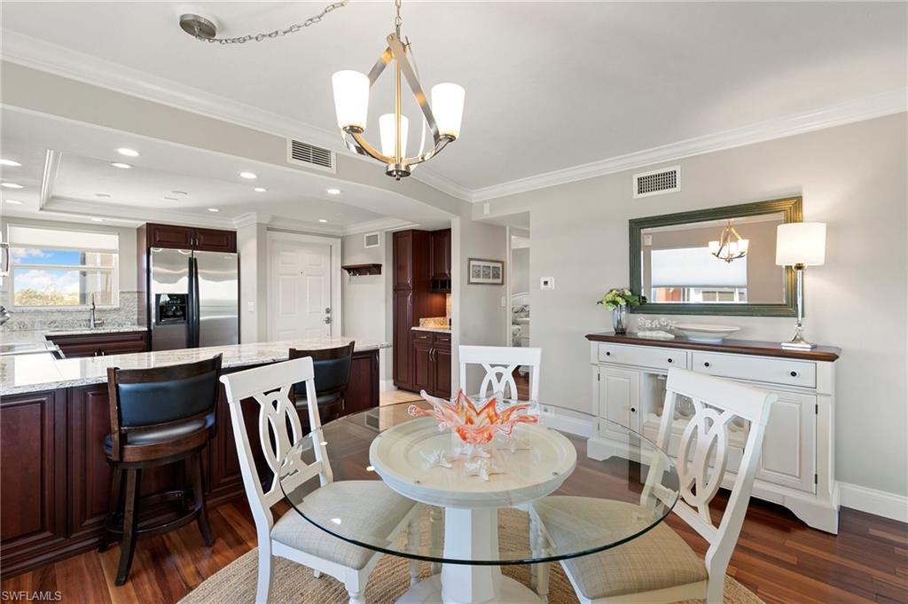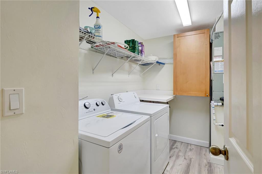 This stunning move-in ready upstairs condo is guaranteed to exceed expectations with its professional upgrades and impeccable style. Owned and renovated by a professional interior designer, every inch of this home has been thoughtfully curated for comfort, functionality, and elegance. Step inside to find a beautifully remodeled kitchen featuring stylish granite countertops, a convenient breakfast bar, new Samsung appliances, and an ultra-quiet Bosch dishwasher—a dream setup for any home chef. The open-concept dining area is enhanced by a tray ceiling, faux fireplace, and a built-in wine fridge, creating the perfect space for entertaining. Throughout the home, you’ll find sleek, wood-look tile flooring, offering both durability and contemporary appeal. The primary suite is a true retreat, boasting a spacious walk-in closet, an entire wall of additional storage cabinetry, and a fully remodeled bath with custom tile work, new vanity, comfort-height toilet, and upscale fixtures. The second bedroom, currently used as a home office, includes custom-built closet cabinets, while the second bathroom has also been stylishly updated with a new vanity, faucet, and comfort-height toilet. Enjoy peaceful mornings or evening breezes from the custom-designed lanai, complete with built-in planters and a cozy sitting area. A private one-car garage is located just downstairs for your convenience. Located in a well-maintained community offering a pool, clubhouse, and tennis courts, and just minutes from vibrant downtown Naples and the area's world-famous beaches, this condo blends luxury, lifestyle, and location into one irresistible package.