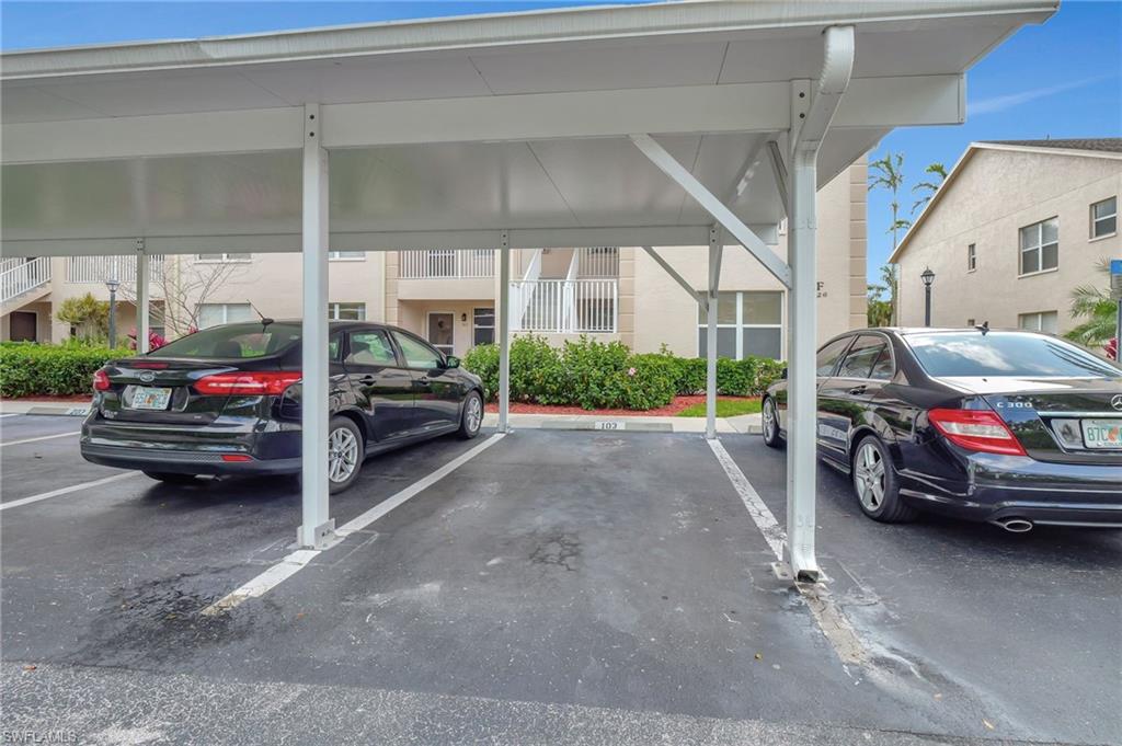 Welcome to Bradstrom Village in the heart of Lely resort community—an immaculately maintained, tastefully furnished 2 bedroom, 2 bath second-floor condo in a quiet 44-unit community just 6 miles from downtown Naples and the white sand beaches of Southwest Florida. This move-in-ready or rental-ready home features vaulted ceilings, a beautifully updated kitchen with granite countertops, double wall oven , stainless steel appliances, and a large breakfast bar, plus a spacious primary suite with dual vanities, a walk-in shower, and a large walk-in closet. The unit also offers a convenient laundry room with plenty of storage, and a screened-in lanai just off the family room, perfect for relaxing while overlooking the beautifully landscaped grounds. The building received a new roof and fresh paint in 2023—with no assessments—and the community pool was resurfaced in 2024. A covered carport and newer A/C (2021) add to the value. Bradstrom Village allows monthly rentals, is pet-friendly, and offers unbeatable access to golf, 5th Avenue dining and shopping, and the Naples Botanical Gardens.