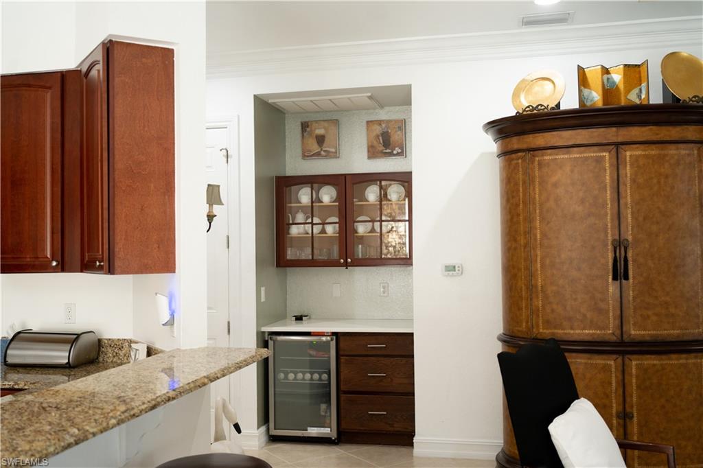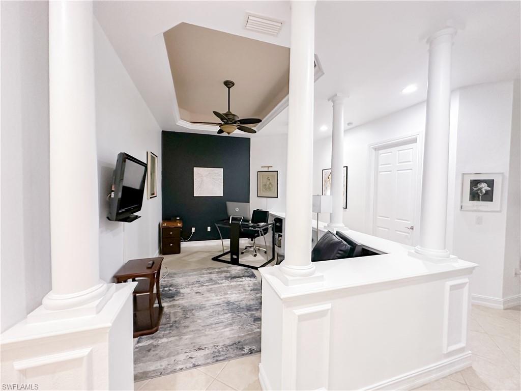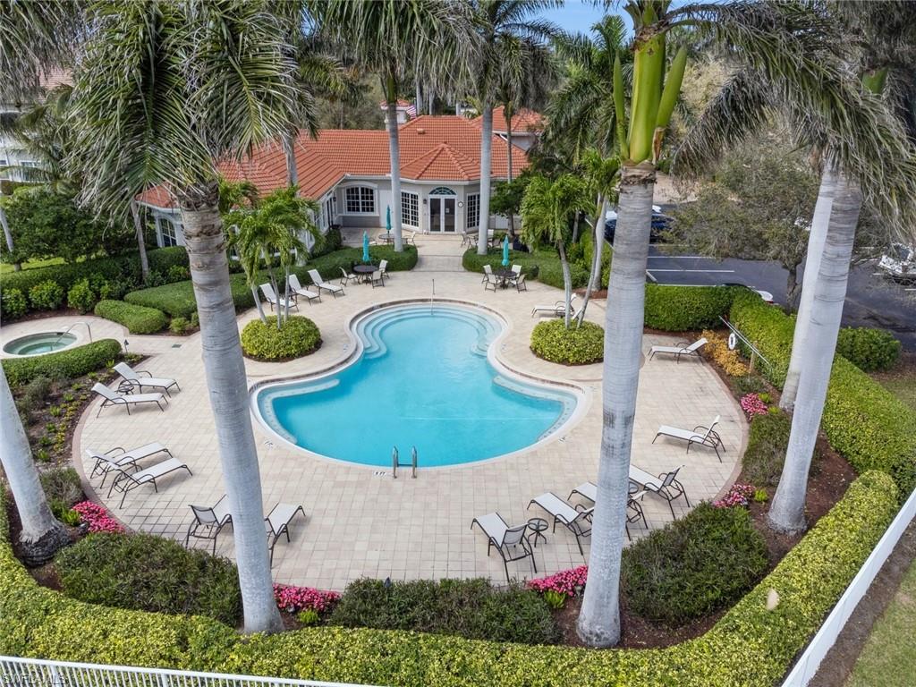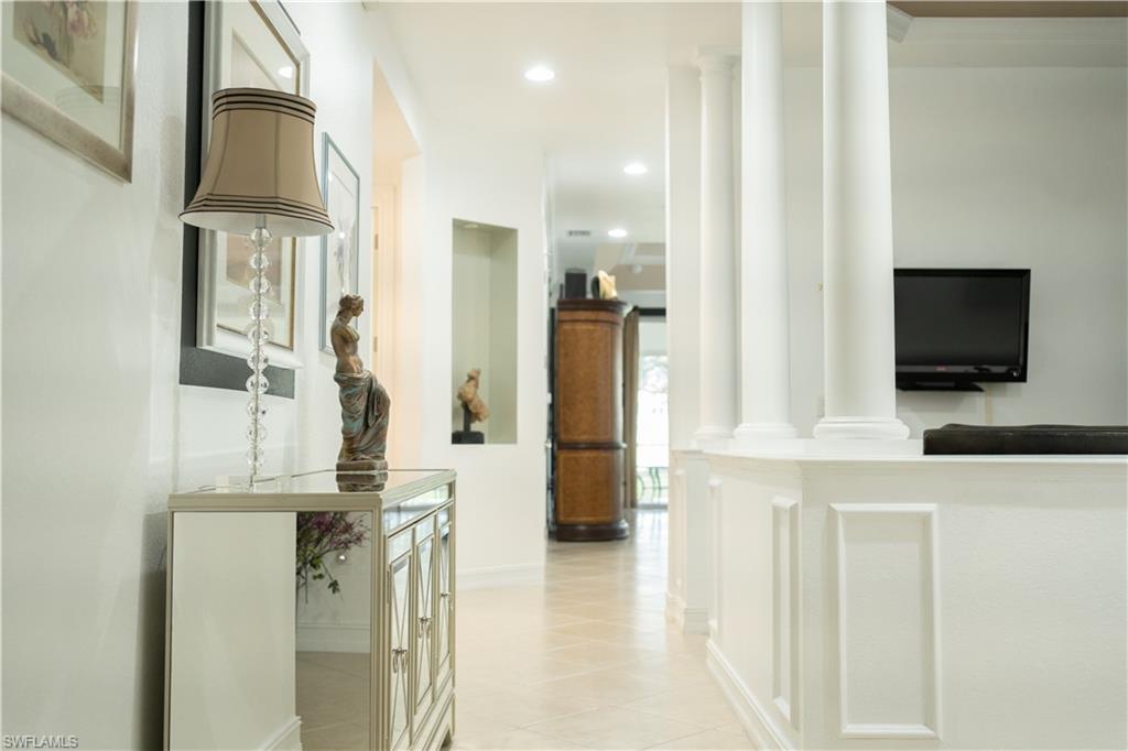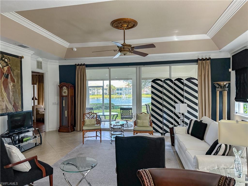 A terrific location for everything Naples has to offer! With an eastern exposure overlooking a lovely lake with three water features, plus having the amenities conveniently located right next door, this home will welcome you to enjoy staying home to relax on the lanai, sun by the pool/spa or work out in the fitness center. There is easy access to reach shopping, dining or getting the sand between your toes as well! This exceptional property boasts 10' ceilings accented with double crown moulding in the main living areas, plus tray ceilings with offset lighting and additional crown moulding! Accents like a medallion in the tray ceiling of the Great Room and Pillars to frame the Dining Room/Den, make this an elegant choice. High impact windows throughout will give you the peace of mind needed for the arrival of any storms, whether your are in residence or up north! A spacious Master Bedroom with custom chandeliers in the Master Bath and closets and a bright morning view each day, is one of three bedrooms, another of which is en suite for your guests privacy. The Open Plan lends itself to an ease of lifestyle that you expect in your Florida home!