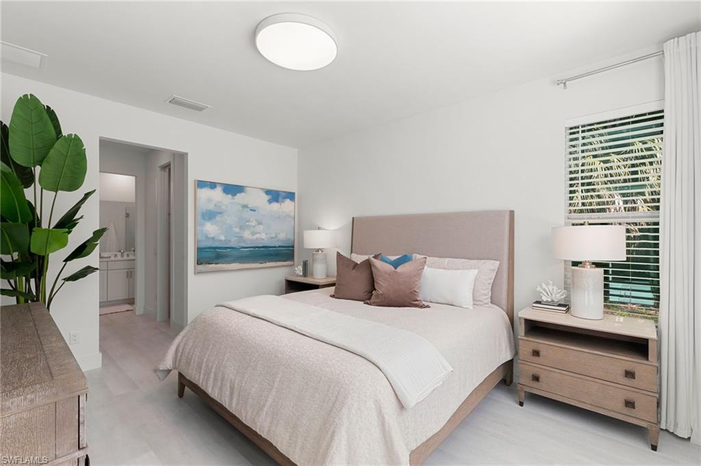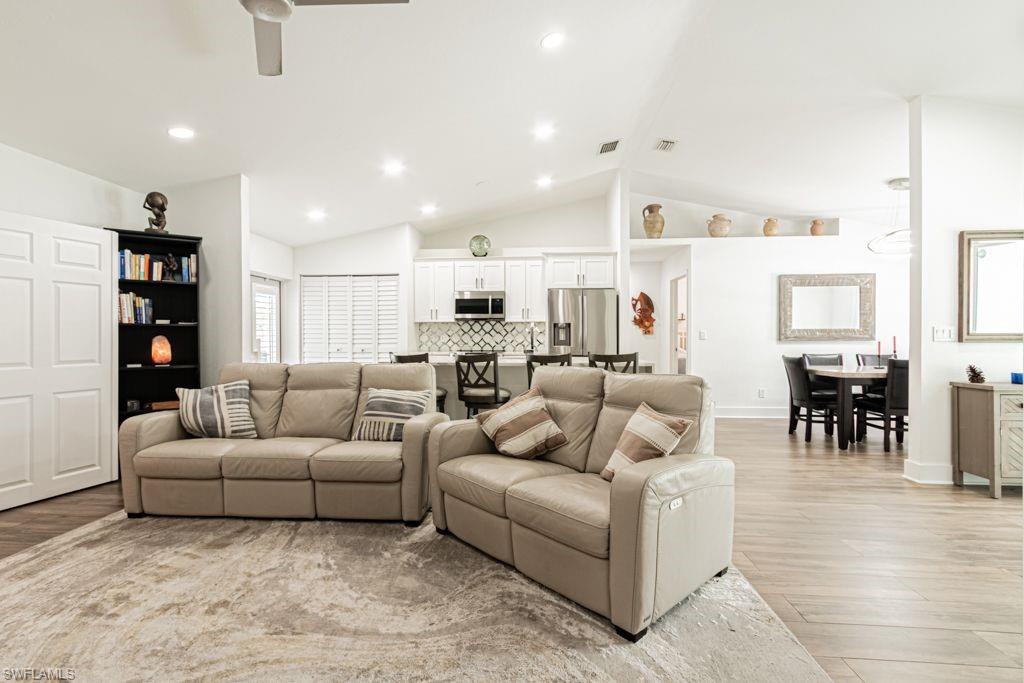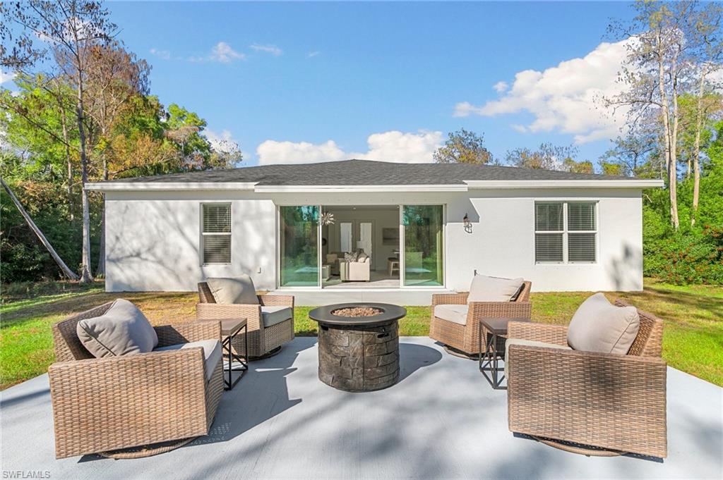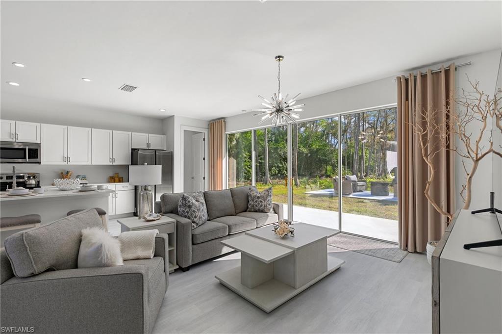Stunning, TURNKEY, 3 bed/2 bath/2 car garage Logan Woods home has the Country feel, with a touch of elegance. This home was built in 2022 and beautifully detailed with neutral gray vinyl plank flooring and elegantly furnished - ready for you to move right in and start enjoying. Enter the great room, with open concept floor plan and bathe in the Florida sunshine streaming through the wall of sliding glass doors with a view of your patio area and large private back yard with room for a pool, guest house or workshop. Sleek kitchen with white cabinetry, white quartz countertops, S/S appliances and an island with seating, plus pantry closet for additional storage. The living/dining area has plenty of room to spread out and entertain or relax and enjoy! Split bedrooms for privacy, owner's suite has 2 large closets, ensuite bath has tiled walk-in shower with glass door, dual sink vanity with quartz countertops. Two additional large bedrooms with ample closet space share a full bath with tiled tub/shower combo, vanity and large linen closet. Laundry room off of the kitchen for convenience, leads out to the 2-car garage with epoxy flooring. A unique point of the home is the private entry to the rear of the property via the access road which adds convenience, or you can simply drive on the side of the home to access the rear portion of the property to store larger vehicles. This home has it all - peace of mind of newer construction, turnkey furnished, no HOA, plus an amazing location just a short drive to Mercato, Waterside Shops, Vanderbilt Beach, Ritz Carlton Tiburon, easy access to I-75 - don't miss out!