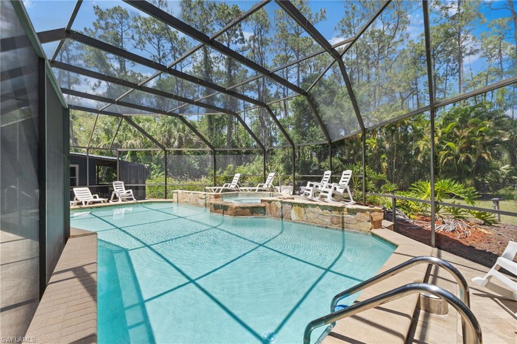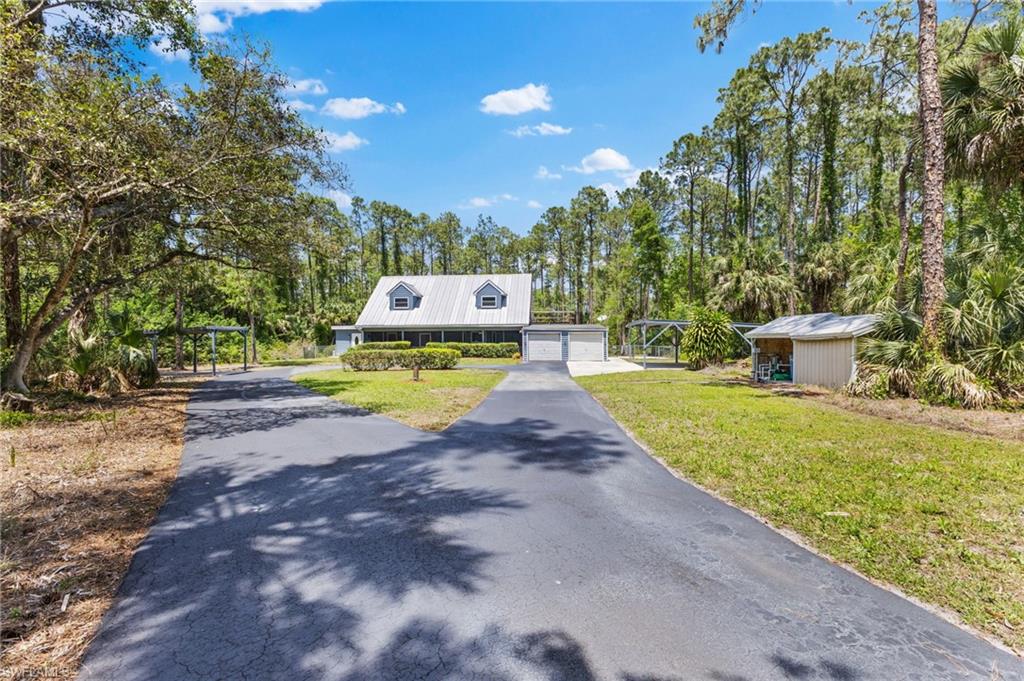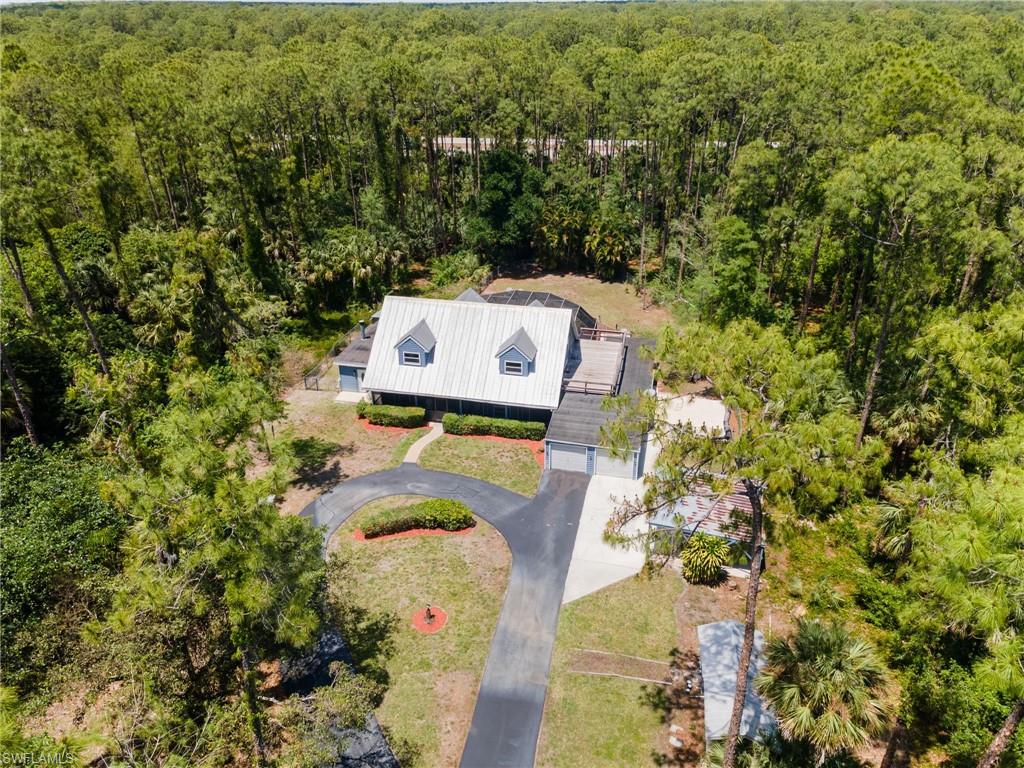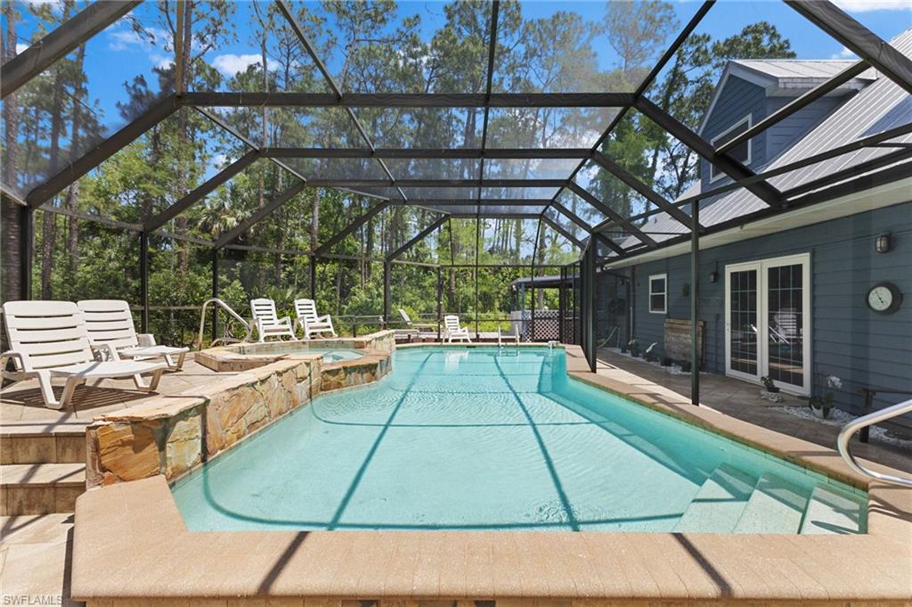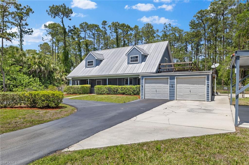 An unbeatable value! Lowest priced 2+ acre pool home in Logan Woods. Experience the timeless charm of this Cape Cod-style pool home, situated on an expansive 2.72-acre lot. Boasting nearly 3,000SF of living space, this home offers 3 bedrooms plus den, 3.5 bathrooms, a large bonus room and a 2-car attached garage. X-FLOOD ZONE does not require flood insurance! The property also features two carports with covered parking space for an additional 3 cars. As you approach the home, a serene driveway lined with mature natural foliage sets the stage for the peaceful lifestyle that awaits. IMPACT WINDOWS AND DOORS AND METAL ROOF for complete peace of mind and storm protection. The oversized bonus room provides plenty of space for entertaining at the cedar wood-planked bar and billiards area or unwind in front of the wood burning fireplace. Soak up the sun around the expansive screened-in outdoor space featuring a large, heated pool and spa, stone fountain feature, brick pavers and ample seating areas. The spacious primary bedroom features an ensuite bath with seating area and office while also offering its own private walk-out balcony. Brazilian cherry wood floors plank the upstairs areas, while tile and wood can be found throughout the remaining parts of the home. Other notable upgrades include a tankless hot water heater, 80-gallon propane tank that heats the spa, 2008 septic tank and drainfield, resilient cedar wood siding, laundry room in the residence, partial fencing around property, multi-zone irrigation system and whole-home water softener system. Enjoy the serene privacy and freedom of your own private land all while still being in the center of town and minutes away from all that Naples has to offer. Located just 10 minutes from Naples' pristine beaches and 15 minutes from downtown, this property is a rare find for those seeking both convenience and tranquility.
