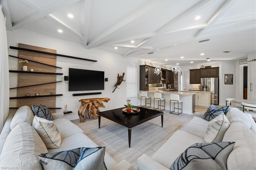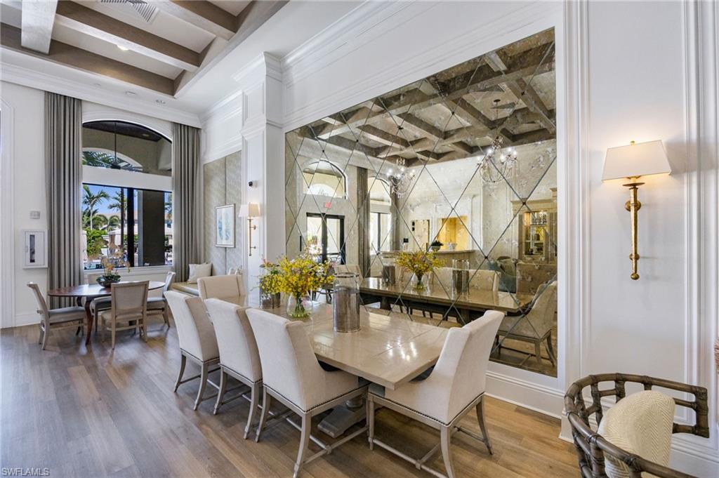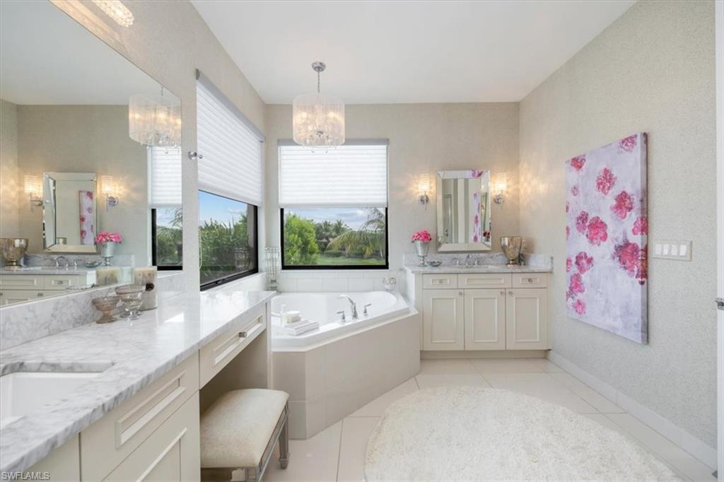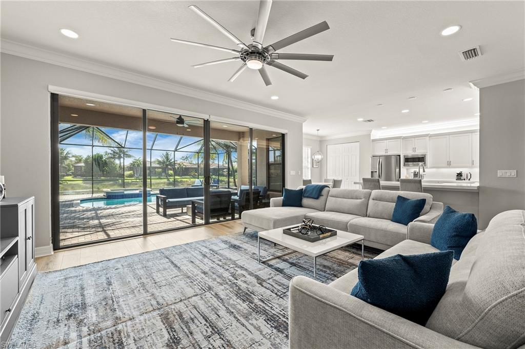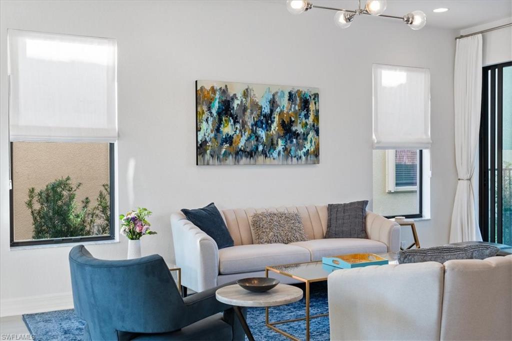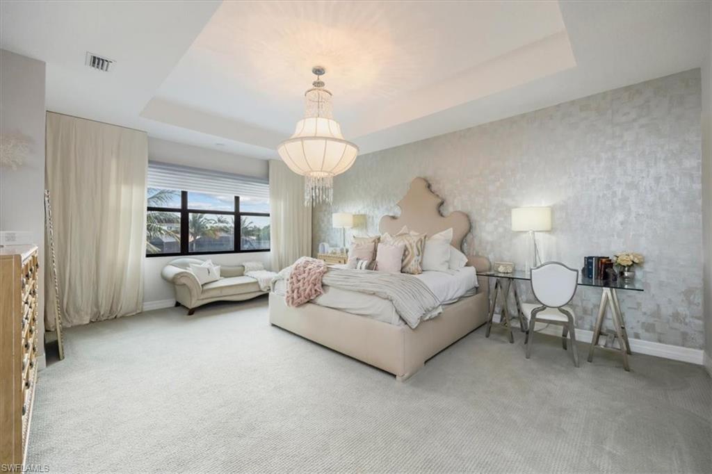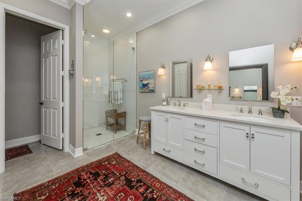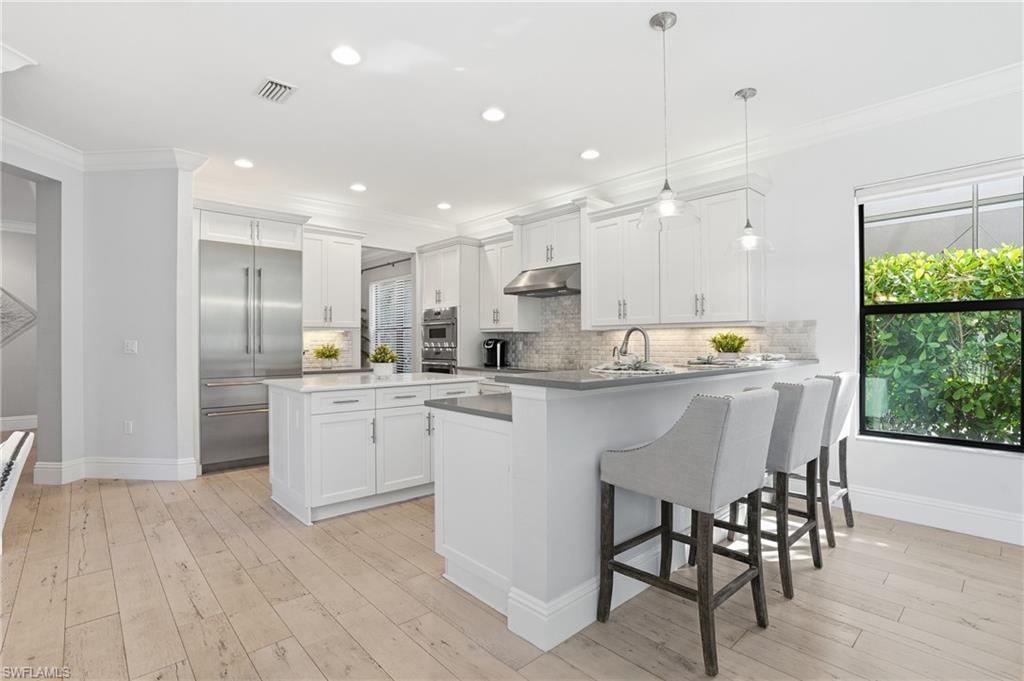 Professionally curated by Design West with over $300,000 in upgrades, this home showcases quality and style with custom coffered ceilings, elegant lighting, and premium finishes throughout. The open-concept layout blends everyday comfort with an entertainer’s flair featuring a custom media wall, and a built-in bar with wine cooler. There is meticulous attention to detail in the wall coverings, blinds and draperies which highlight the natural light and space. The kitchen offers quartz countertops, high-end appliances, and custom cabinetry with built-in pantry, and roll out drawers for smart, stylish storage. Every detail speaks to high end craftsmanship, from extensive woodwork around windows, doors, and mirrors, deep baseboards, crown molding, and intricate custom ceiling woodwork that elevate the entire space. All closets have been custom built as well. The owner’s suite is a true retreat with its custom ceiling and wall treatments. There are two fully built-out closets and a spacious spa-inspired bathroom that invites relaxation. Each guest suite enjoys its own private bath and wing for privacy. Throughout the home, custom window treatments—including silhouette shades and elegant drapery add warmth and privacy. All the bedrooms have remote powered blackout blinds. Step outside to a serene oasis with lush landscaping, a saltwater pool with a tranquil fountain, and a spacious covered lanai—perfect for year-round dining and entertaining. A whole house generator with 500 gallon propane tank, impact-rated windows and StormSmart hurricane screens provide peace of mind, while the epoxy-coated garage floor with built-in storage completes this one-of-a-kind offering. Marbella Isles offers world-class amenities and is conveniently located in the heart of Naples, in a great school district, just minutes from beaches, shopping, and downtown. Amenities include active pickleball & tennis programs, bocce courts, a resort-style pool, separate pool & play area for kids, world-class clubhouse with a fitness center, half-court basketball, & kitchen and games rooms. The community is meticulously maintained, has a solid HOA board and strong cash reserves.